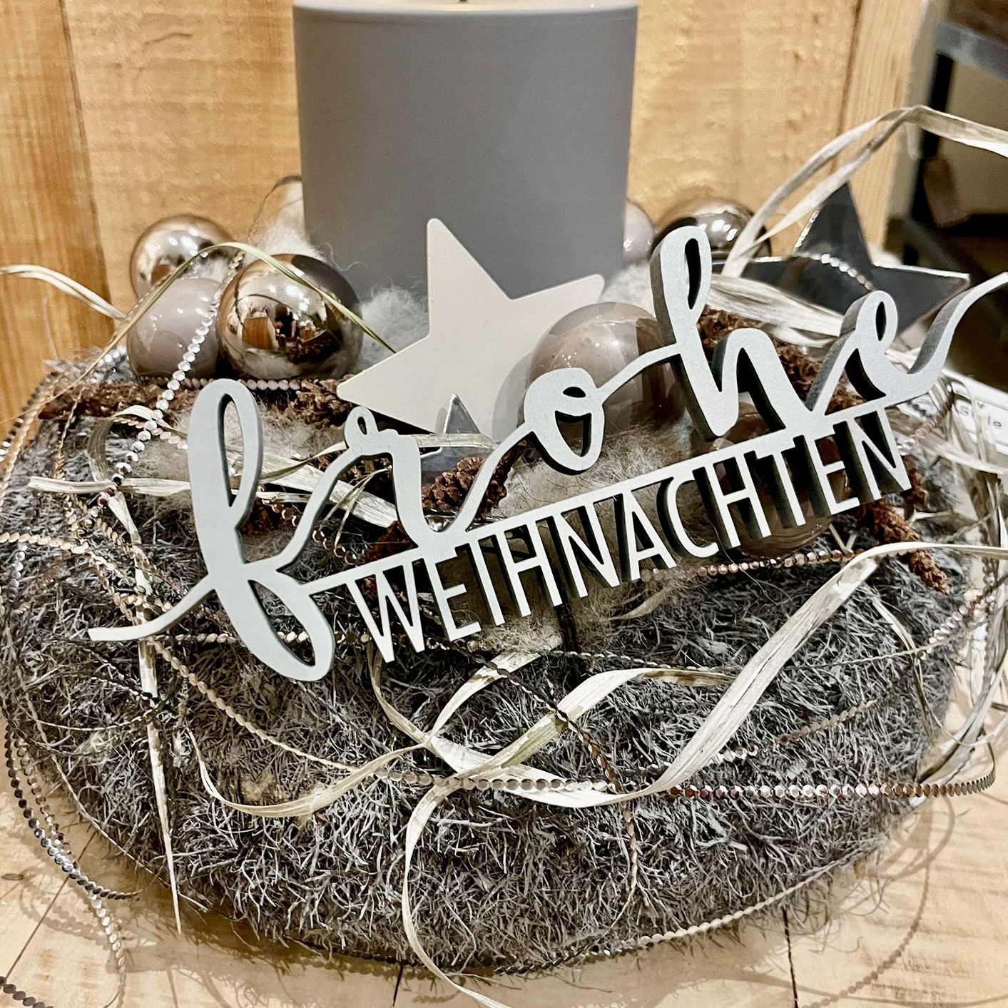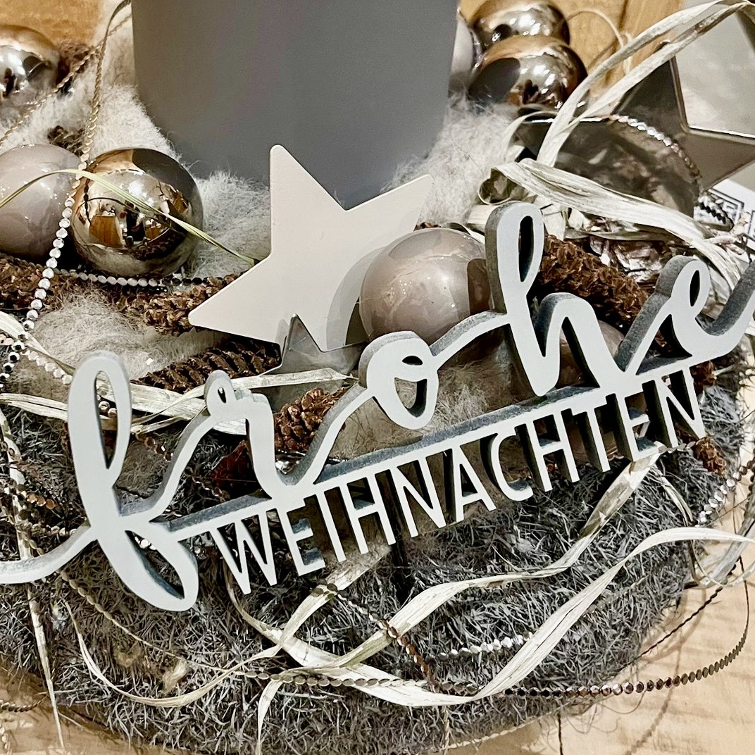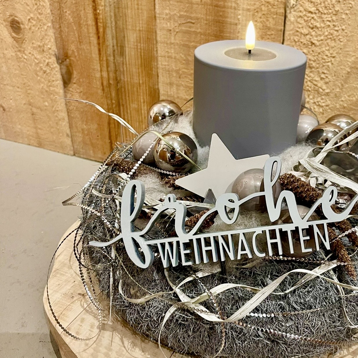 Kokoskranz in Grau mit Zapfen und Gräsern, Glaskugeln in Grau und Silber, Luntewolle in Grau meliert, Metallsternen in verschiedenen Größen in Grau und Silber, LED Kerze in Grau, Schriftzug "frohe Weihnachten" in Grau auf einem Holztablett in Natur.