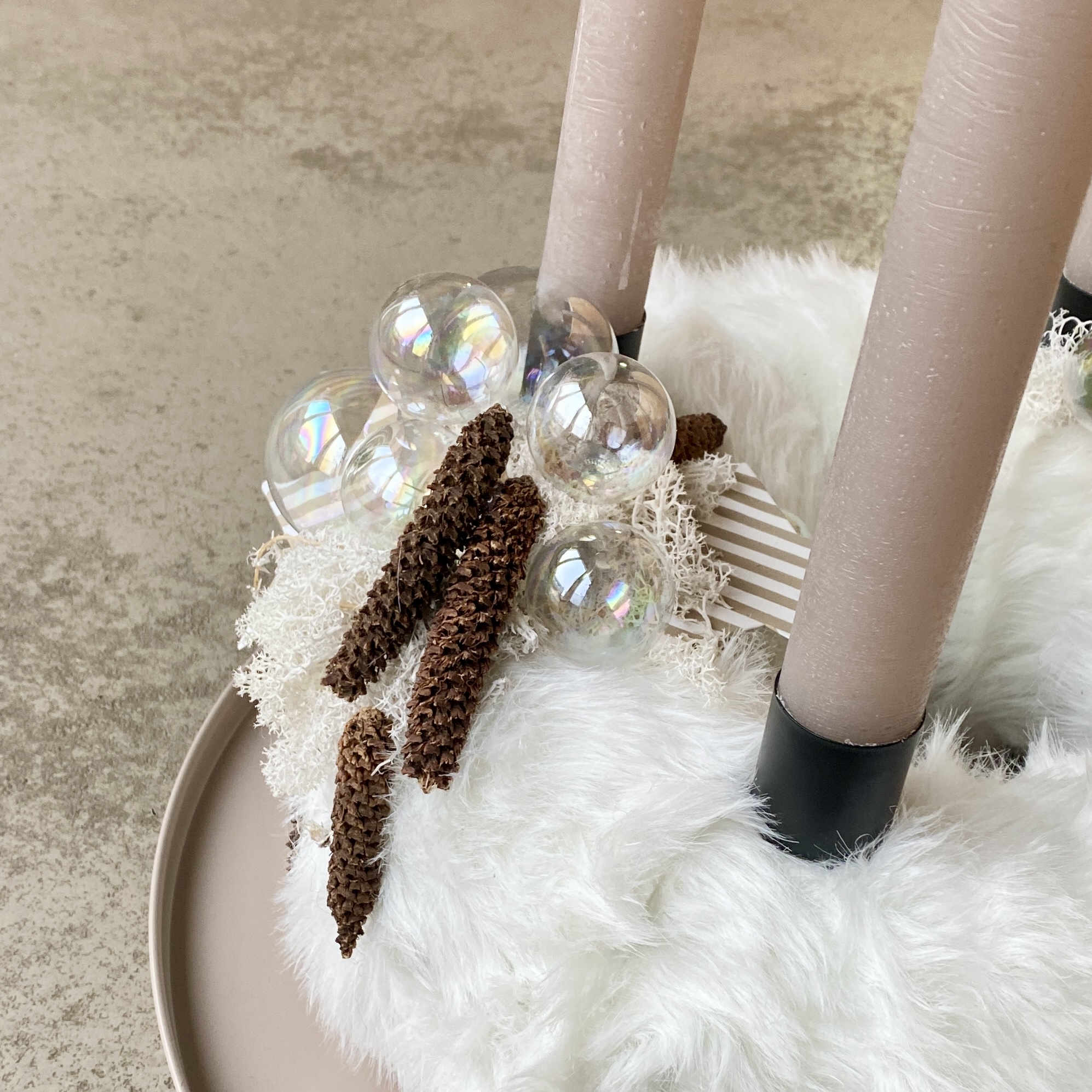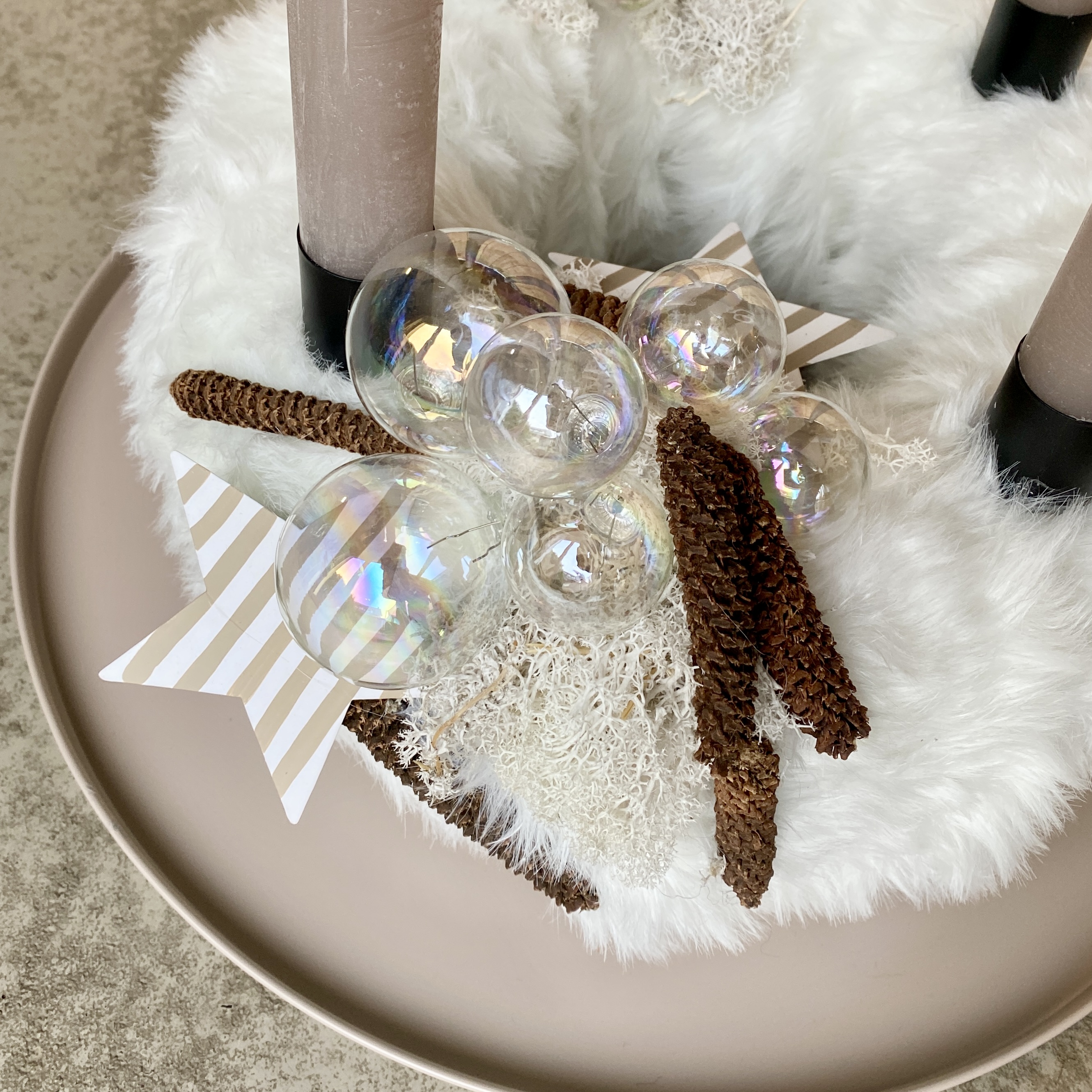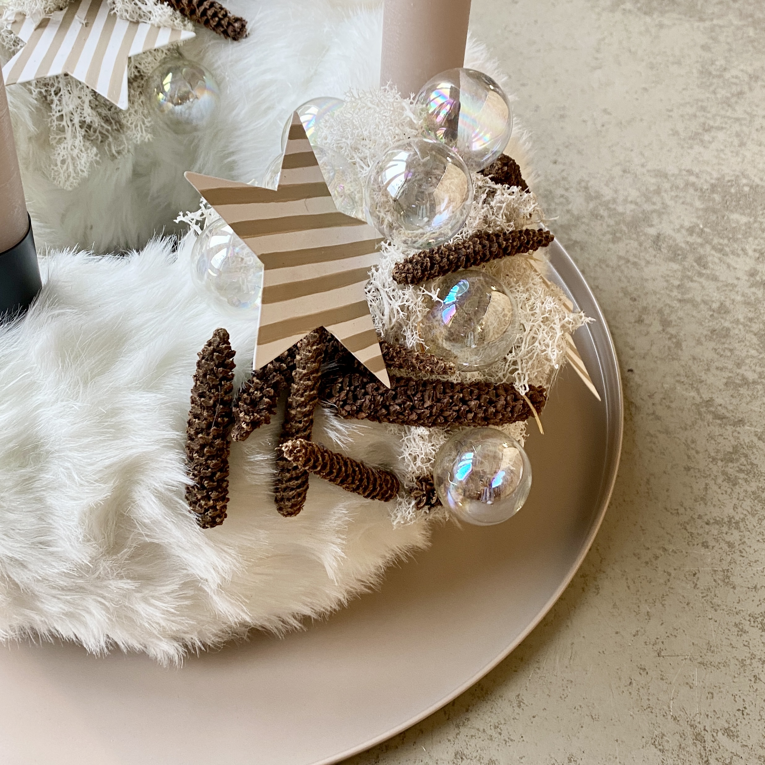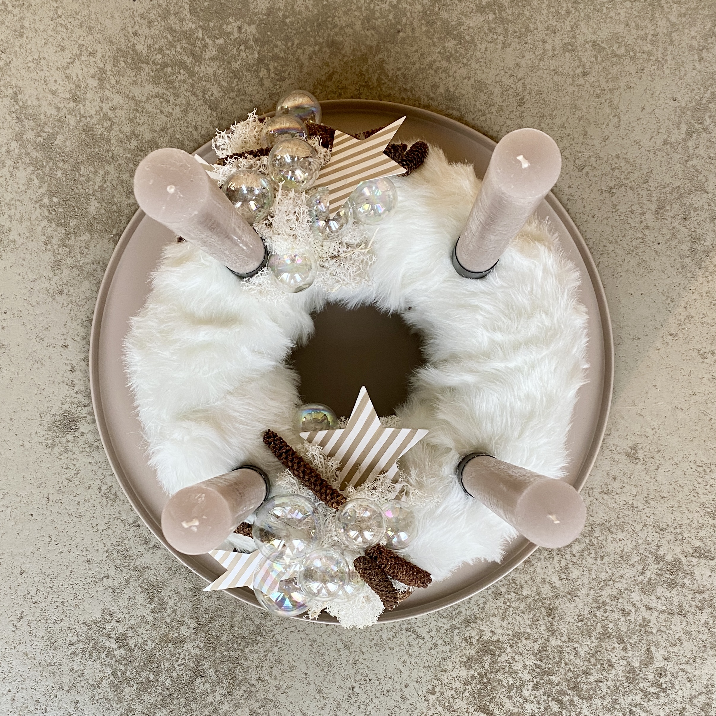 Großer Adventskranz in winterlicher Stimmung! Kunstfellkranz, Island-Moos gebleicht, Zapfen, vier Metall-Sterne gestreift, diverse Glaskugeln und vier Kerzenstecker mit passenden Stabkerzen D3cm gehören zu dieser Gestaltung.