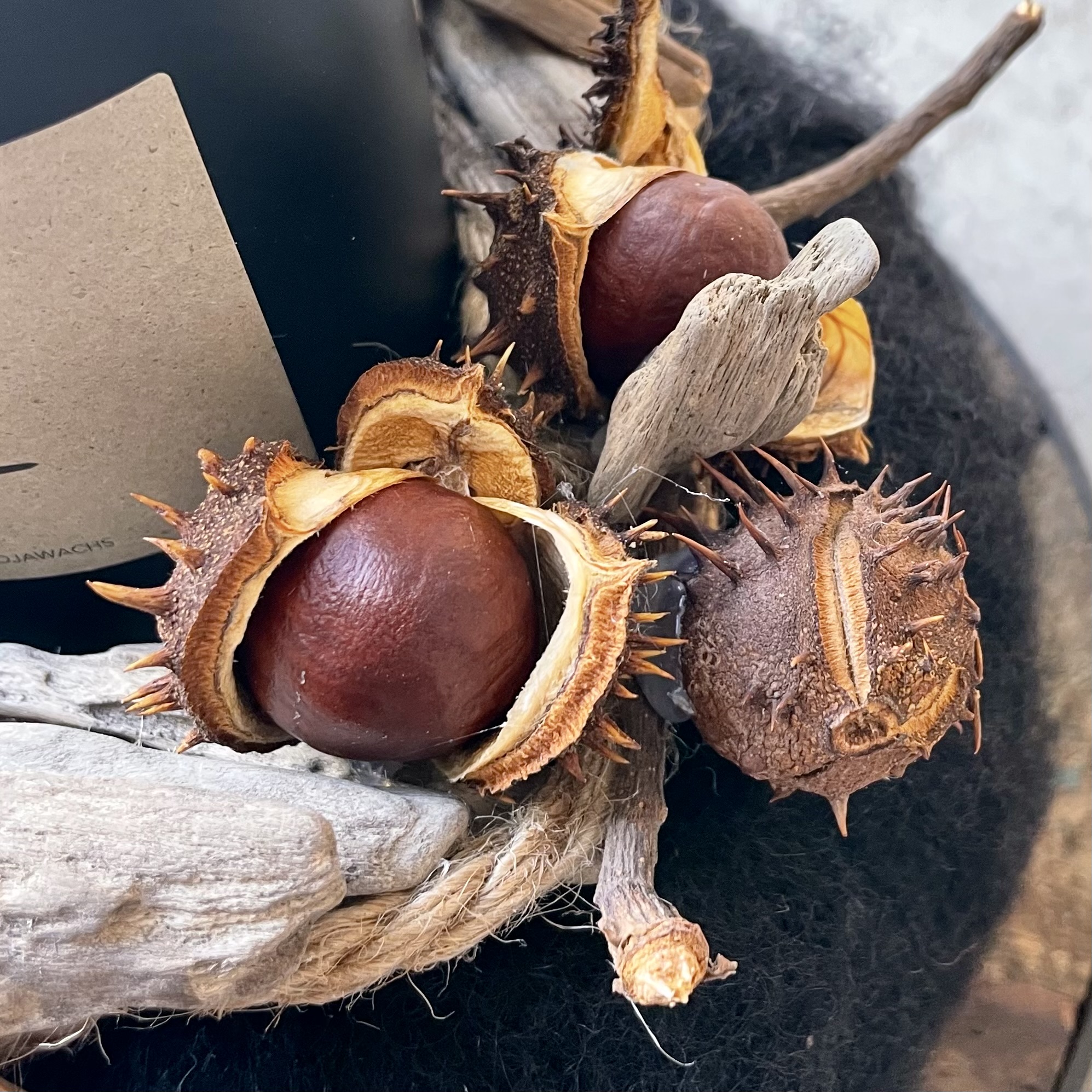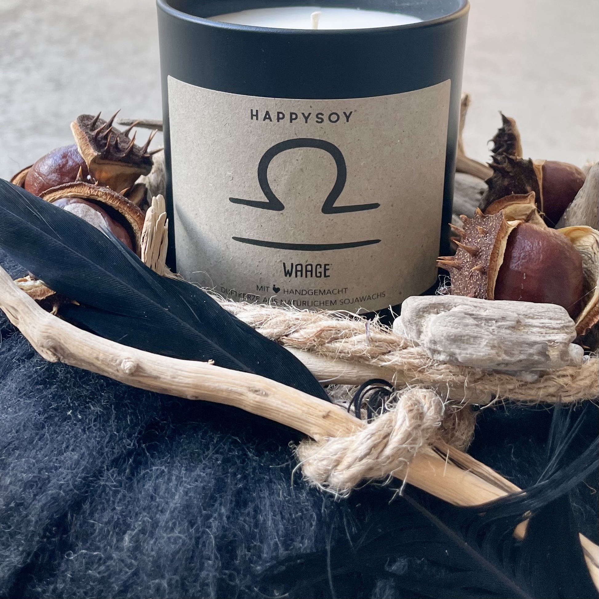 Rundes Altholztablett Sternzeichen "Waage" herbstlich dekoriert mit Kastanien, Treibholz, Lehnerwolle-Kranz, einer Feder, Juteband und einer Duftkerze (duftet nach dem einzigartigen Hausduft Miaflora des Herstellers. 100 % natürliches Sojawachs – ohne Gentechnik, vegan & umweltfreundlich, Handgemacht in der Münchner Manufaktur).