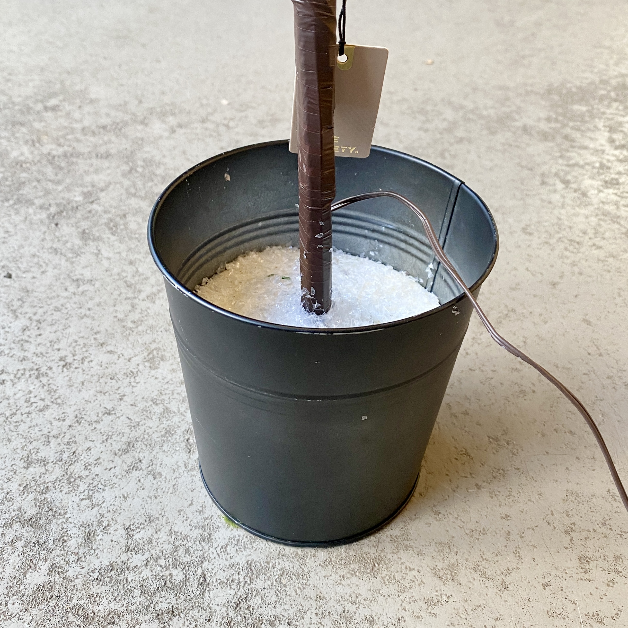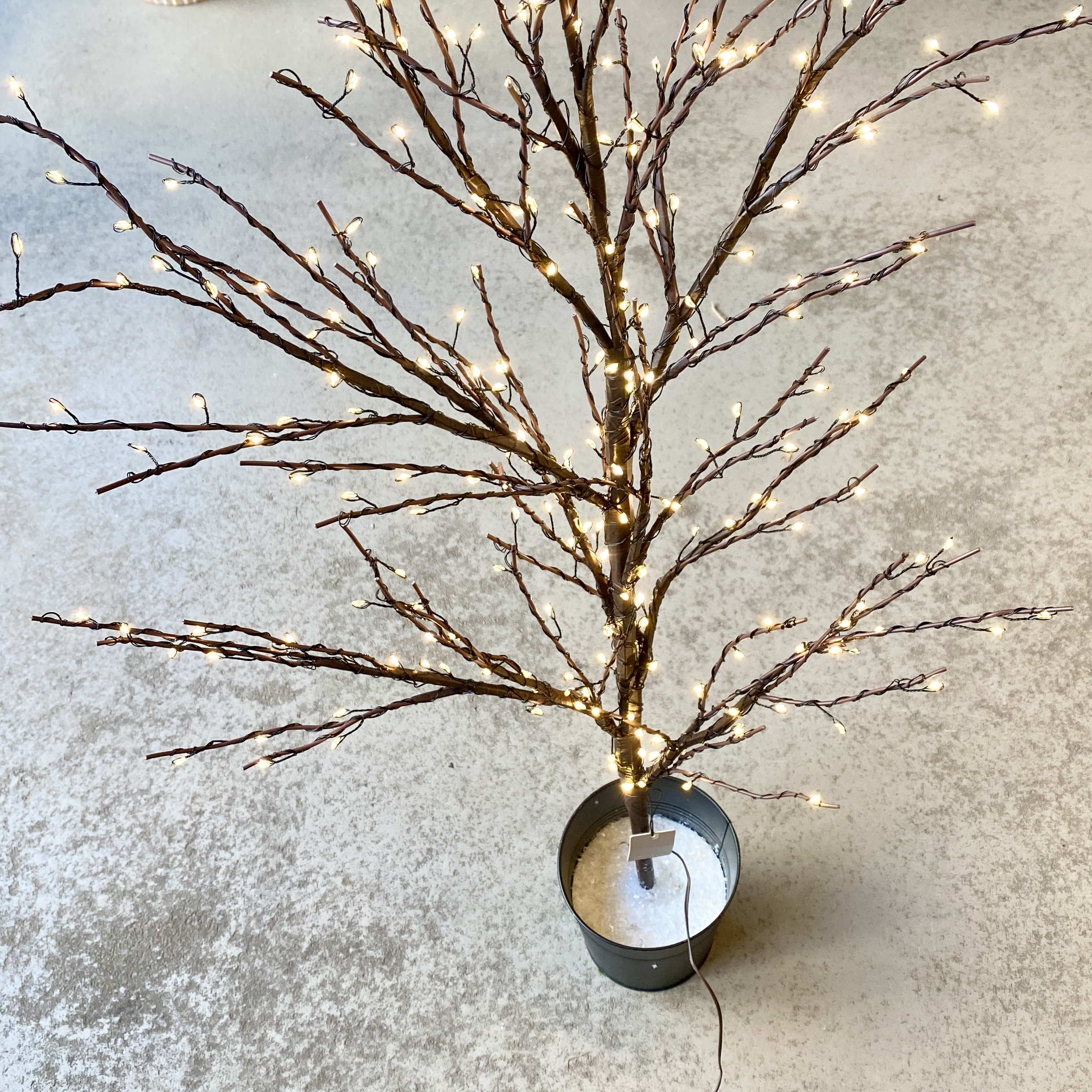 Künstlicher Baum aus Draht mit LED Lichtern in Dunkelbraun, im Topf in Schwarz. Geeignet für Innenbereiche.