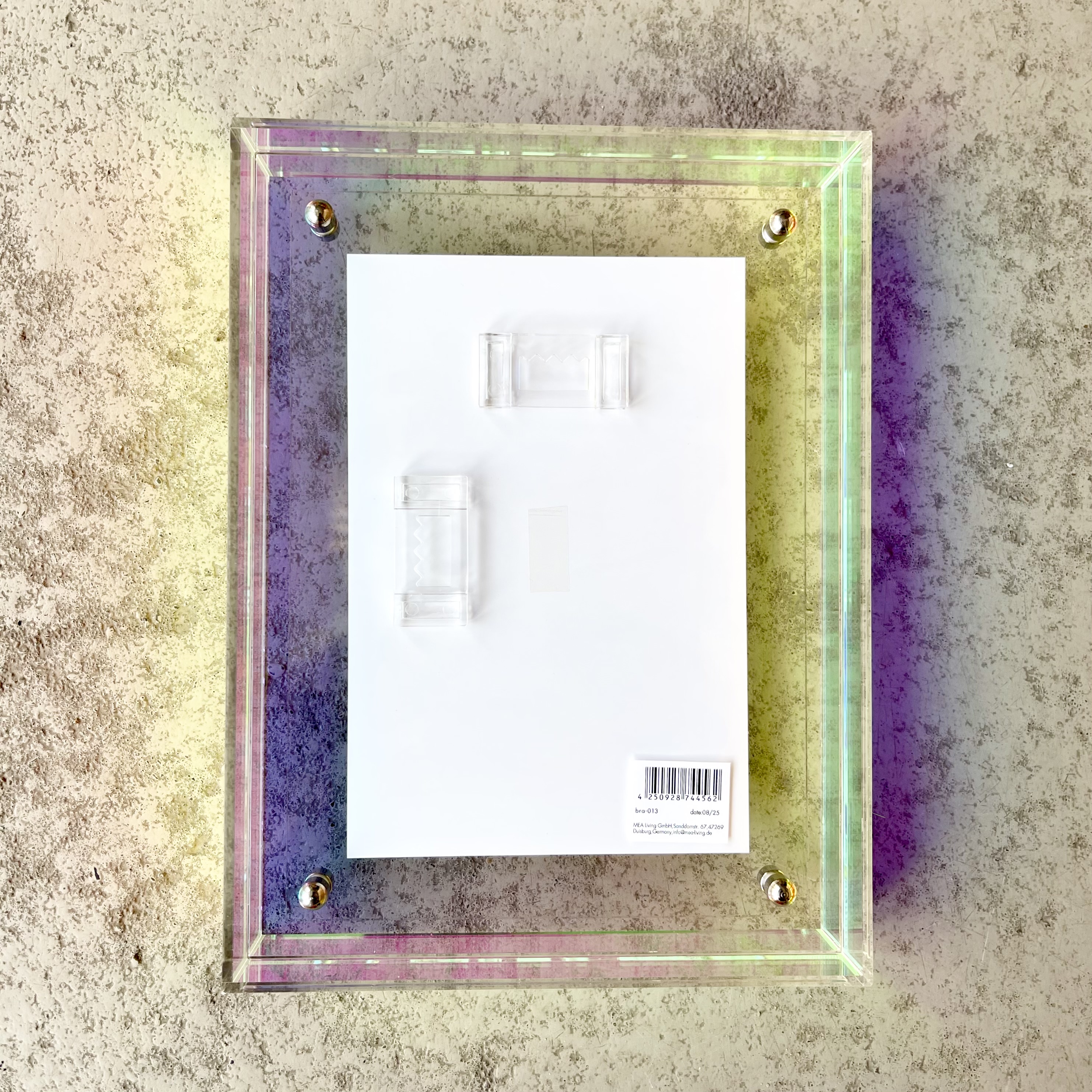Bilderrahmen aus Acryl in irisierender Optik, passt perfekt zu unseren witzigen Postkartenmotiven.