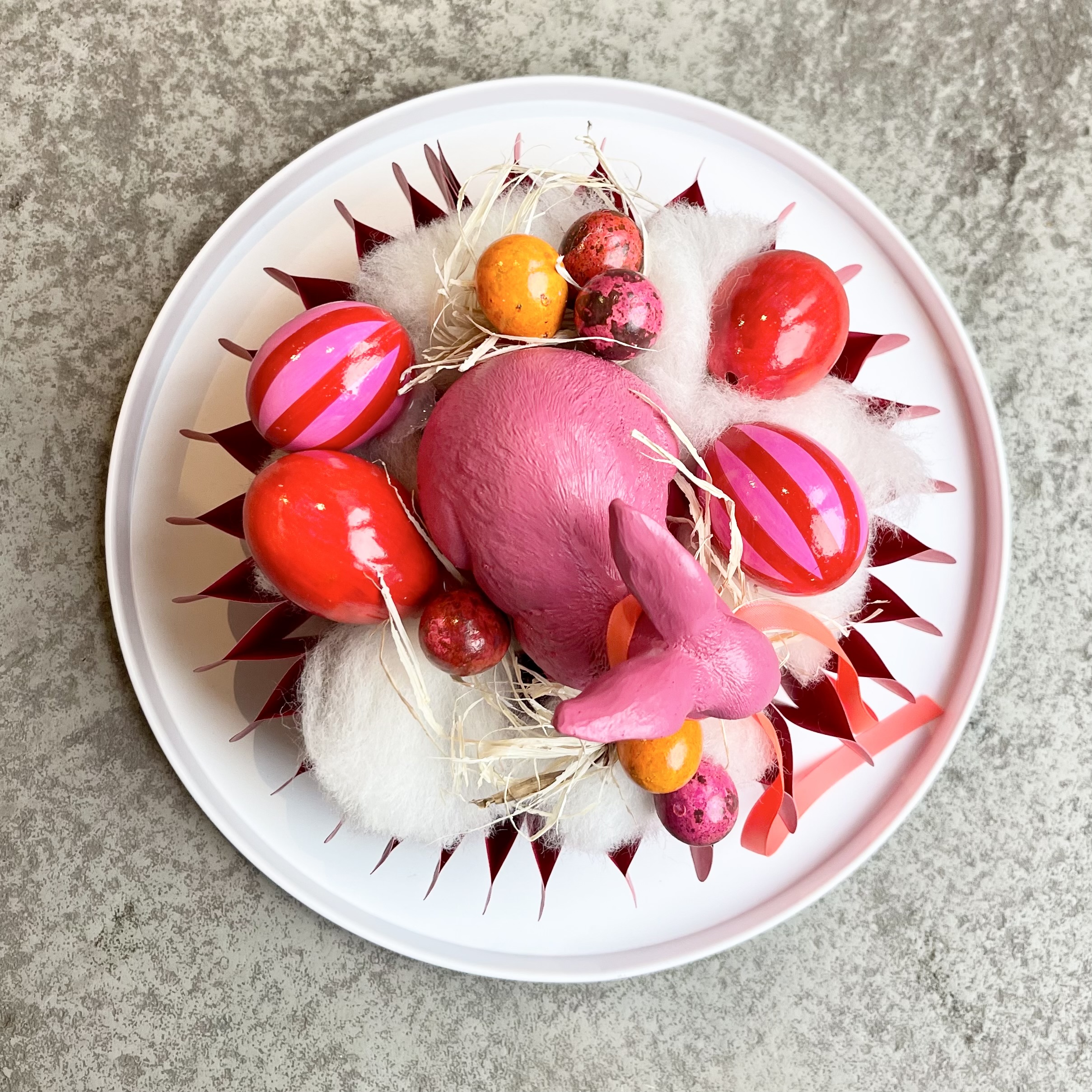 Cooles Osternest, Pap. Sockel Dacia pink, pink Hase, Eier gestreift, passende Wachteleier in Wolllunte gelegt,