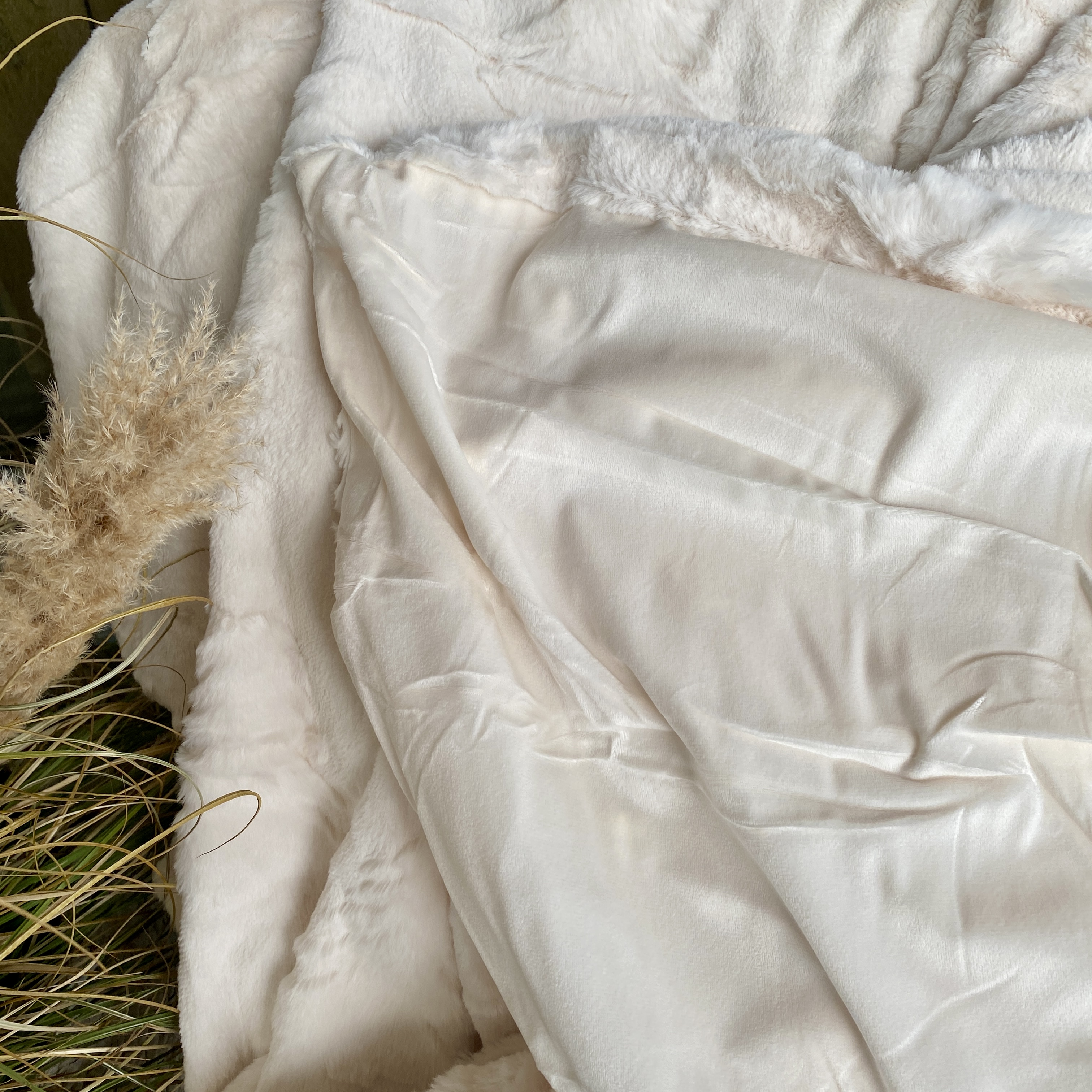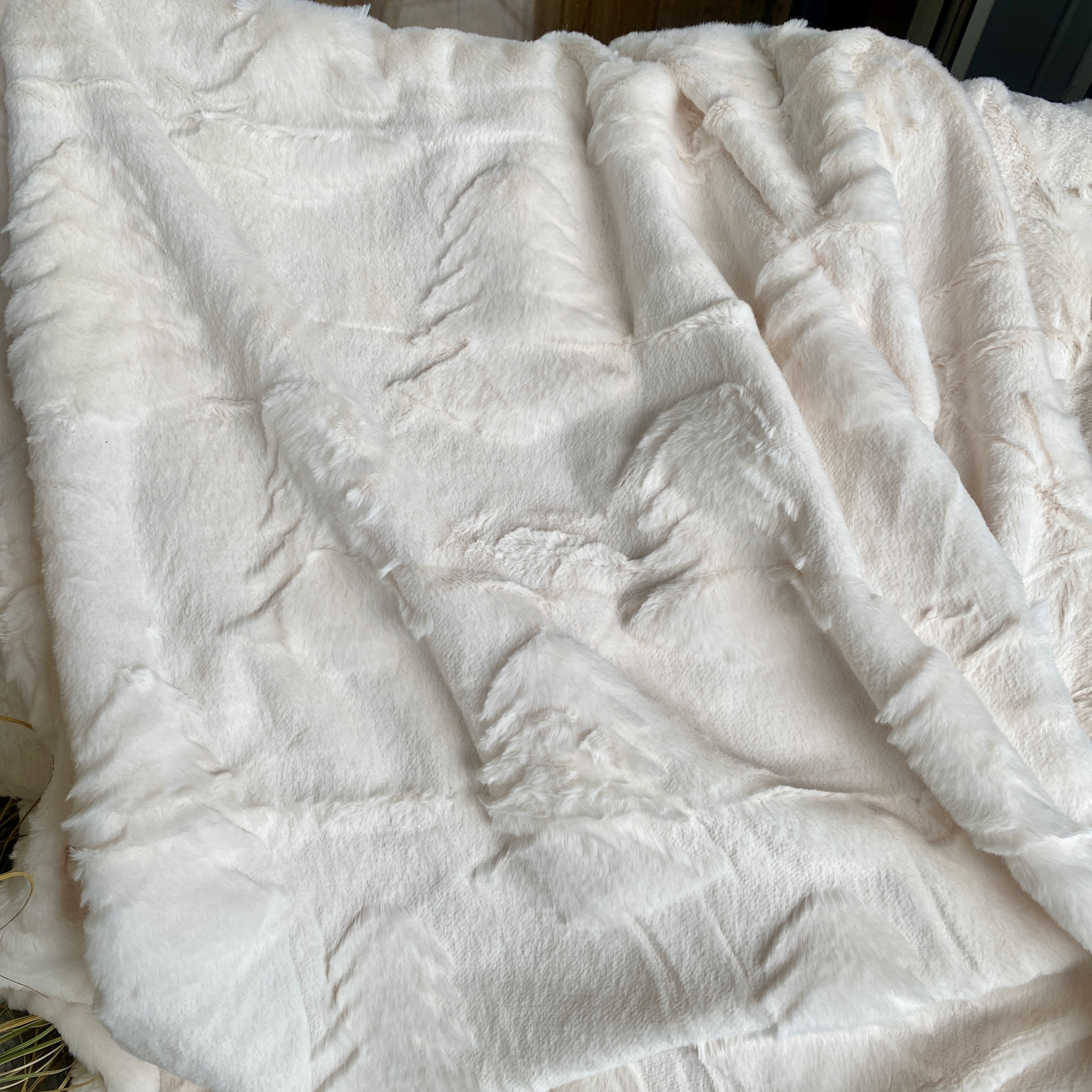 Weihnachtlicher Soft Plaid in gebrochenem Weiß mit eingearbeiteten Tannenbäumen. 130cm x 170cm, 100% Polyester