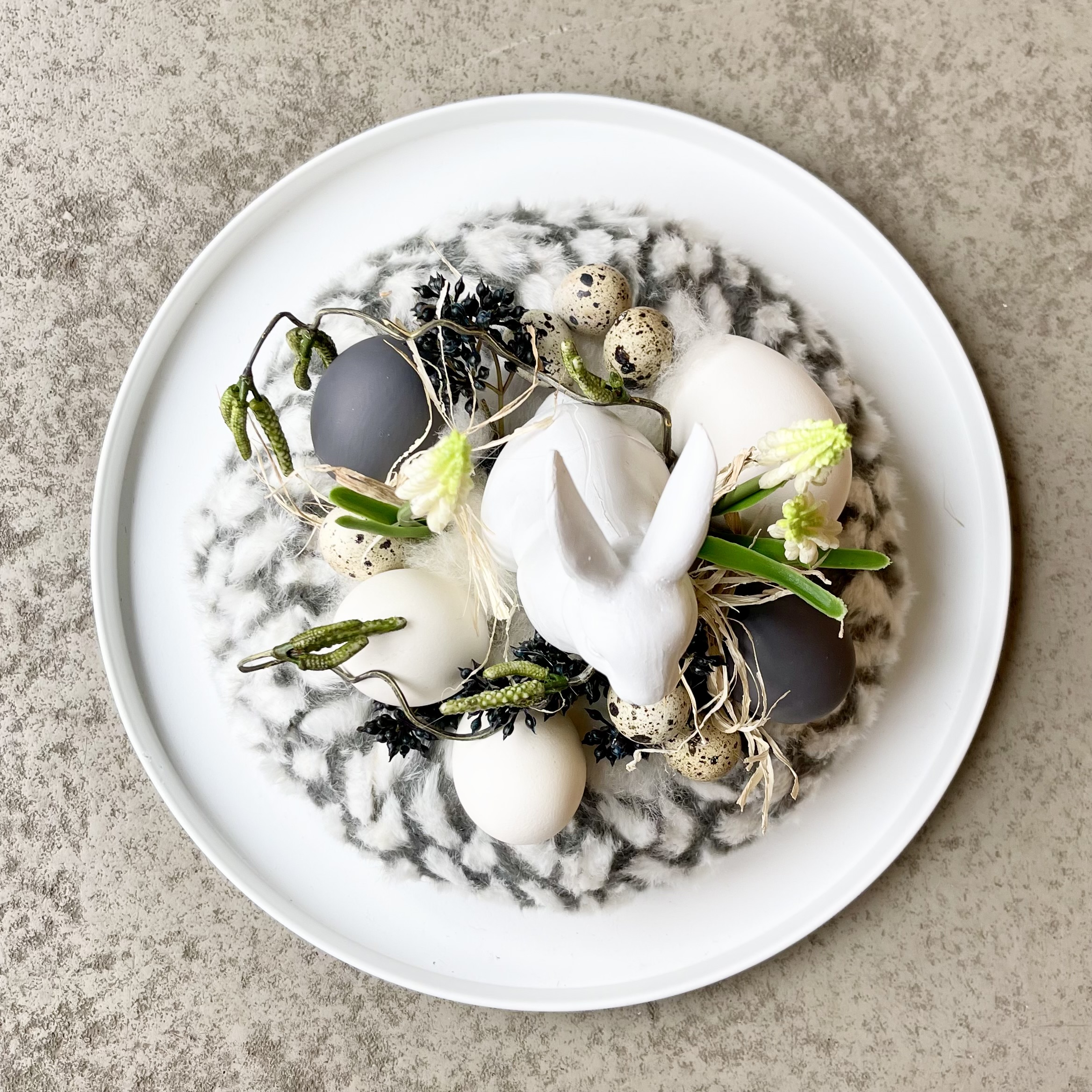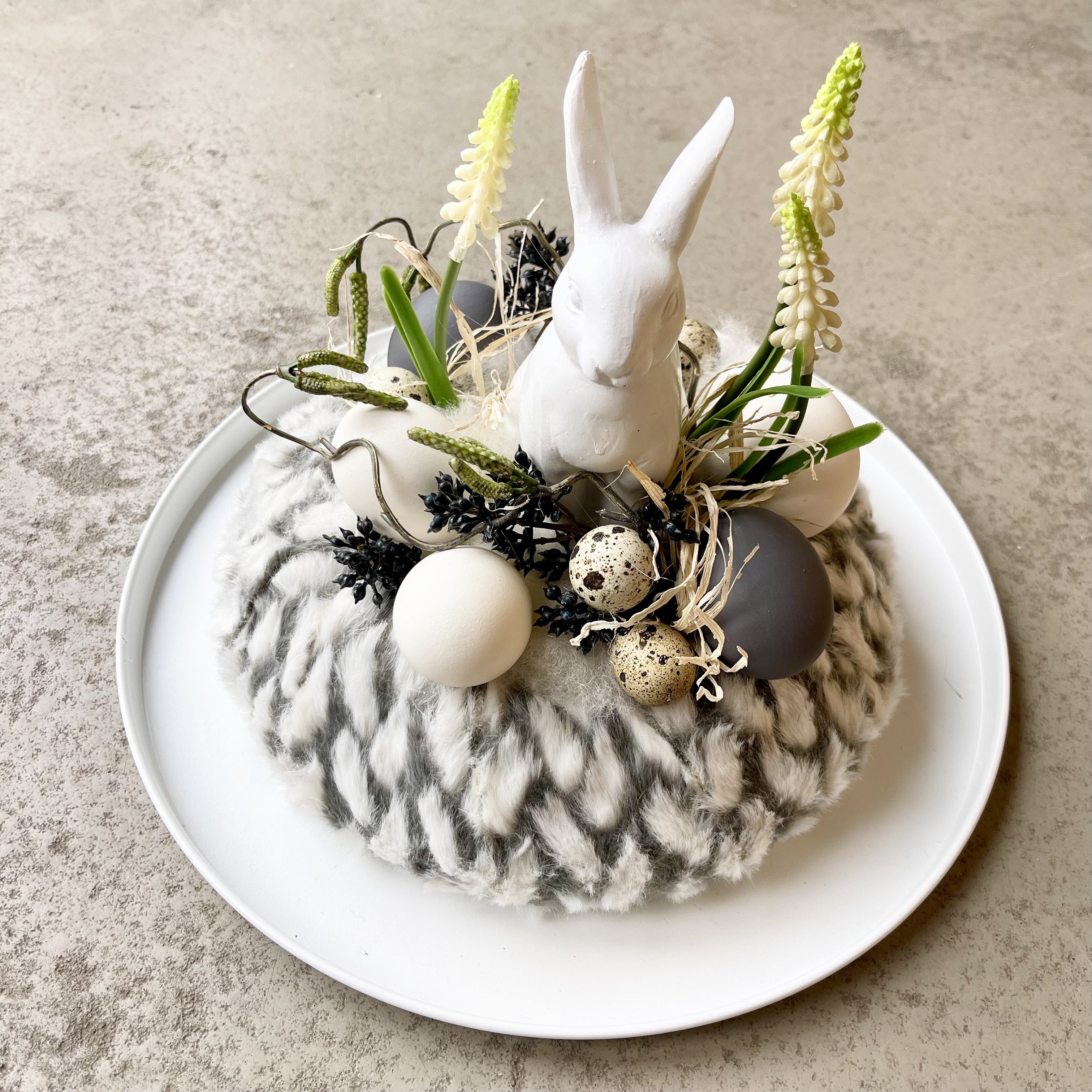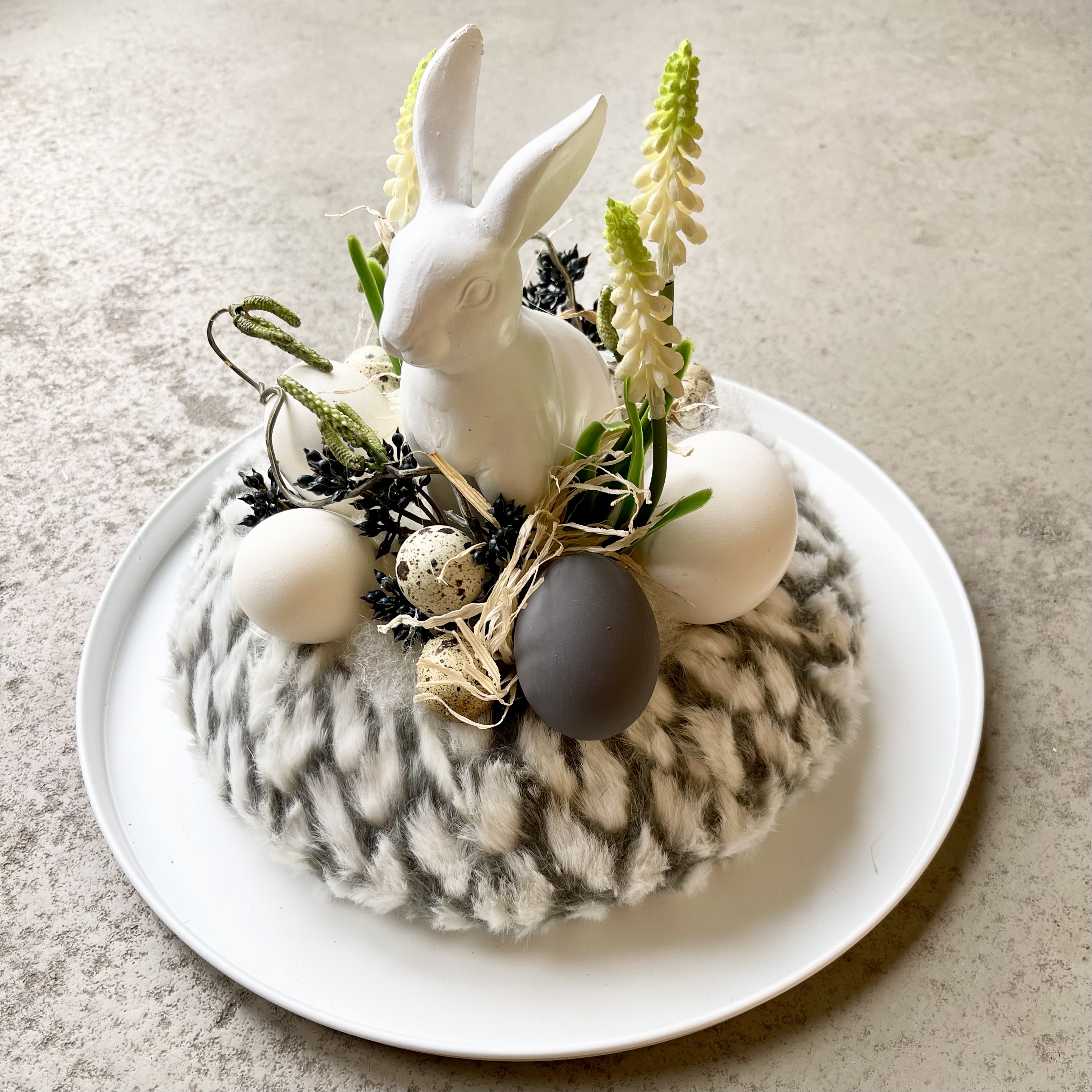 Schnuckeliges Hasennest, grau weißer Kunstfell-Kanz, weißer Hase, umgarnt von Eiern und Federn.