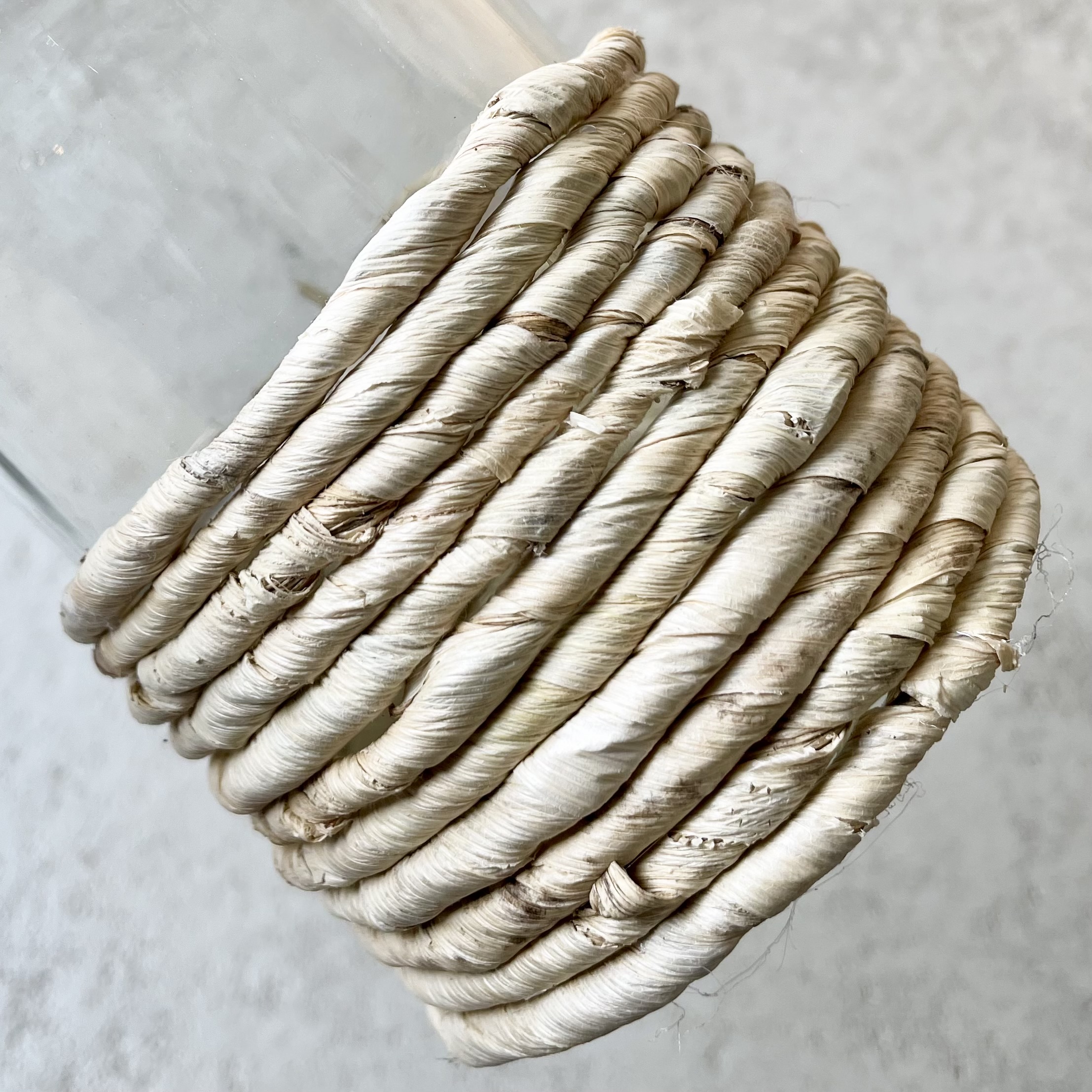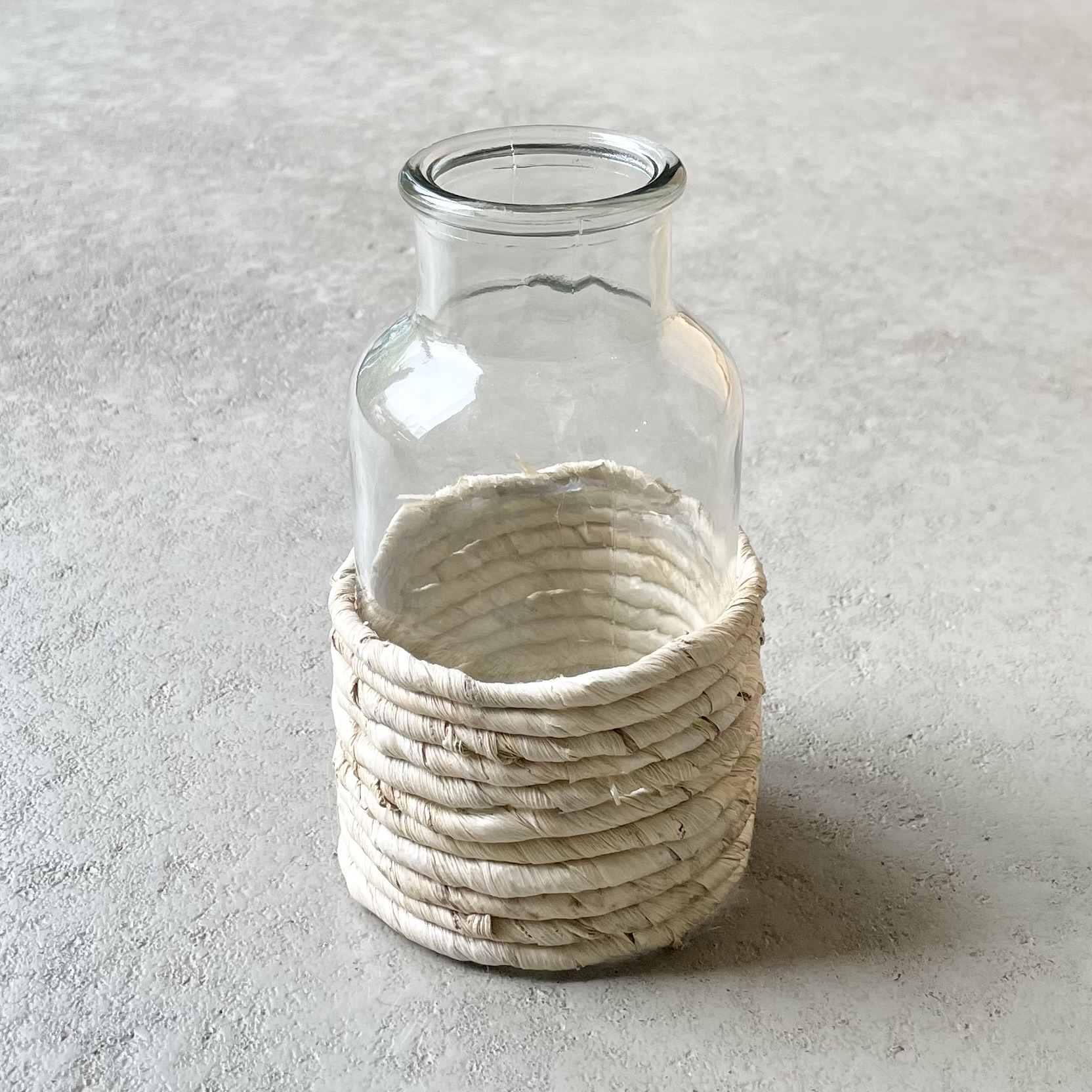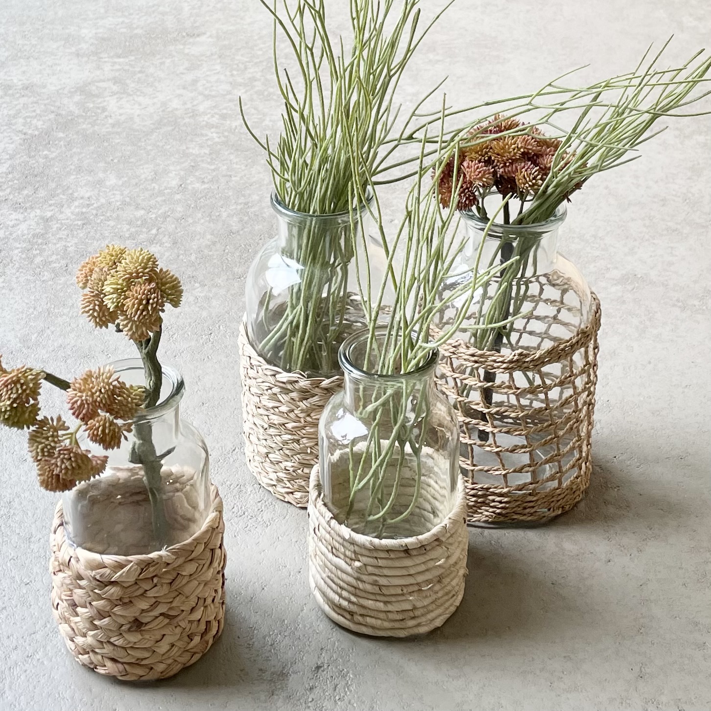 Klein Vase/Flasche für deine Sommertafel. Pressglas umwickelt mit Seegras.