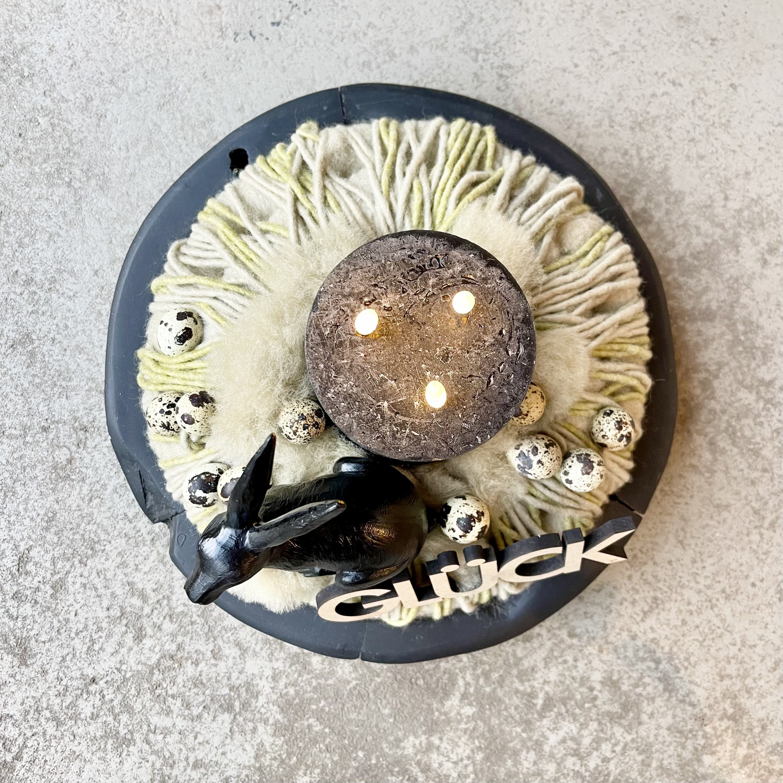 Schriftzug Glück, kleine Wachteleier in Natur und eine Dreidochtkerze gehören zu dieser Gestaltung.