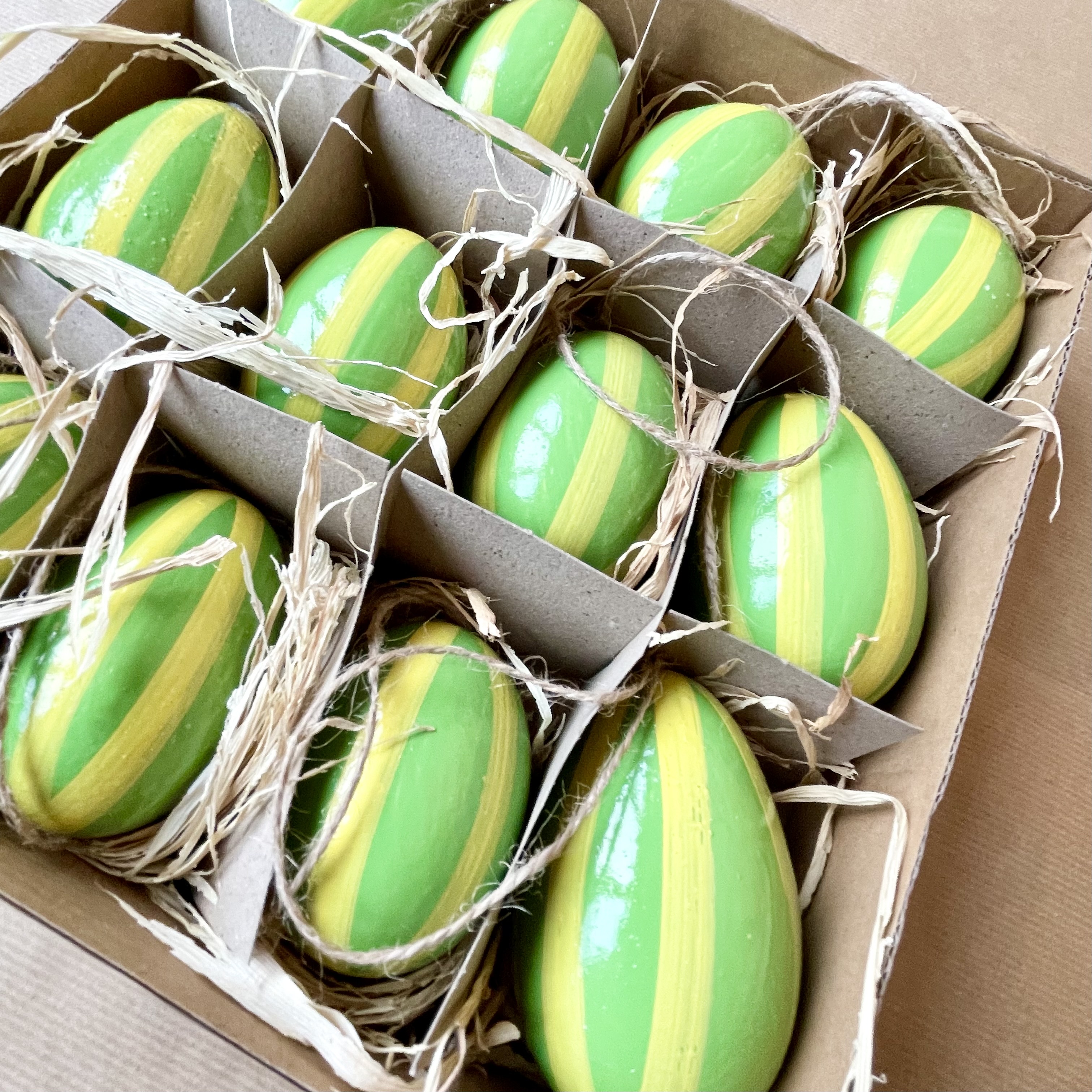 12 Gänseeier, so bunt gestreift wie das Leben, modern lackiert bringen sie die gewünschte Frische in dein