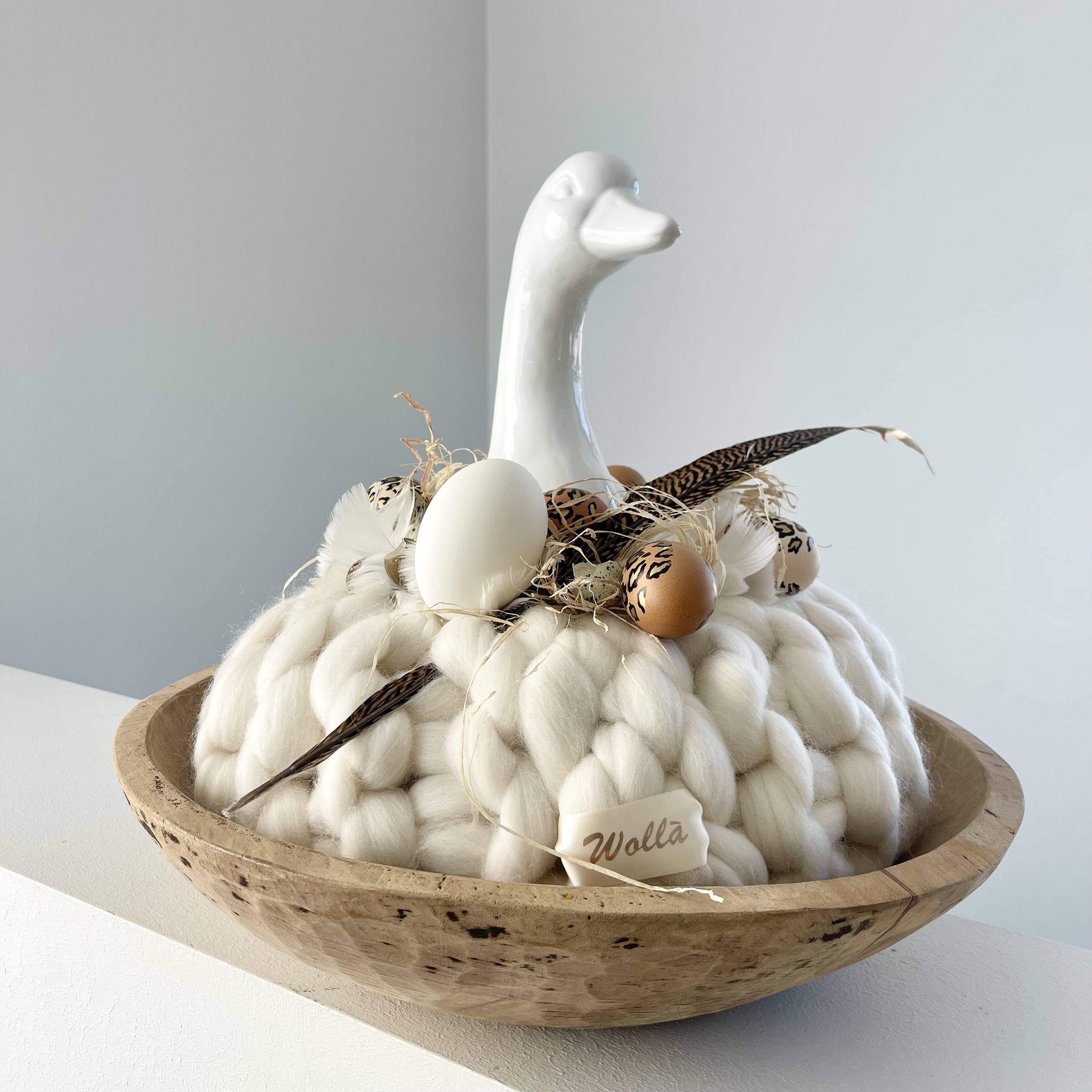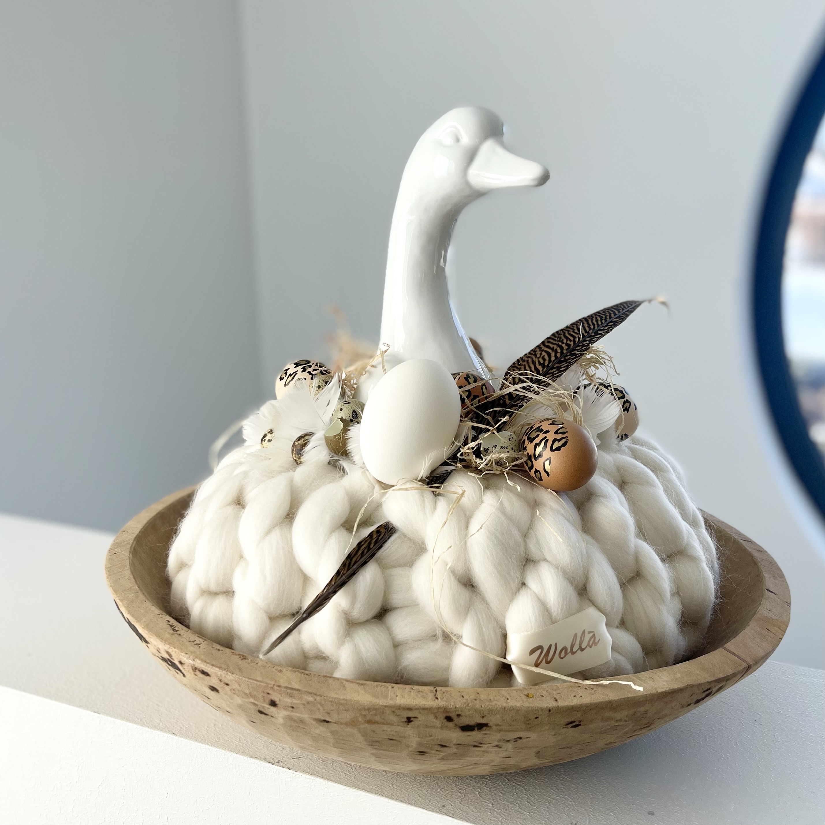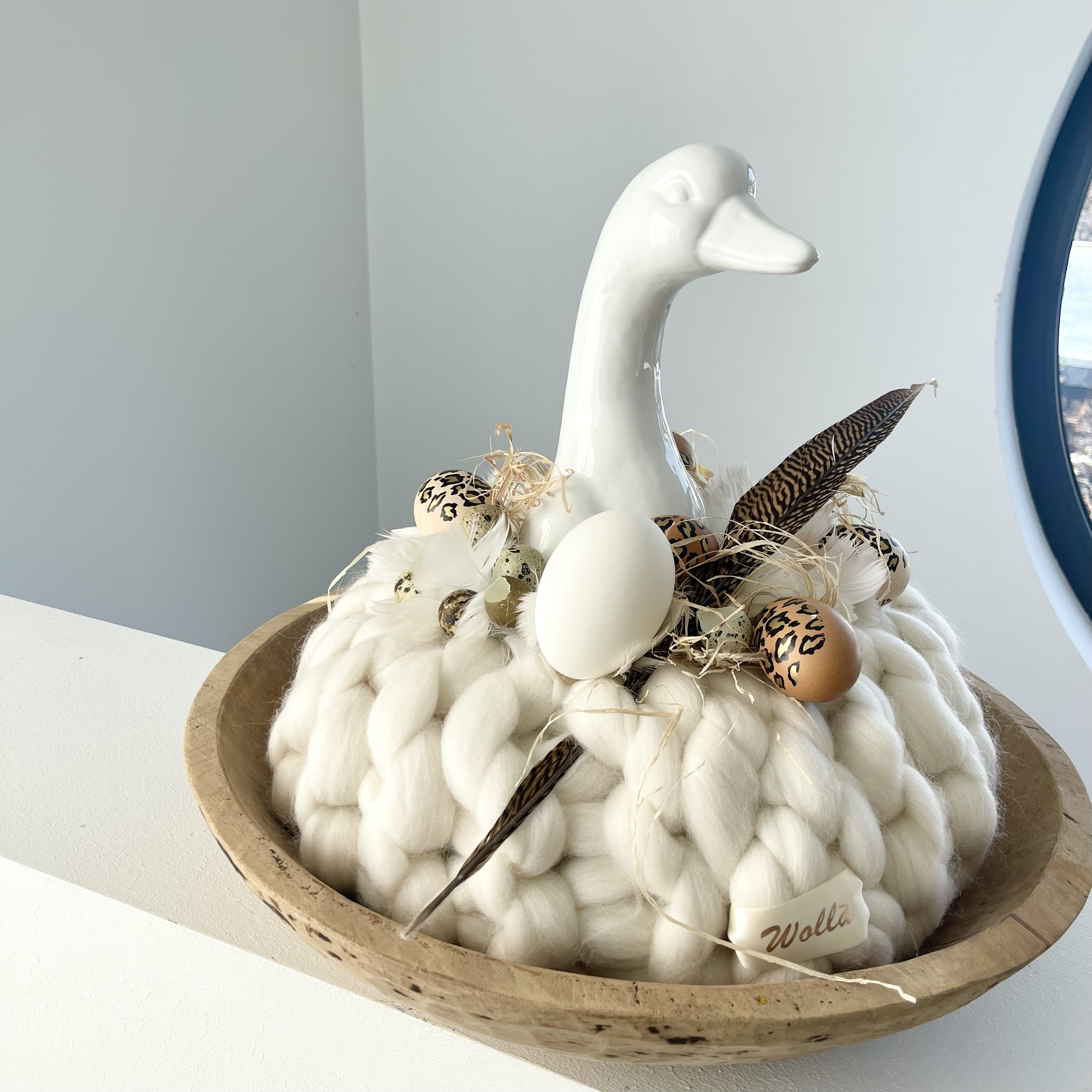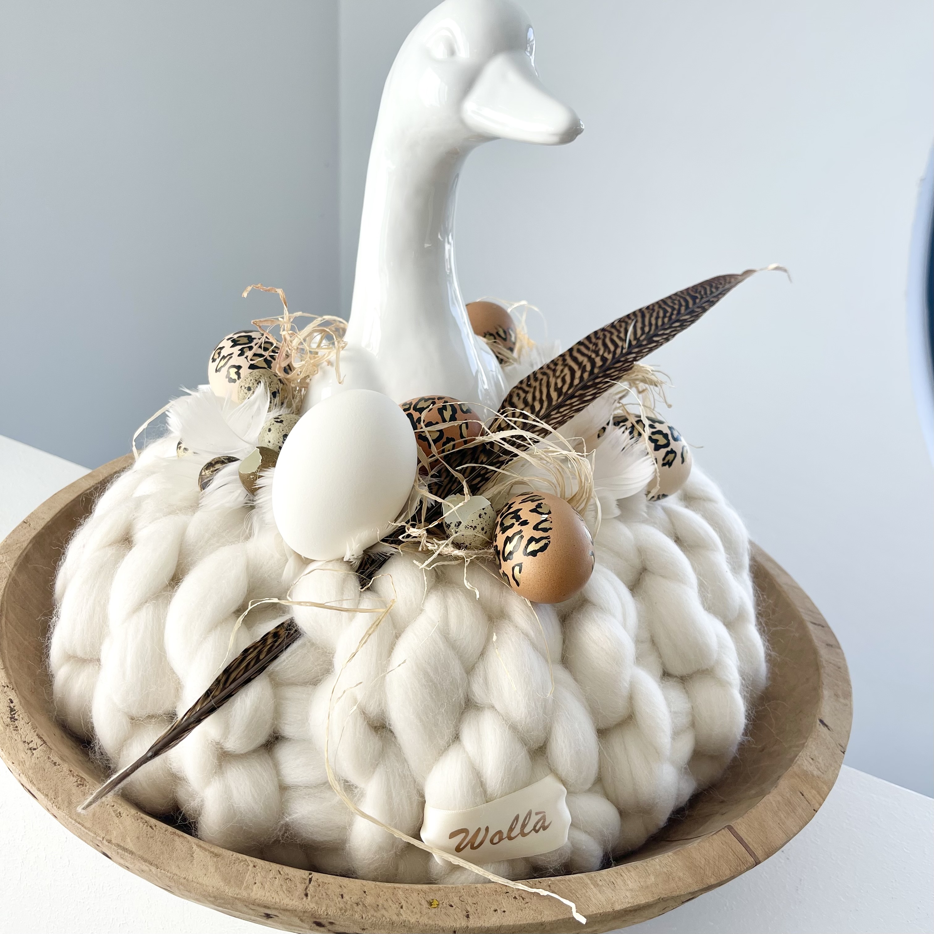 Mein Lieblingskranz, so liebe ich Deko, offwhite Wolla Gugelhupf auf links gestrickt, mit Keramik Gans,