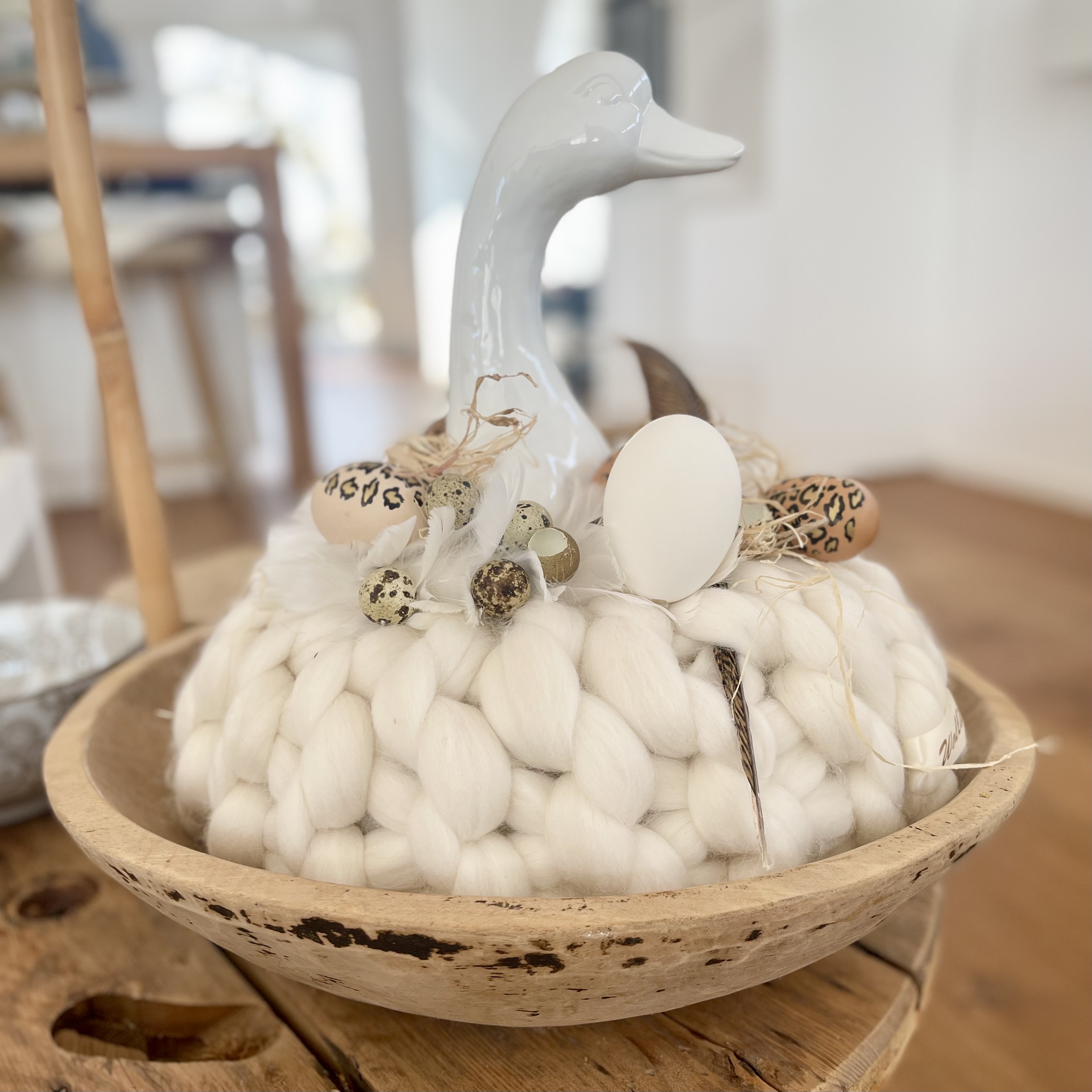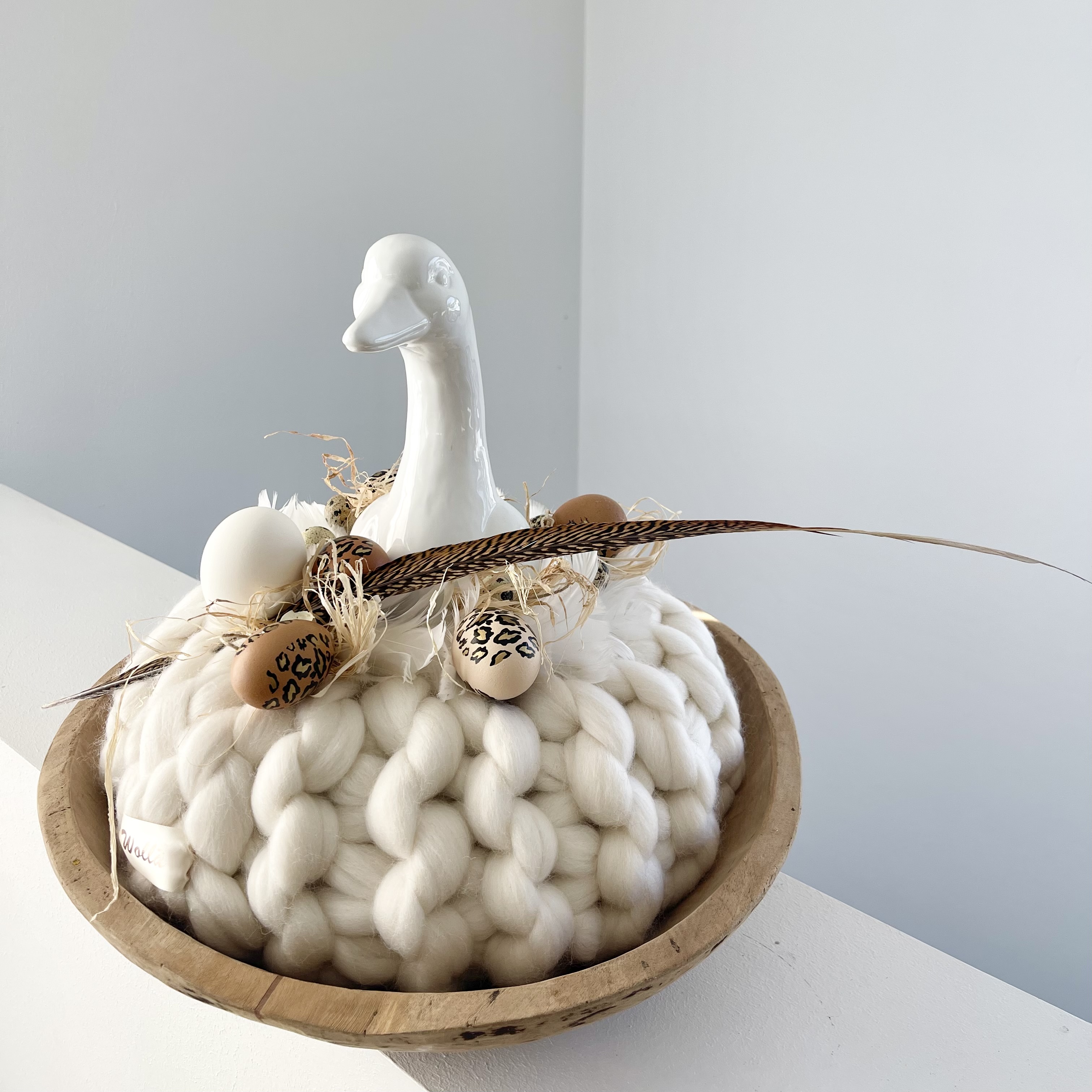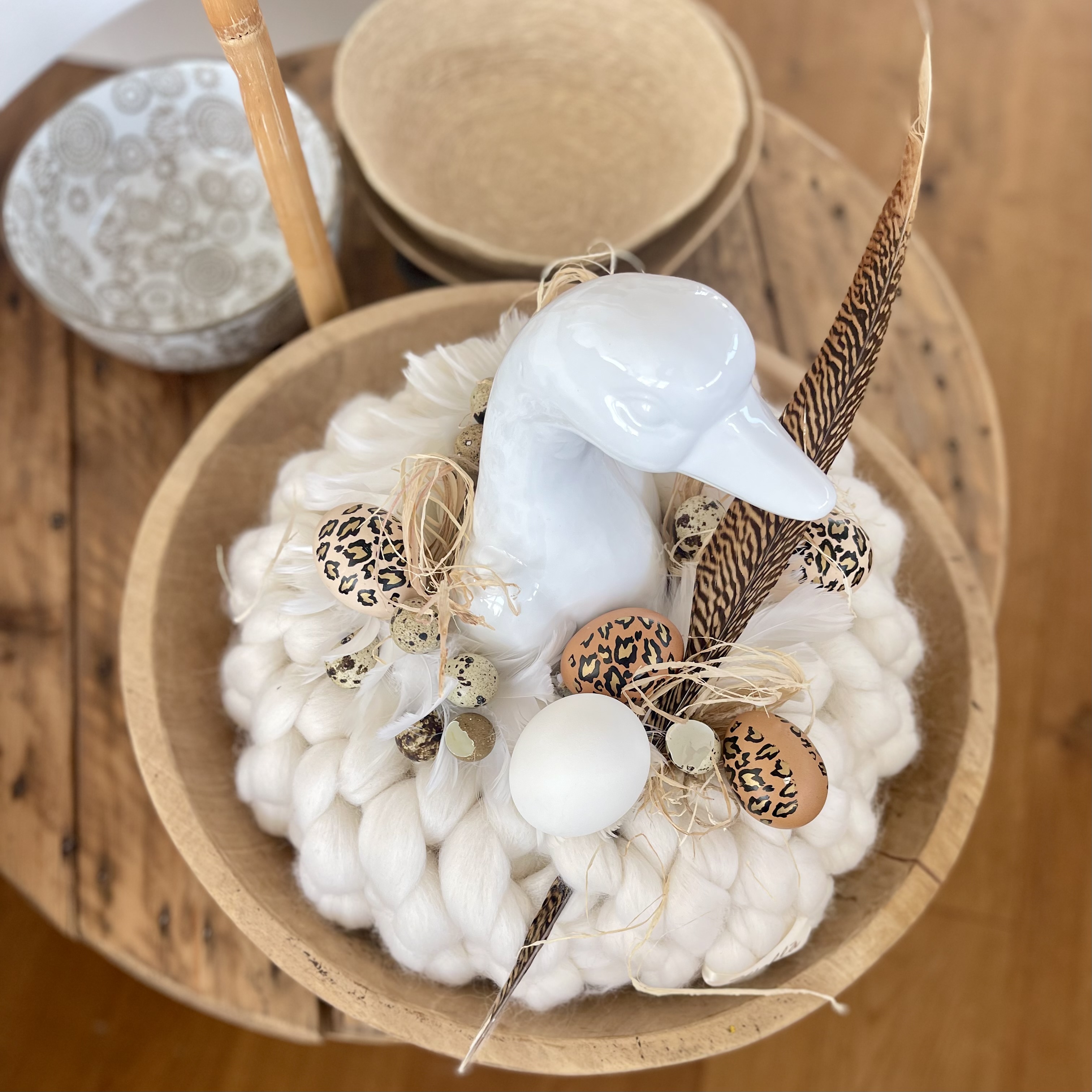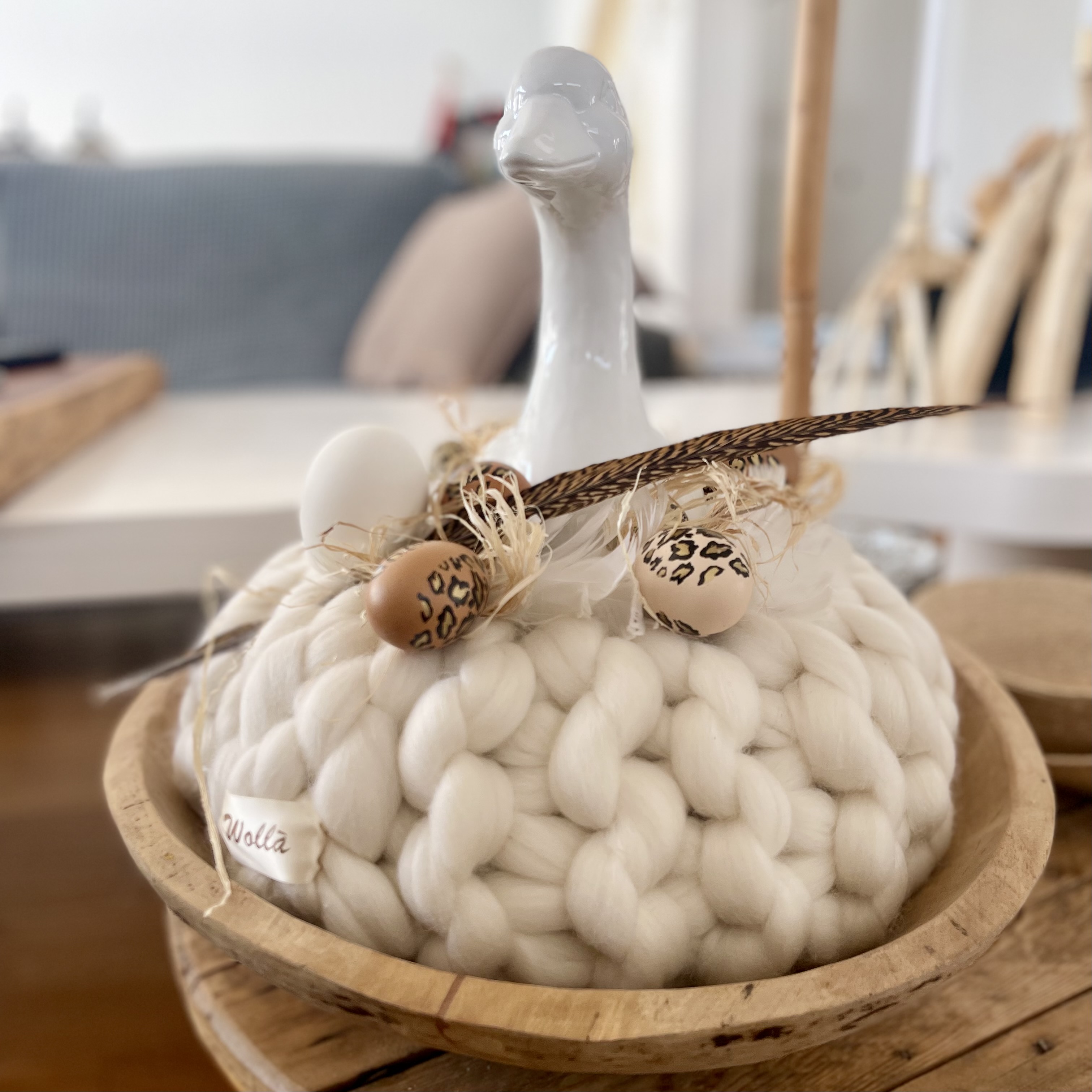 in uriger Holzschale, eingebettet im Federkanz und Leoprint Eiern ein besonders schönes Exemplar, nicht nur auf