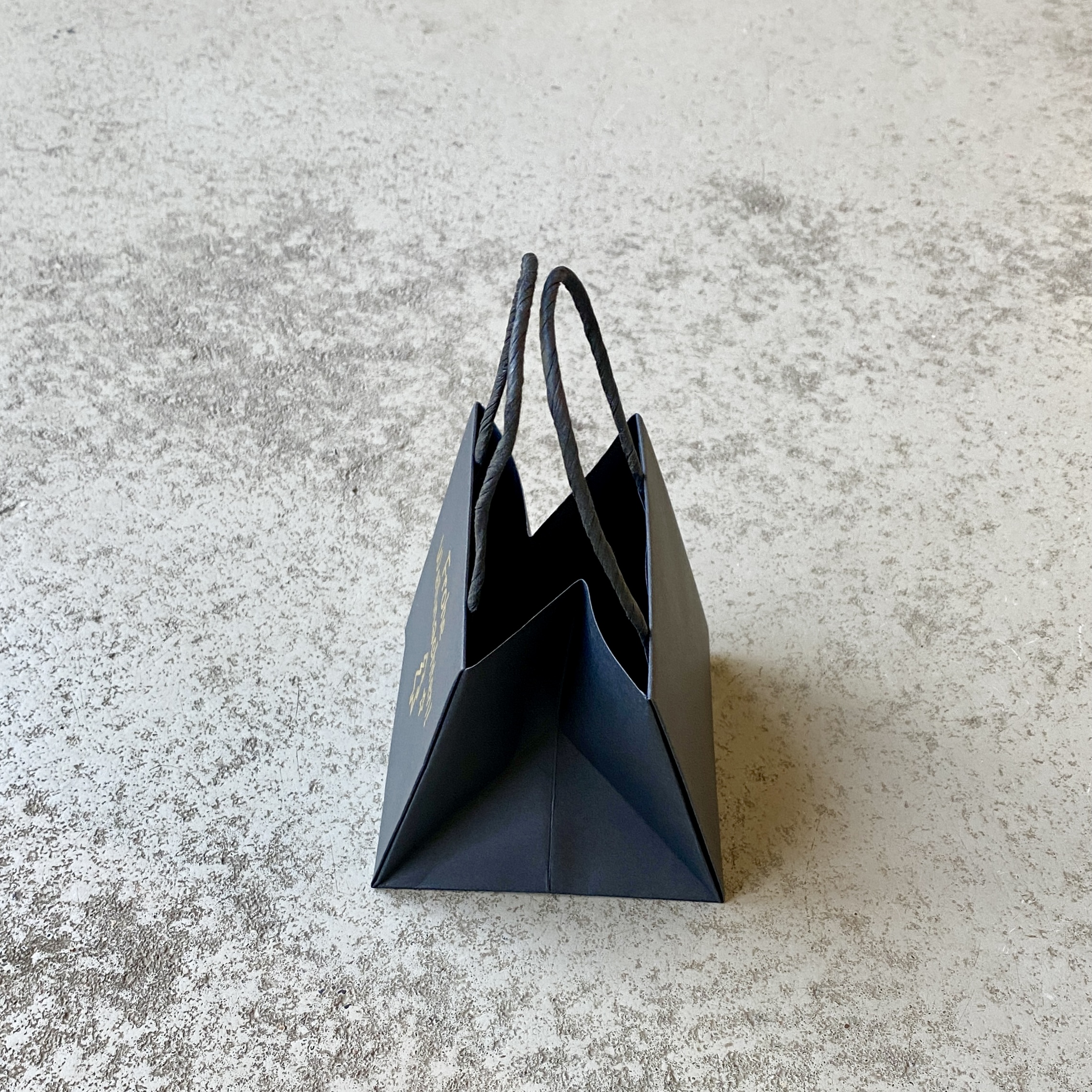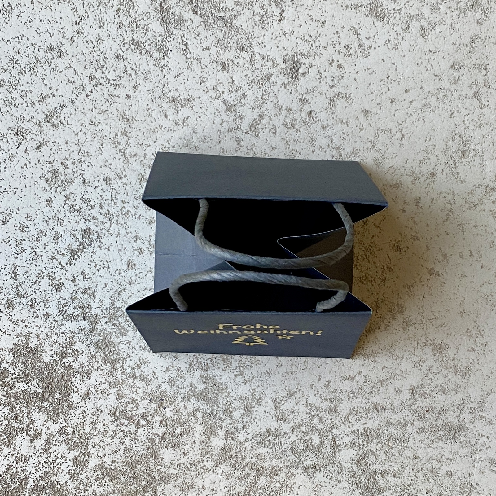 Kleine Geschenktüte aus festem Papier in Schwarz, mit der Aufschrift "frohe Weihnachten" in Gold.
