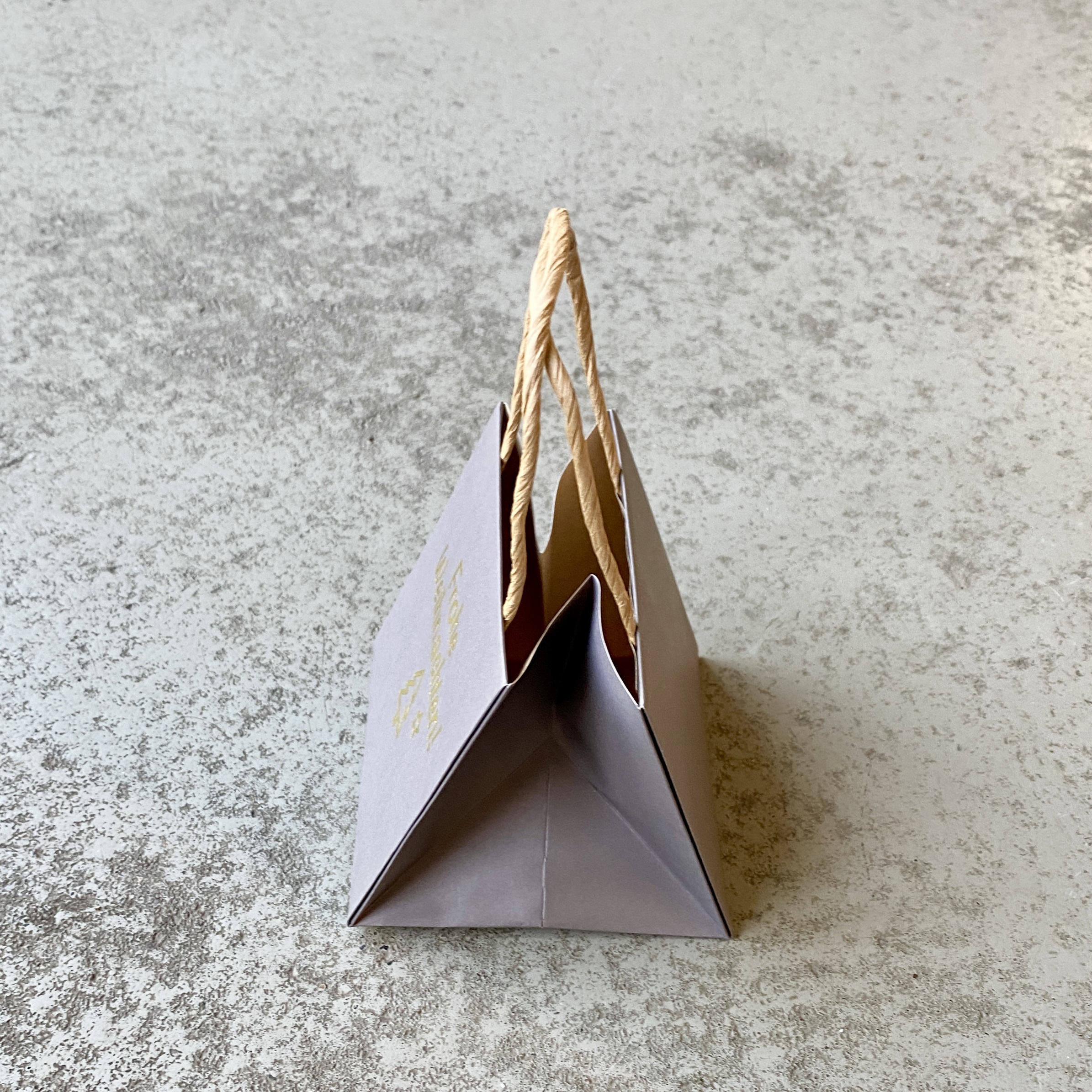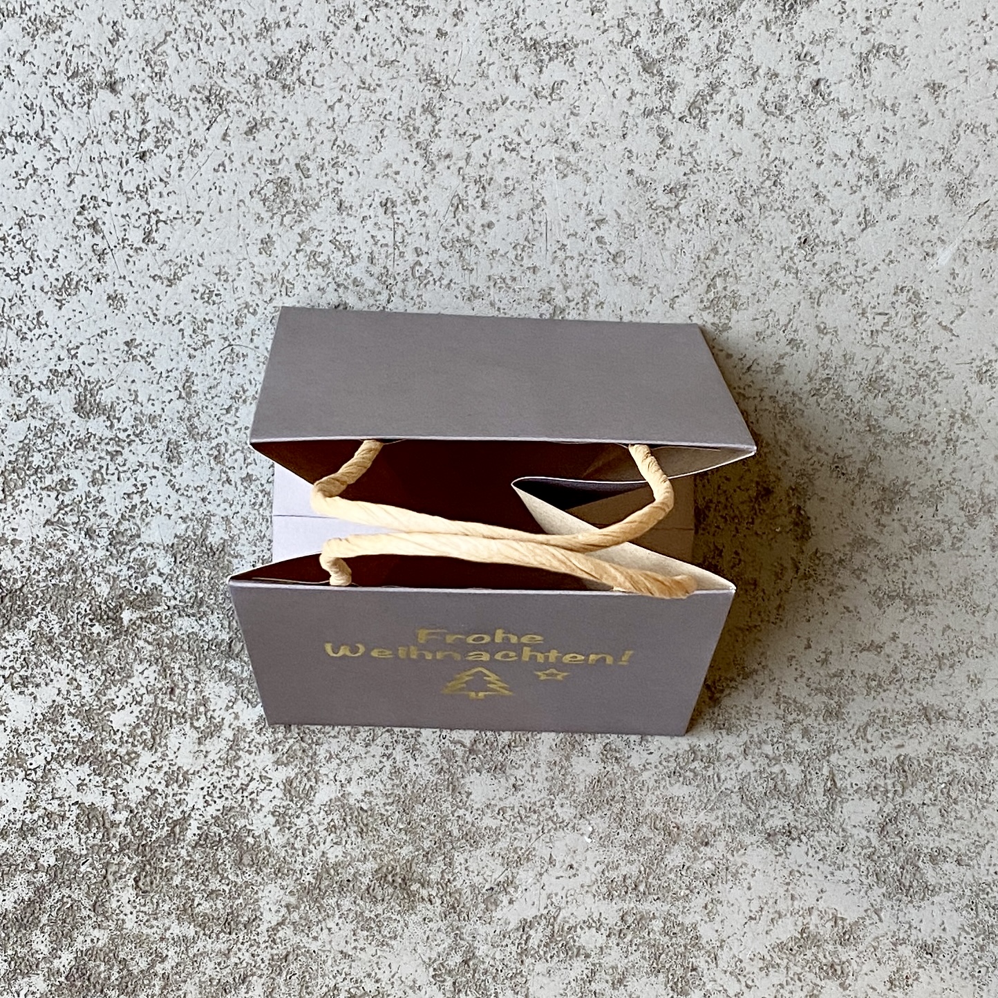 Kleine Geschenktüte aus festem Papier in Taupe, mit der Aufschrift "frohe Weihnachten" in Gold.