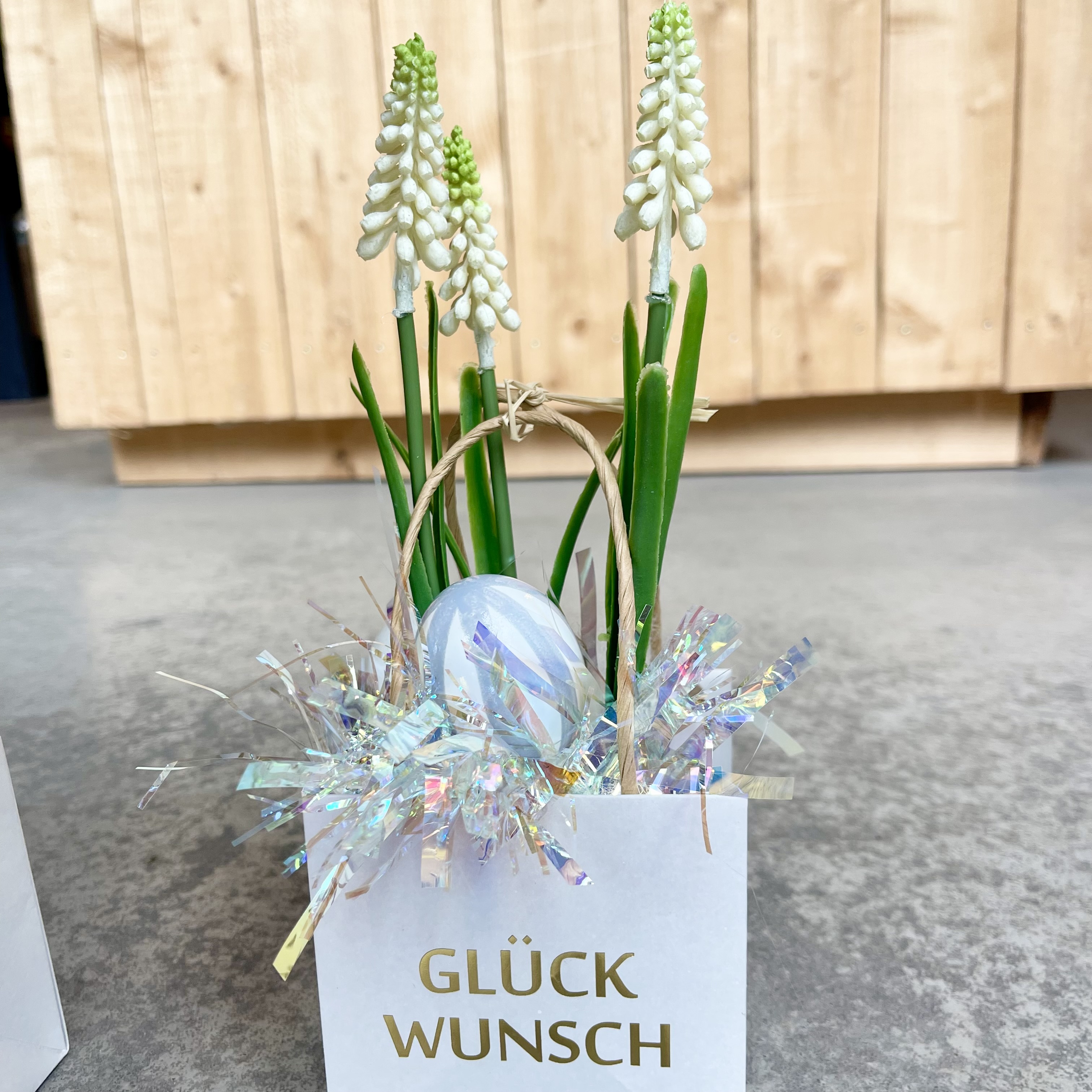 zwei Eier, drei unechte Perlhyazinthen und ganz viel Liebe. Natürlich kannst du noch etwas Süßes dazu legen