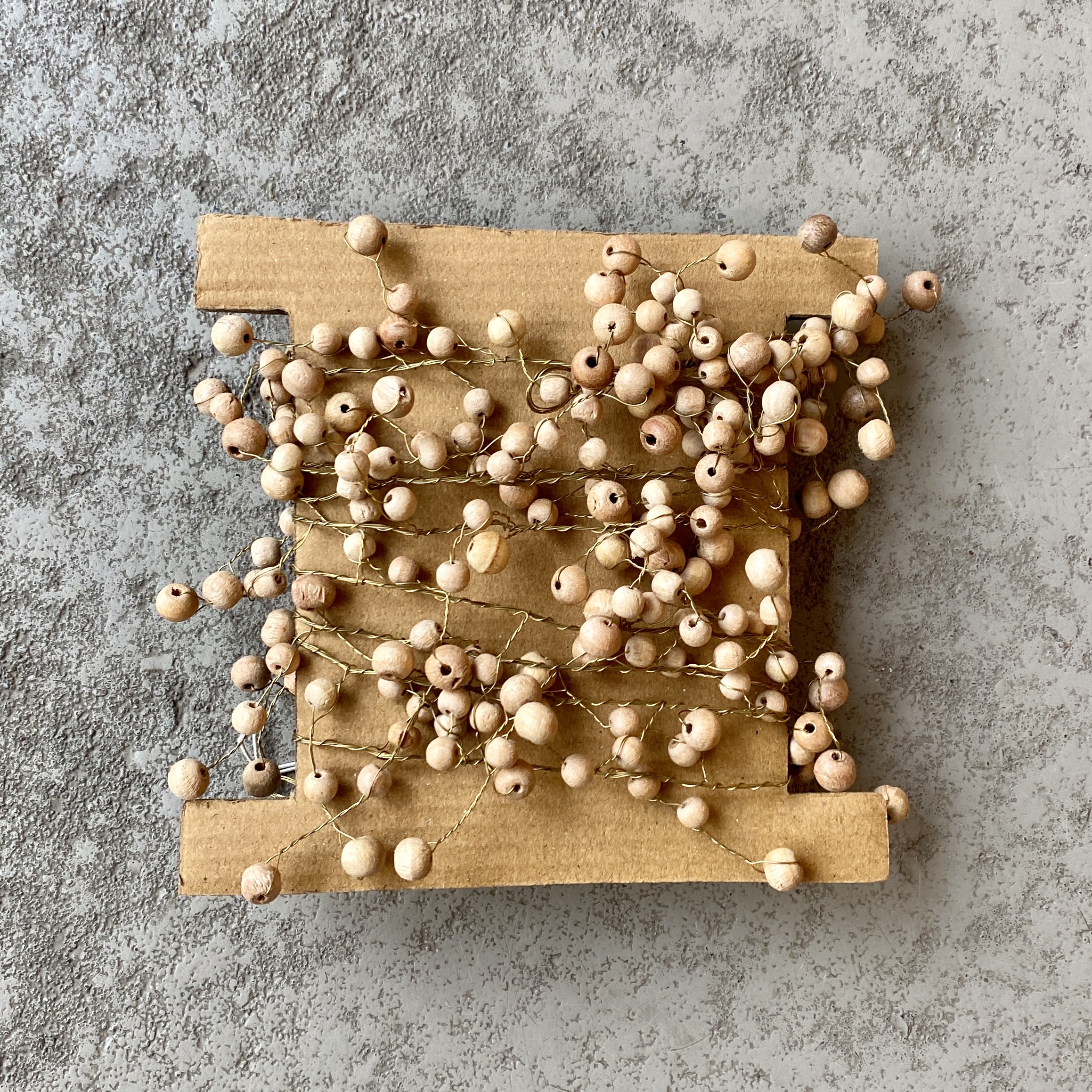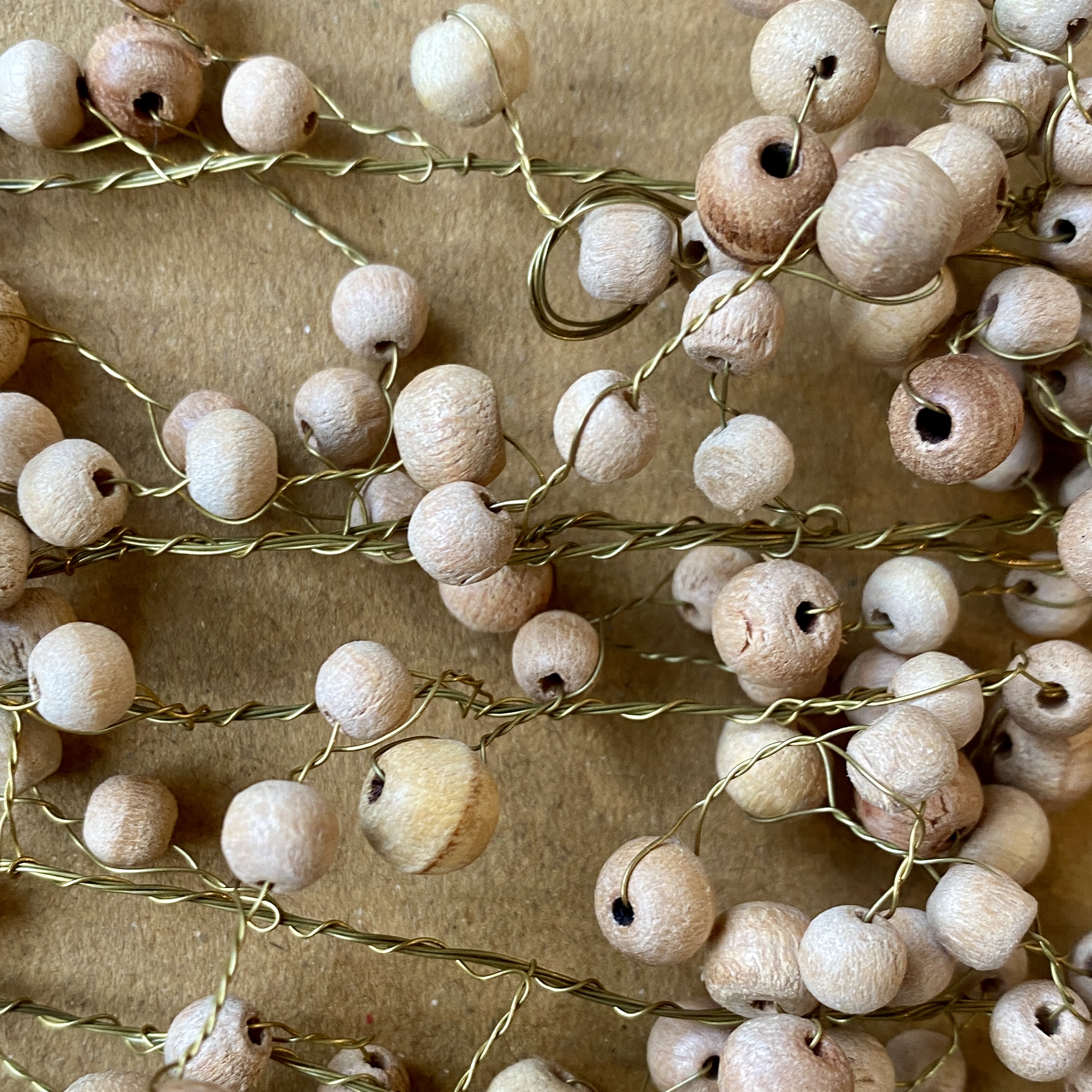 Girlande aus kleinen Holzperlen an gedrehtem Draht.