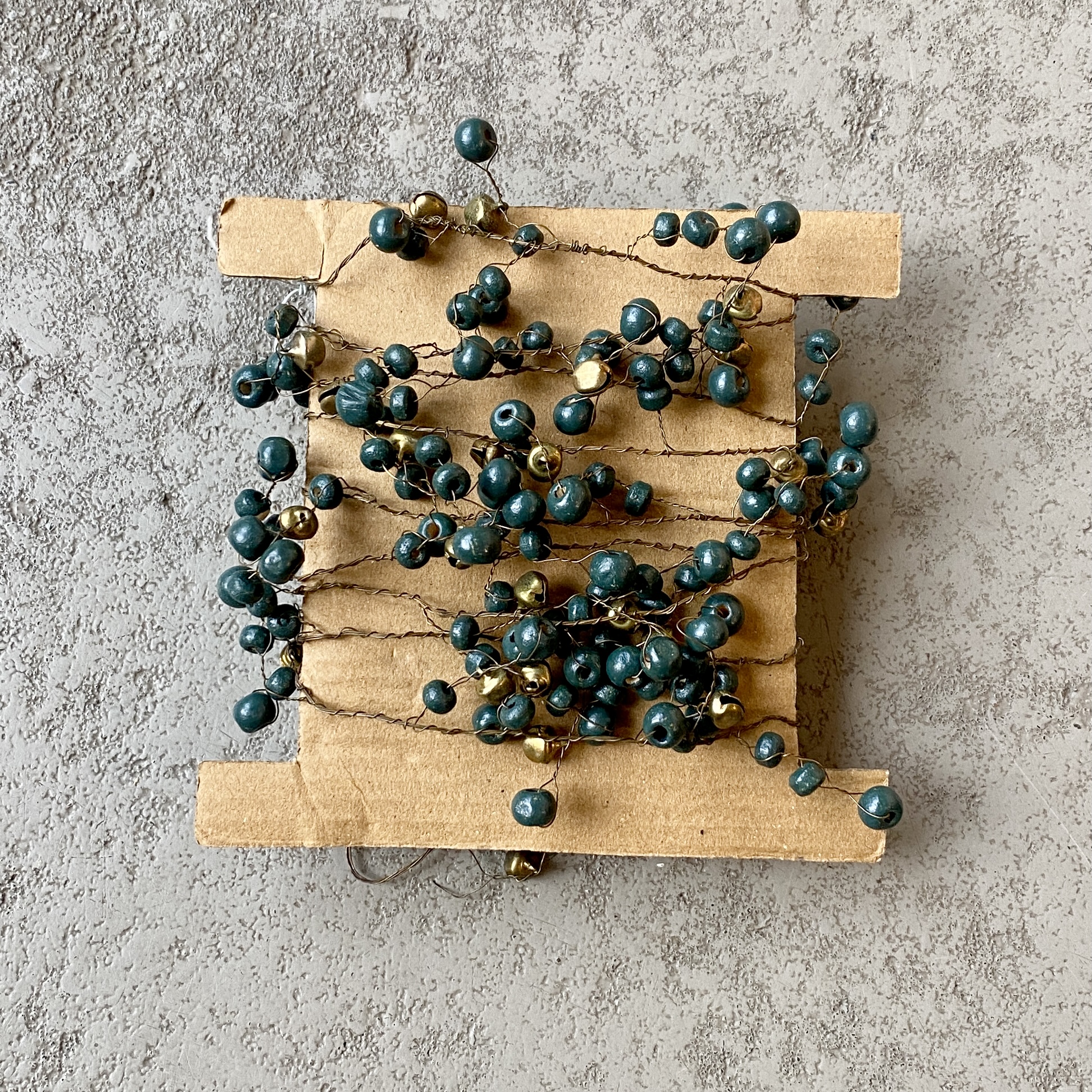 Girlande aus kleinen Holzperlen und kleinen Metallglöckchen an gedrehtem Draht.
