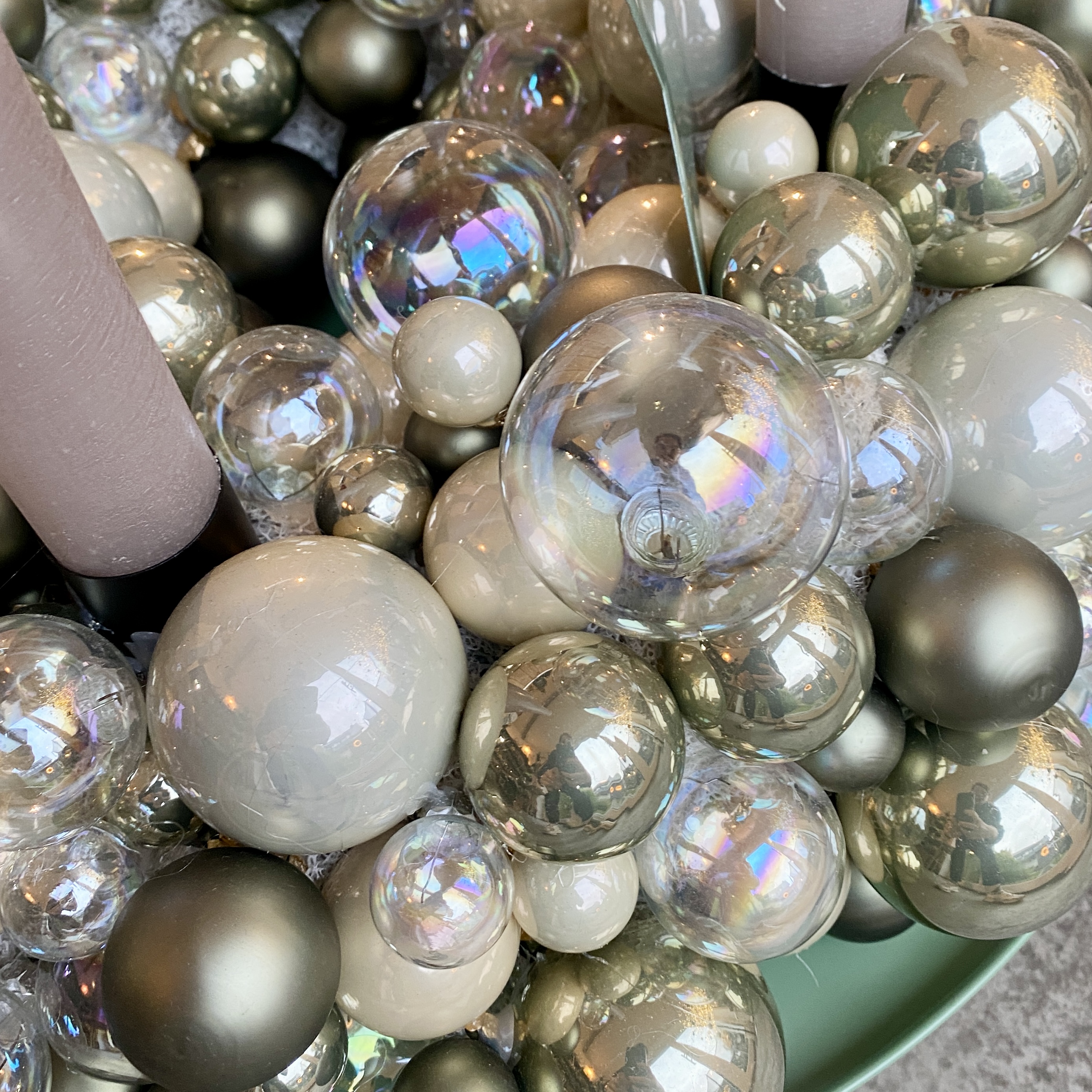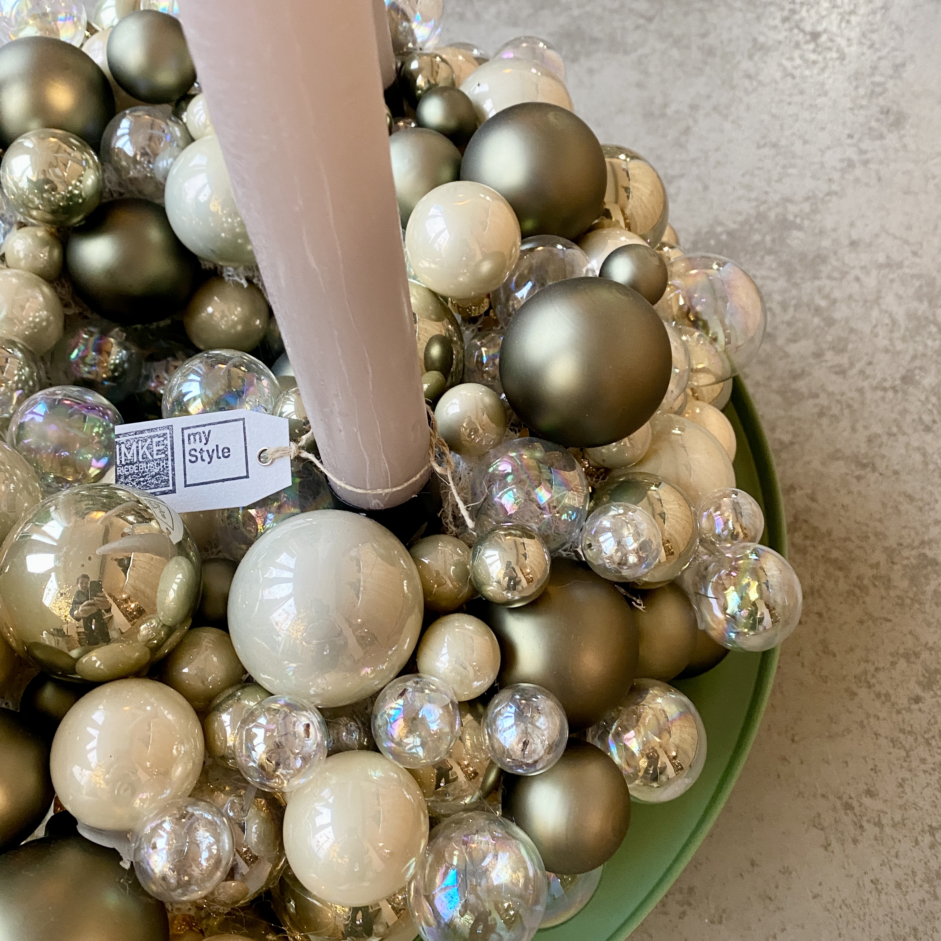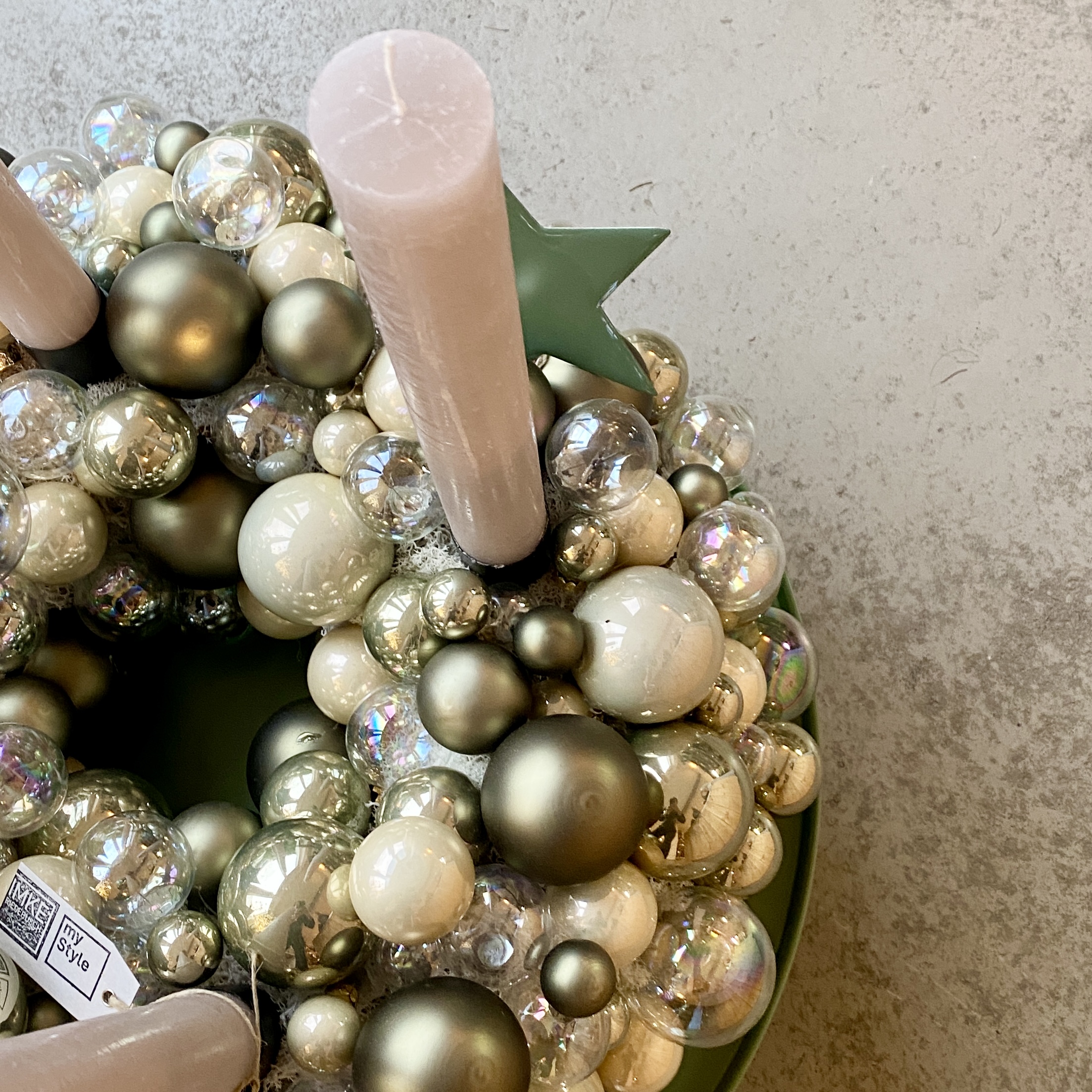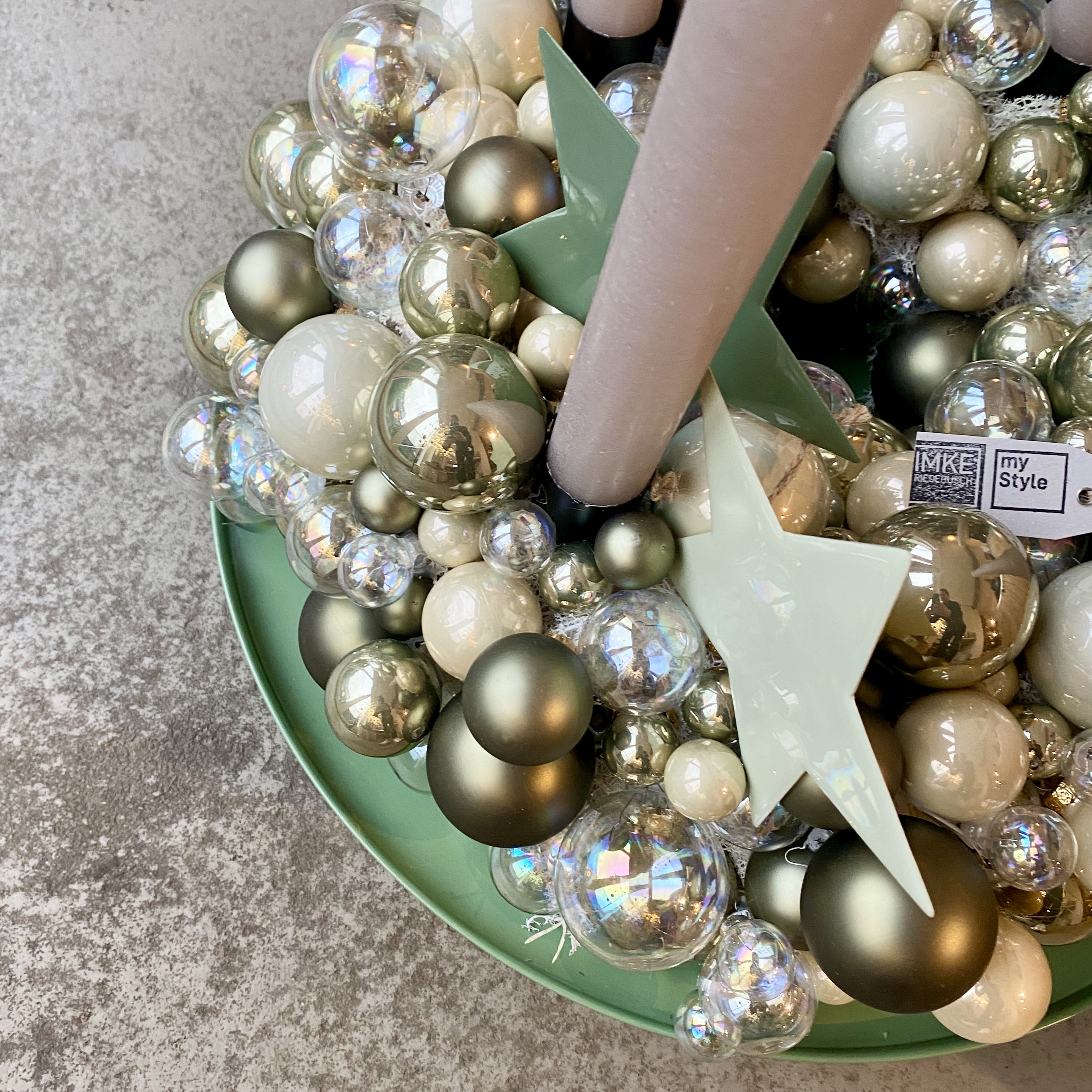 Großer Kranz mit unzähligen Glaskugeln in verschiedenen Größen glänzend und matt in Salbei, Creme und irisierend. 4 Stabkerzen in Taupe und Metallsternen in Salbei und Mint auf einem Metalltablett in Salbei mit Sockel.