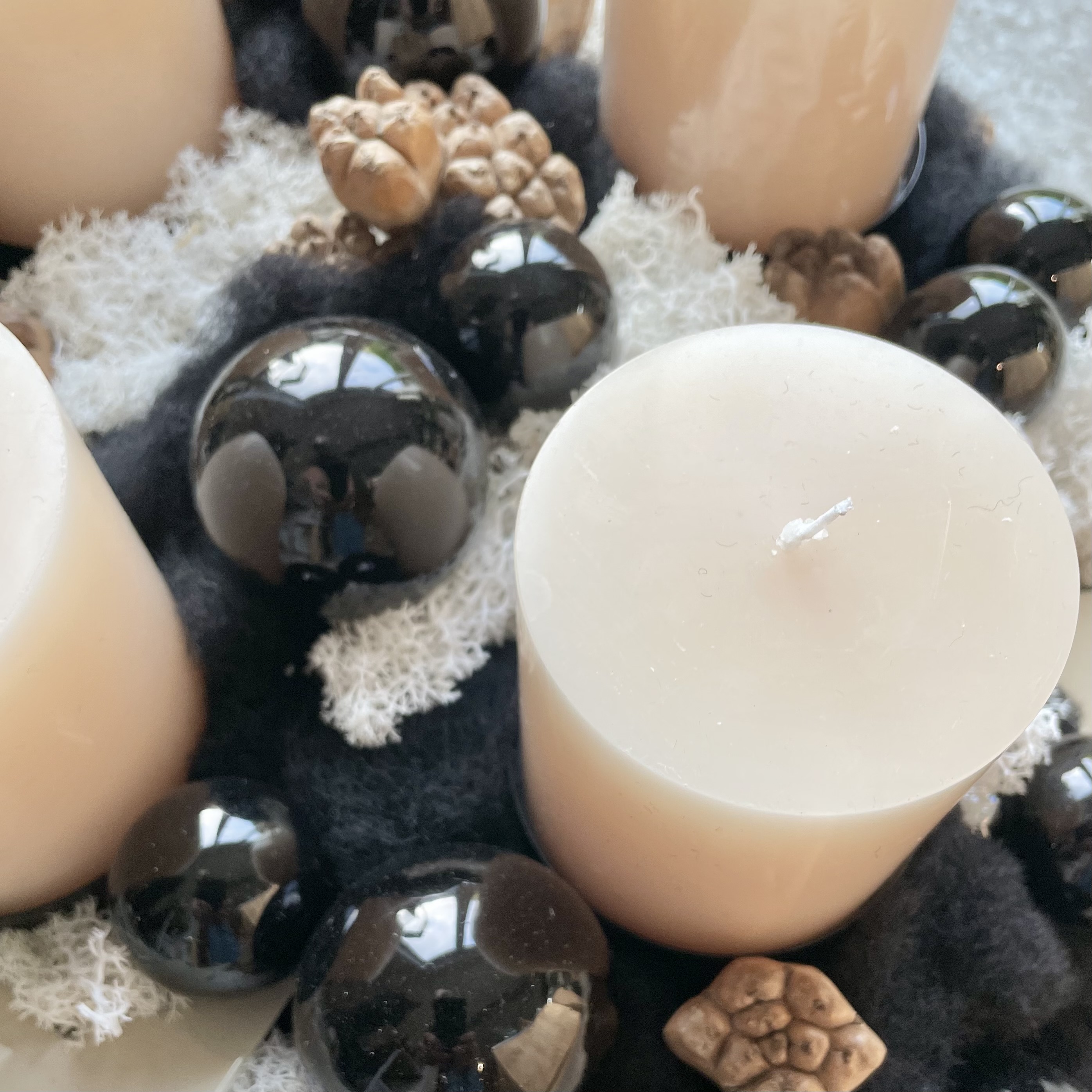 Klassischer Adventskranz in warmen Tönen. Metalltablett, Kranz aus Lehnerwolle, Islandmoos geblichen, diverse Kugeln, Natur-Kapseln, drei Metallsterne lackiert, vier Kerzenteller und vier Kerzen gehören zu dieser Gestaltung.