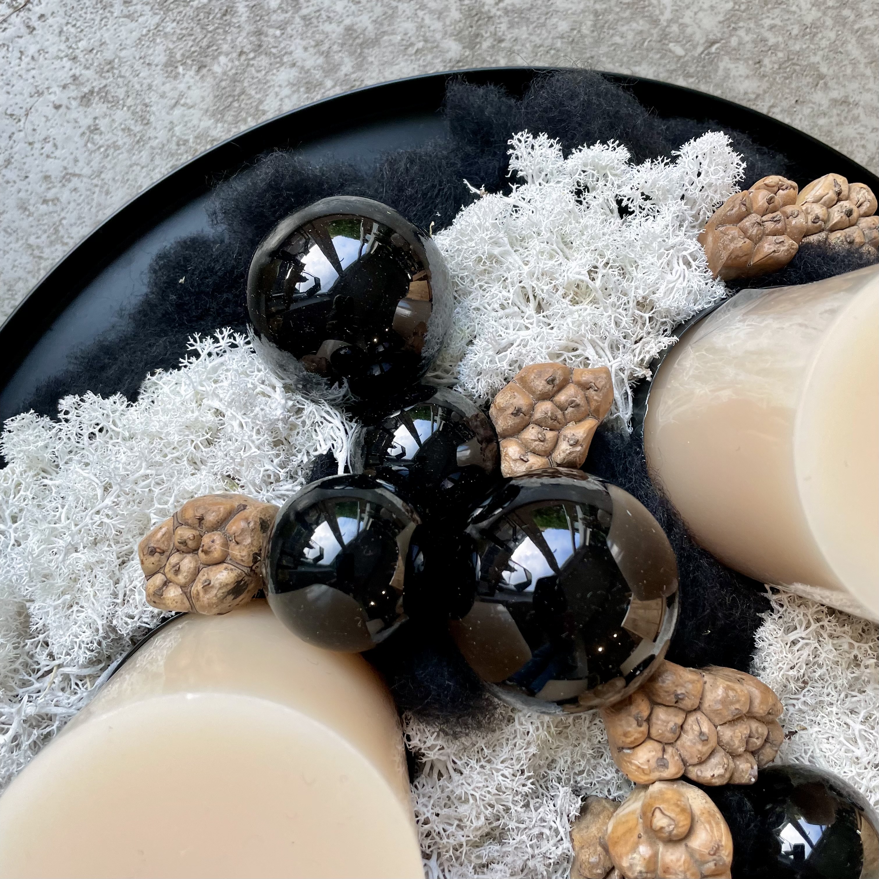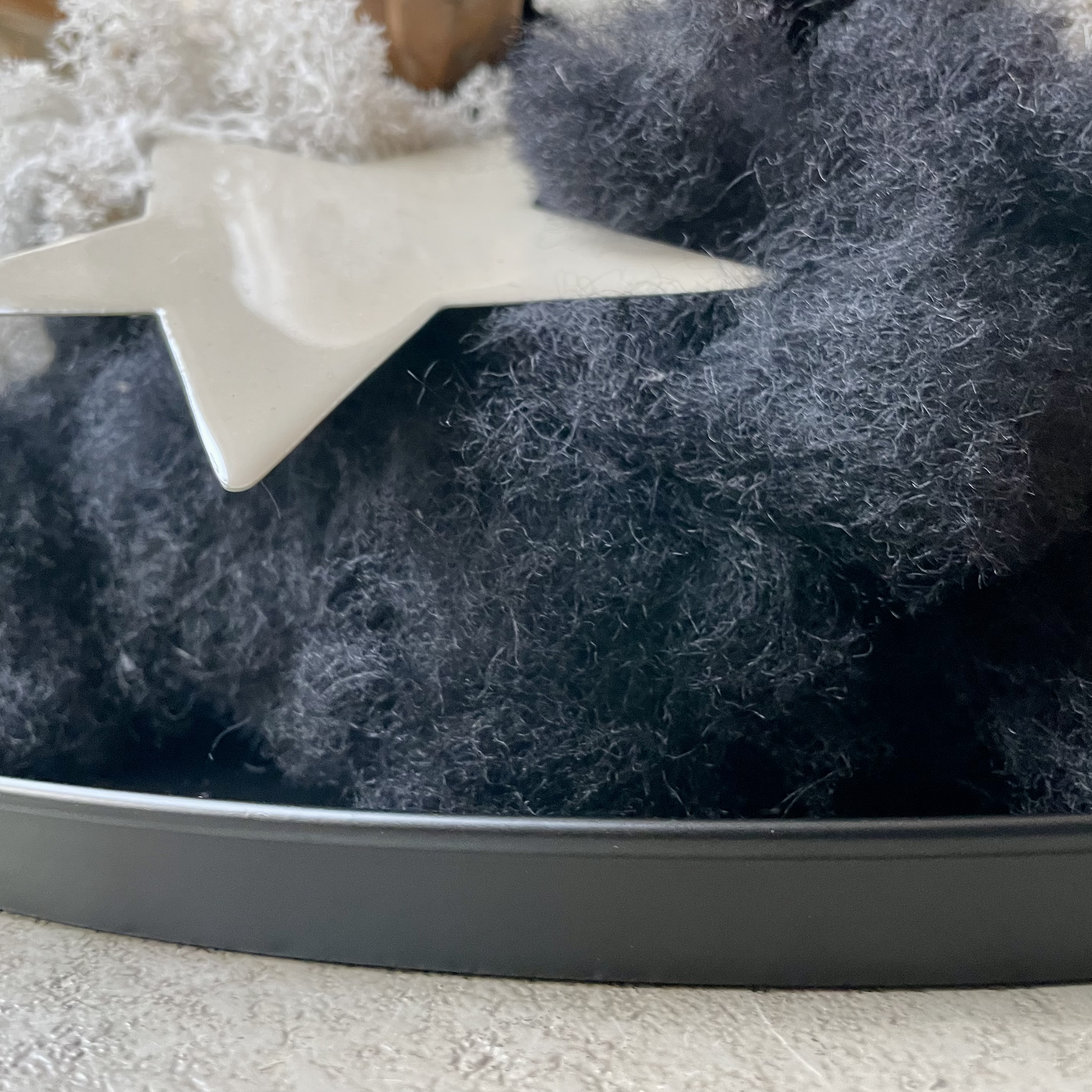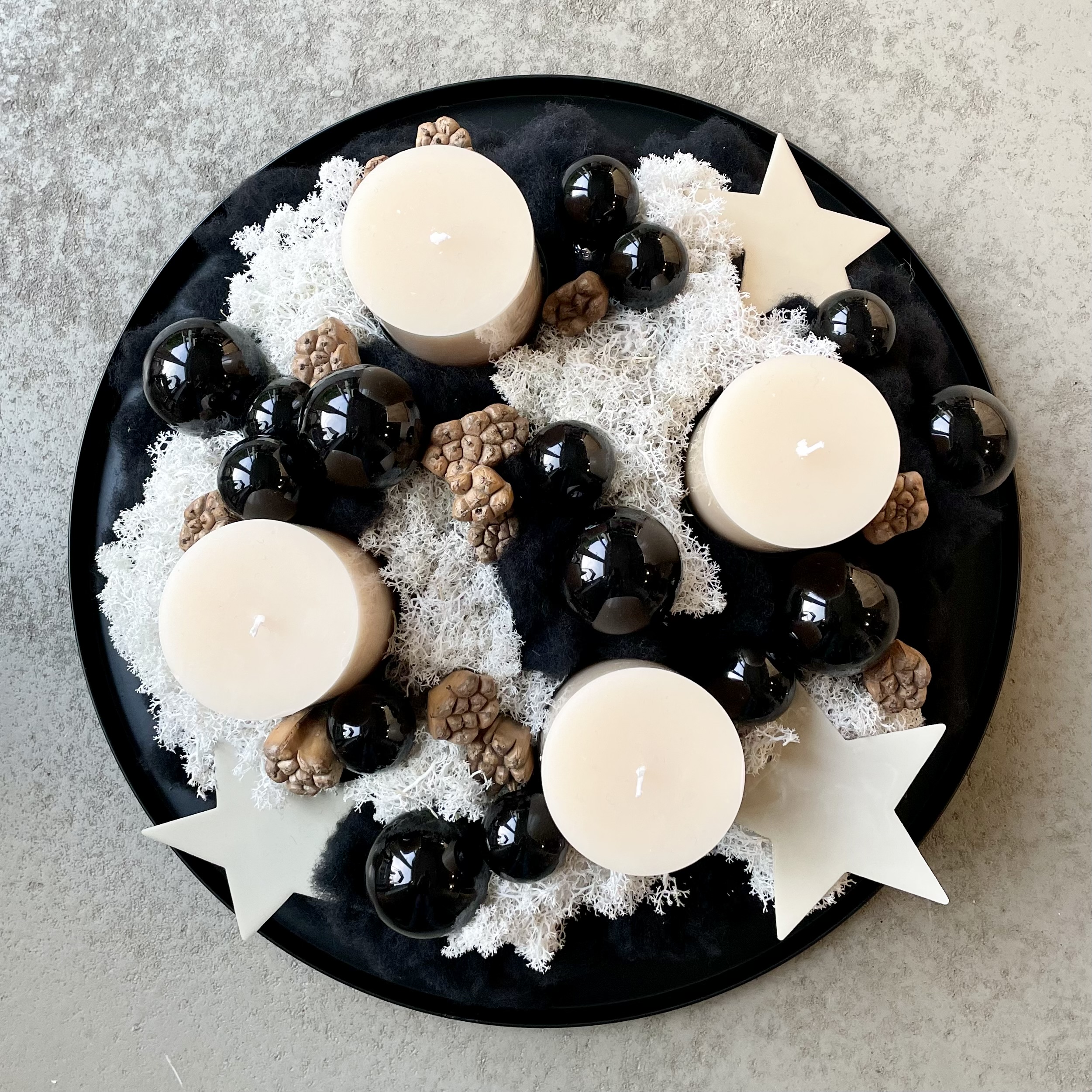 Großer Adventskranz "Sterne" auf Metalltablett mit vier Kerzen D50cm, schwarz/creme