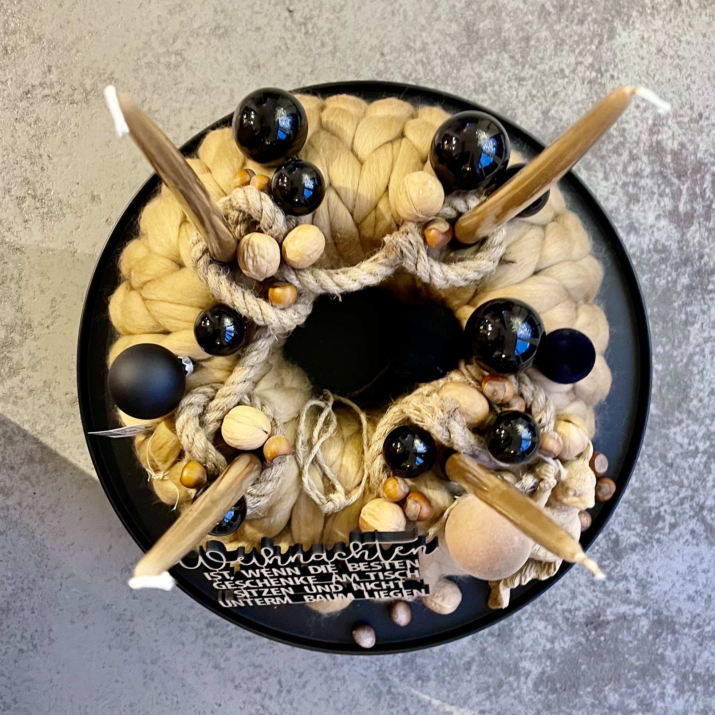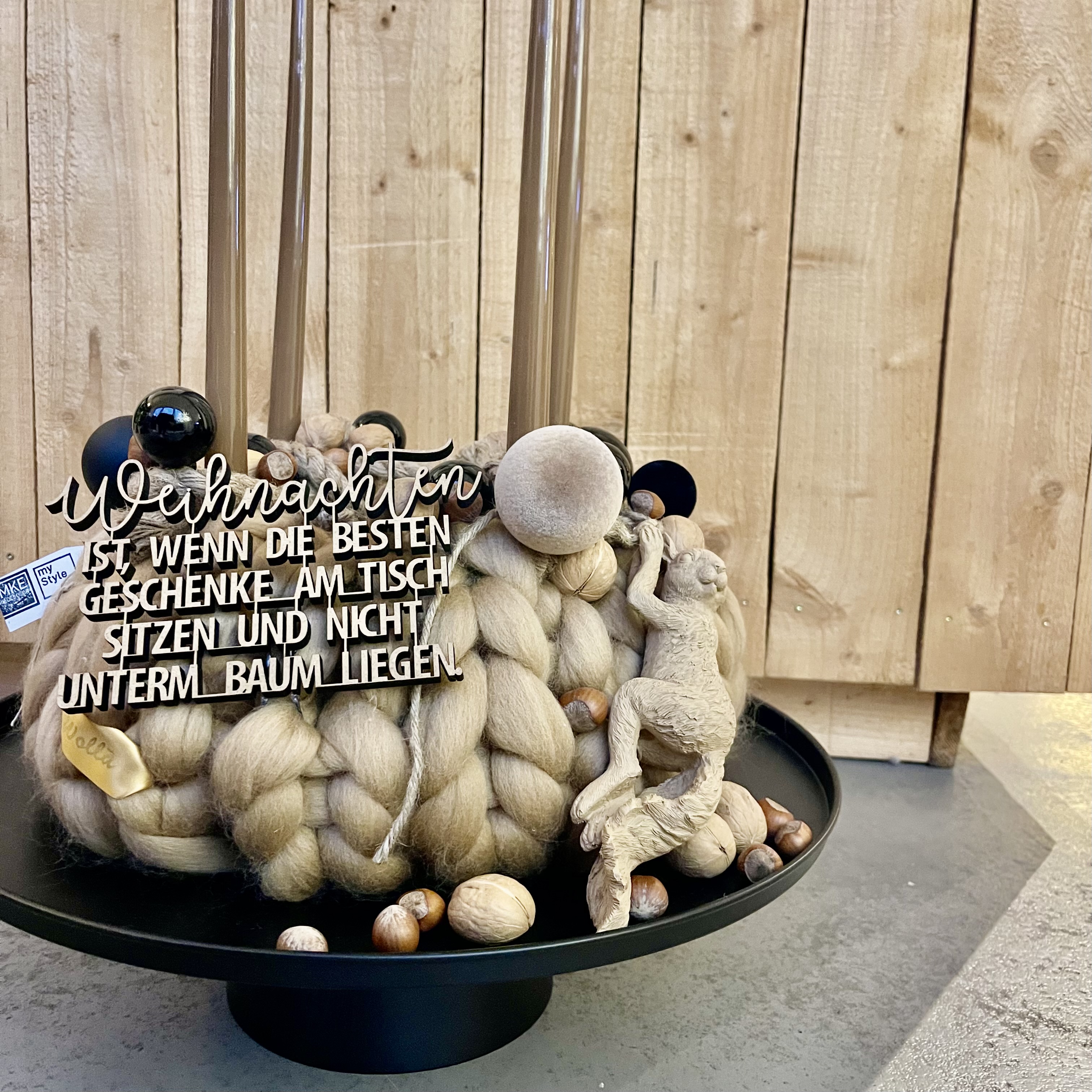 Weihnachtlicher Kranz aus Merinowolle in camel. Der Kranz wurde mit Lackkerzen, Glaskugeln, Nüssen, Metallsternen, Tau und einem Eichhörnchen dekoriert. Der Spruch " Weihnachen, sitzen die schönsten Geschenke am Tisch....." zaubert jedem ein Lächeln ins Gesicht. Der Kranz kommt mit einem weißen Tablett, wie auf den Fotos zusehen.