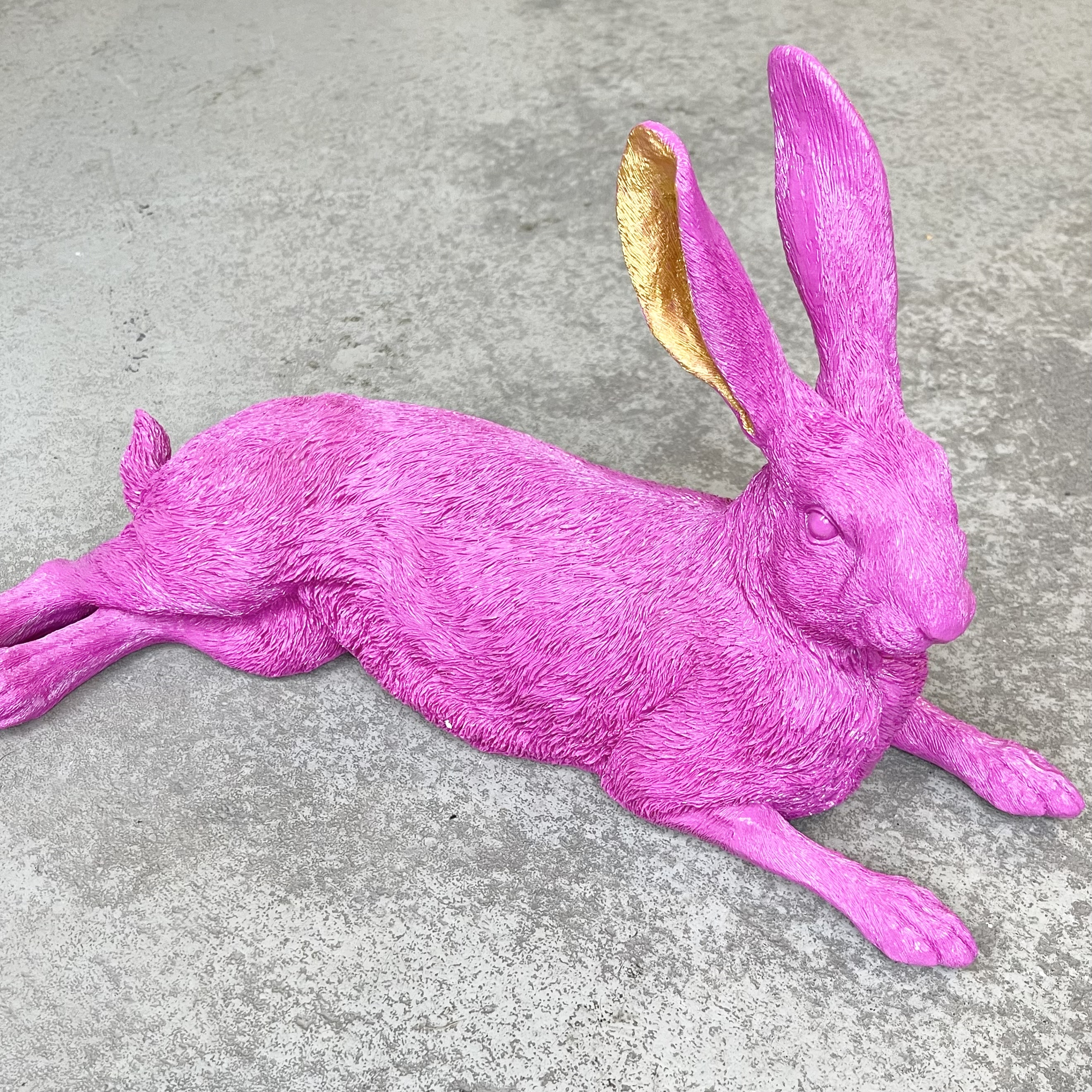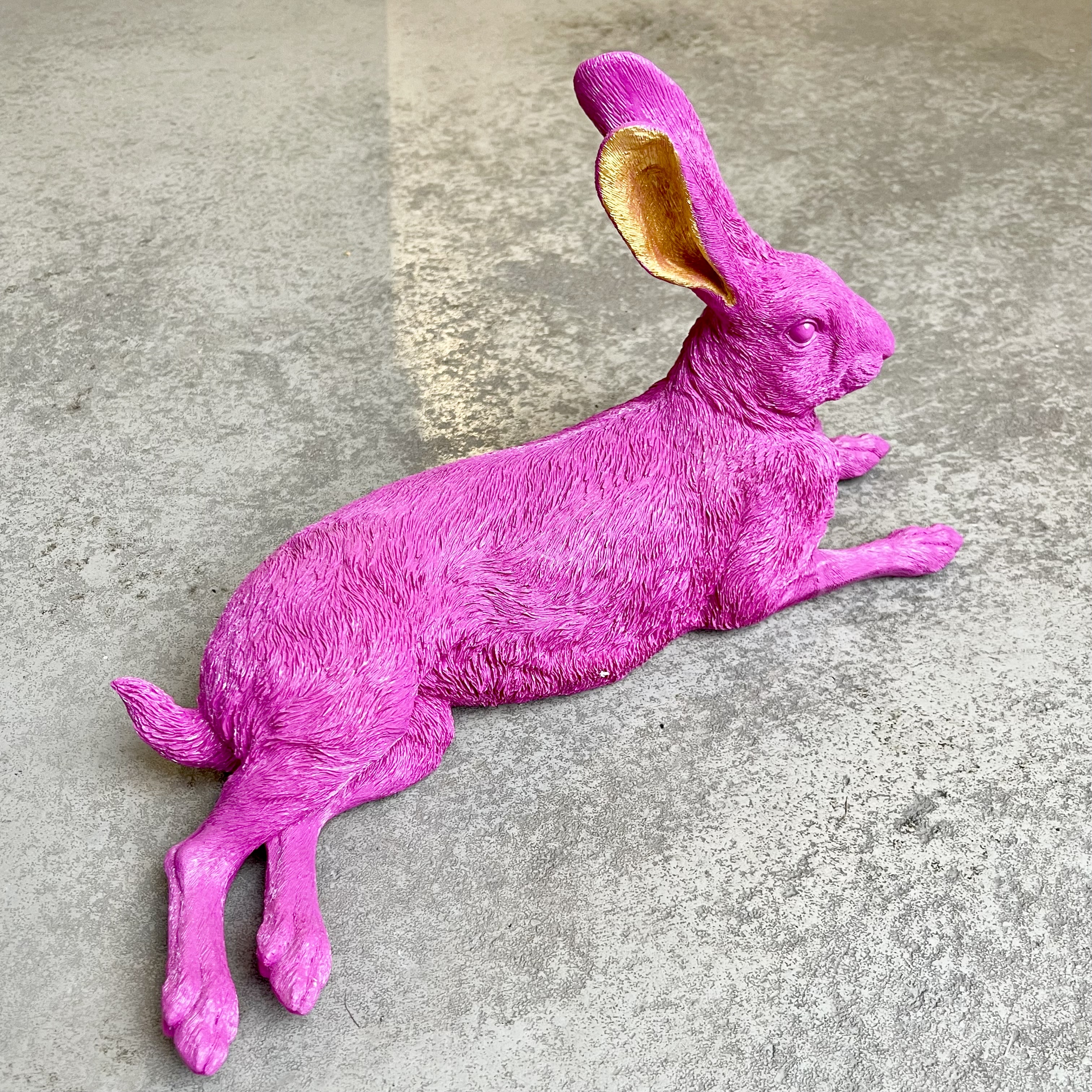 Hase liegend pink, aus Polyresin, Outdoor geeignet, B22,5cm, L46,5cm, H25cm.