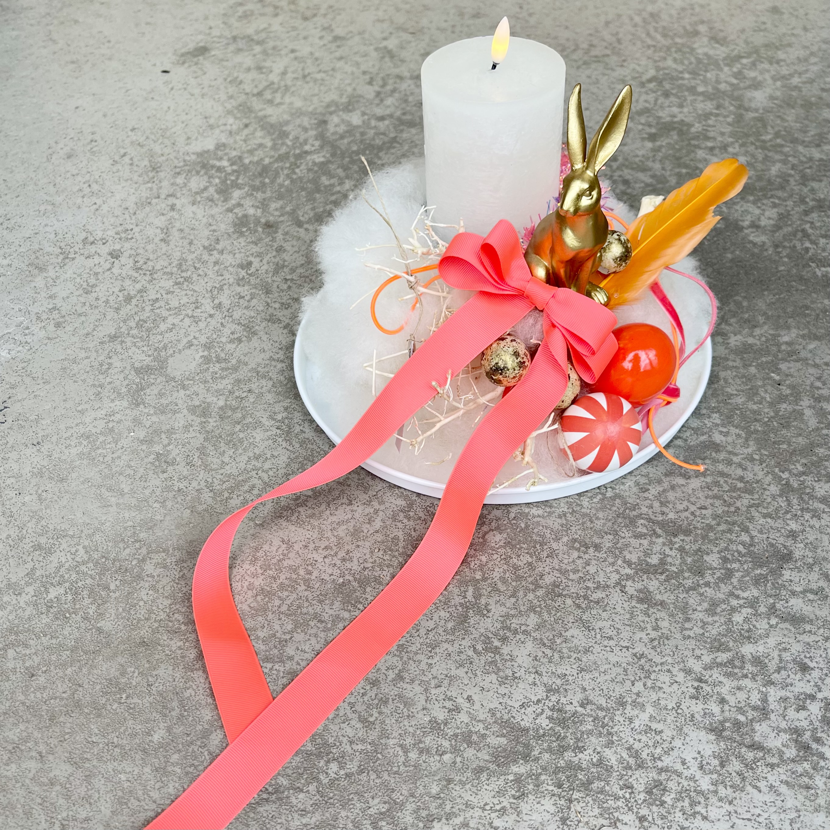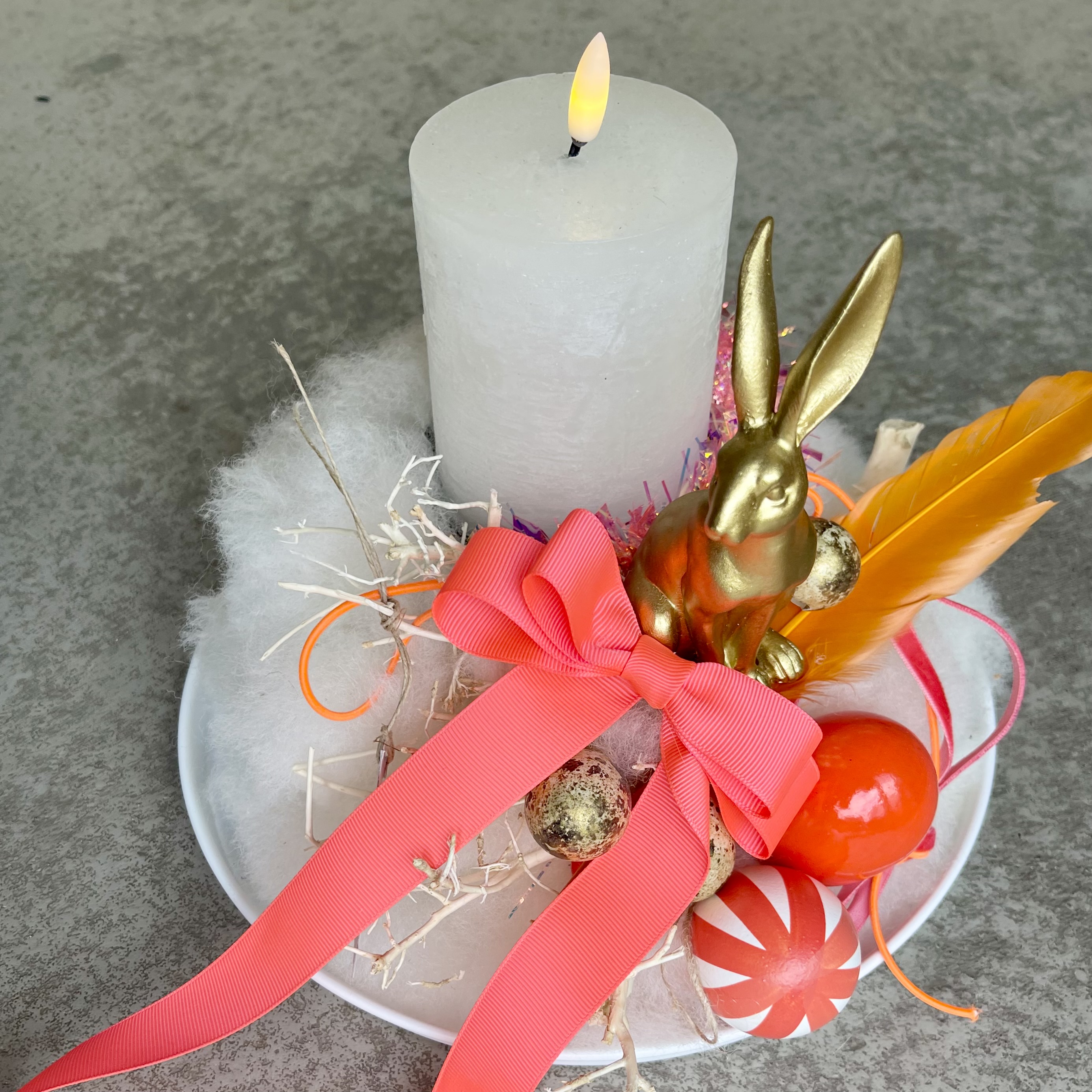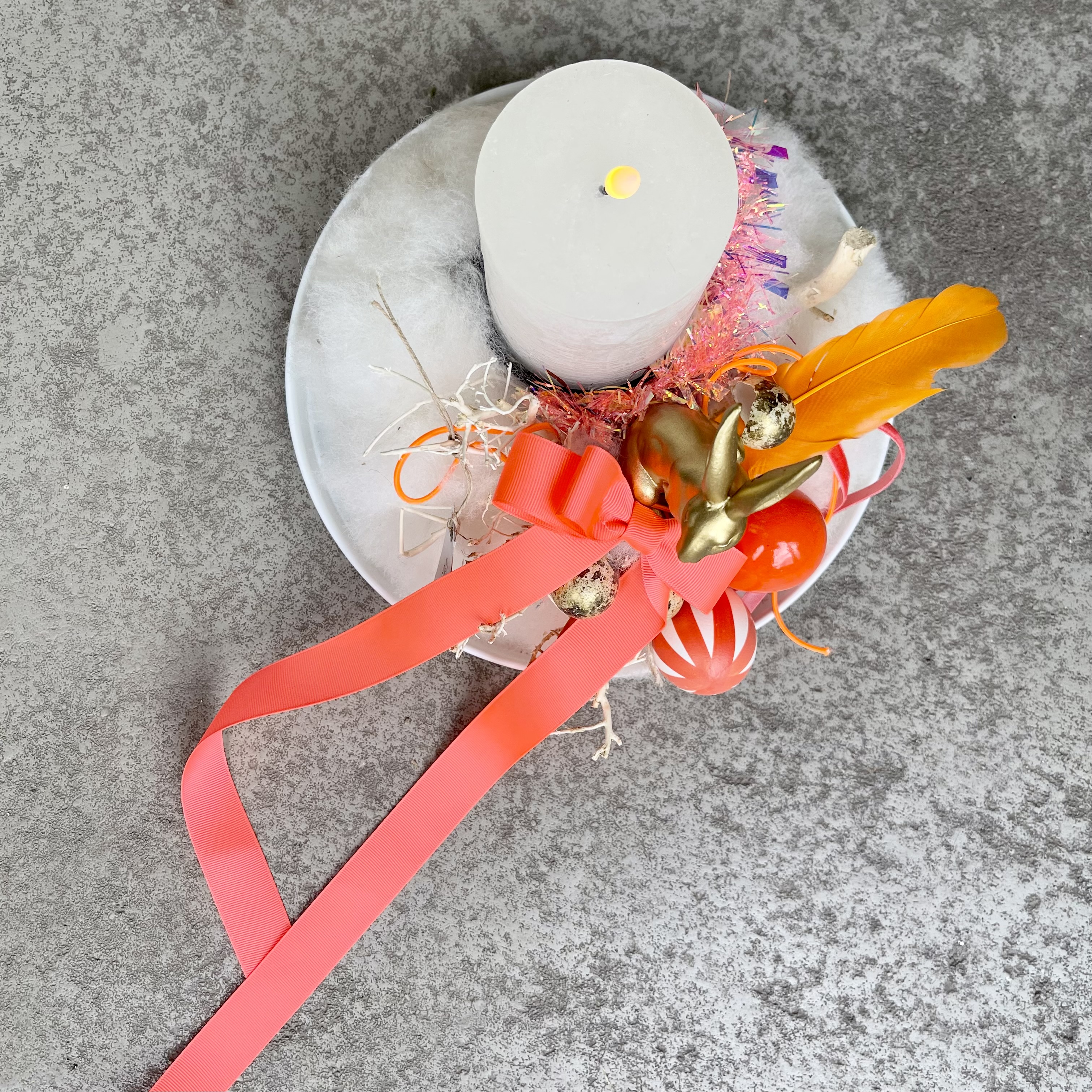 Ein kleines Schnuffelnest aus Wolllunte in Offwhite, mit Goldhase im Eibett, orange Schleife und Feder.