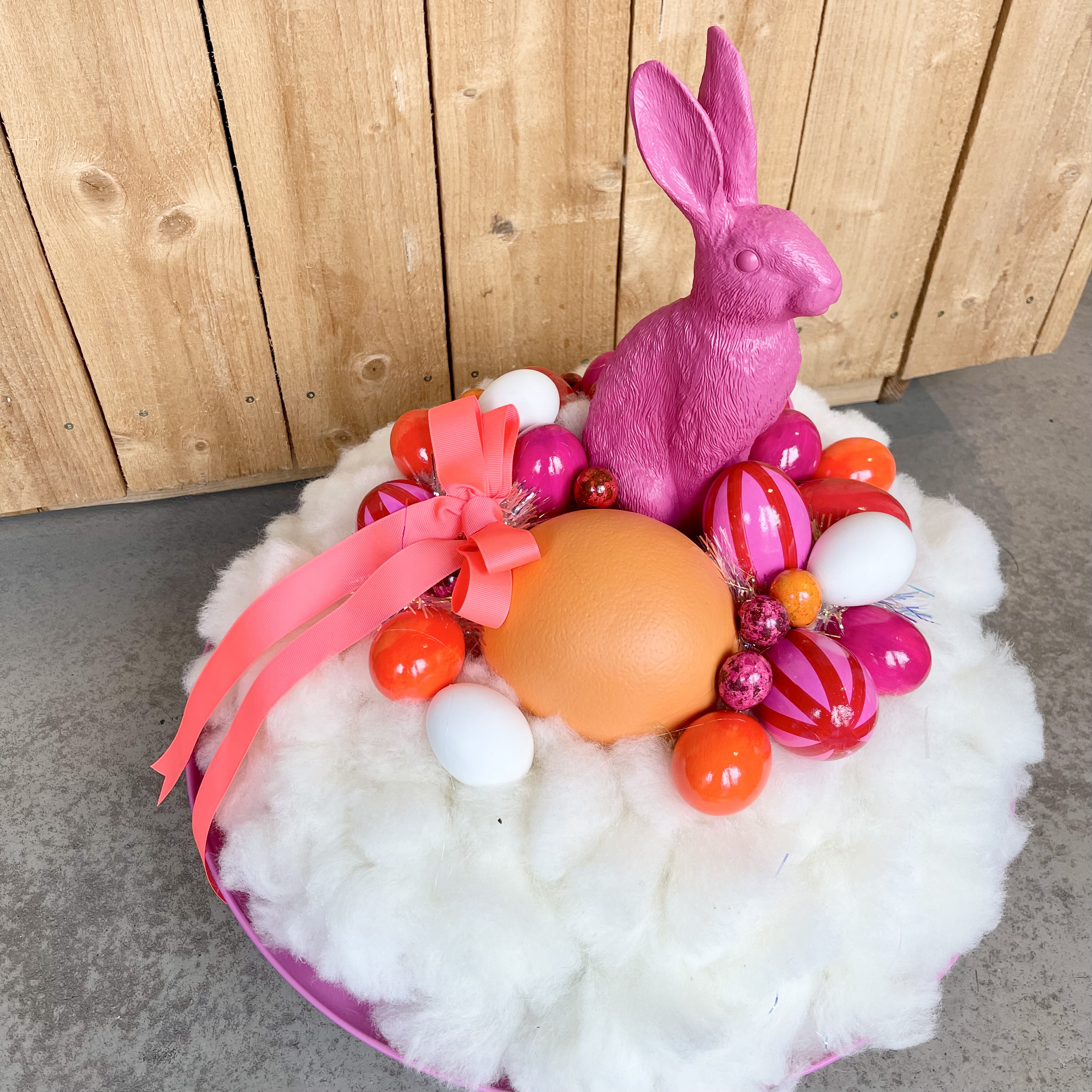Wundervolles Hasennest im Lunte Kranz auf Metalltablett mit Eiern und Hase gefüllt, der ideale Blickfang auf