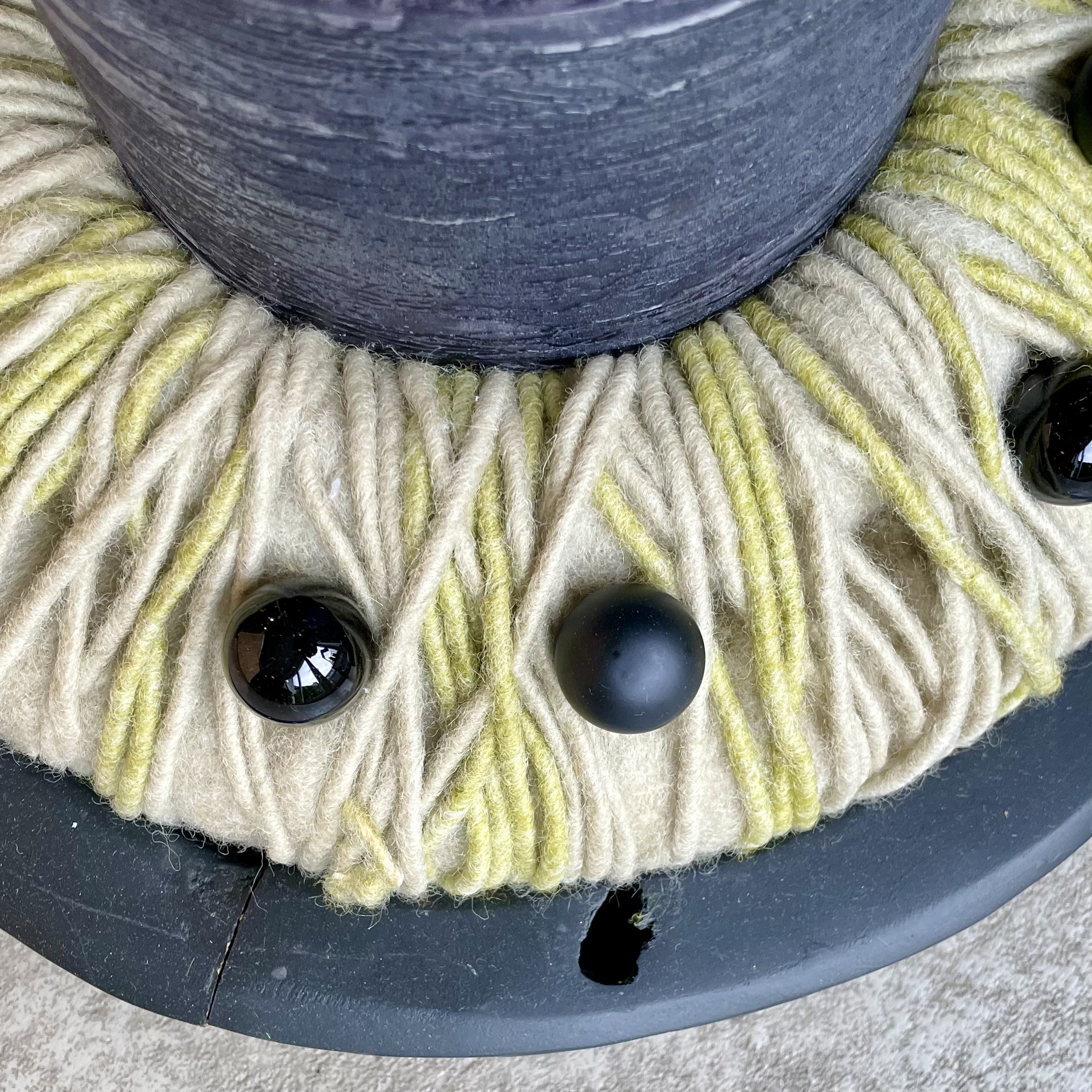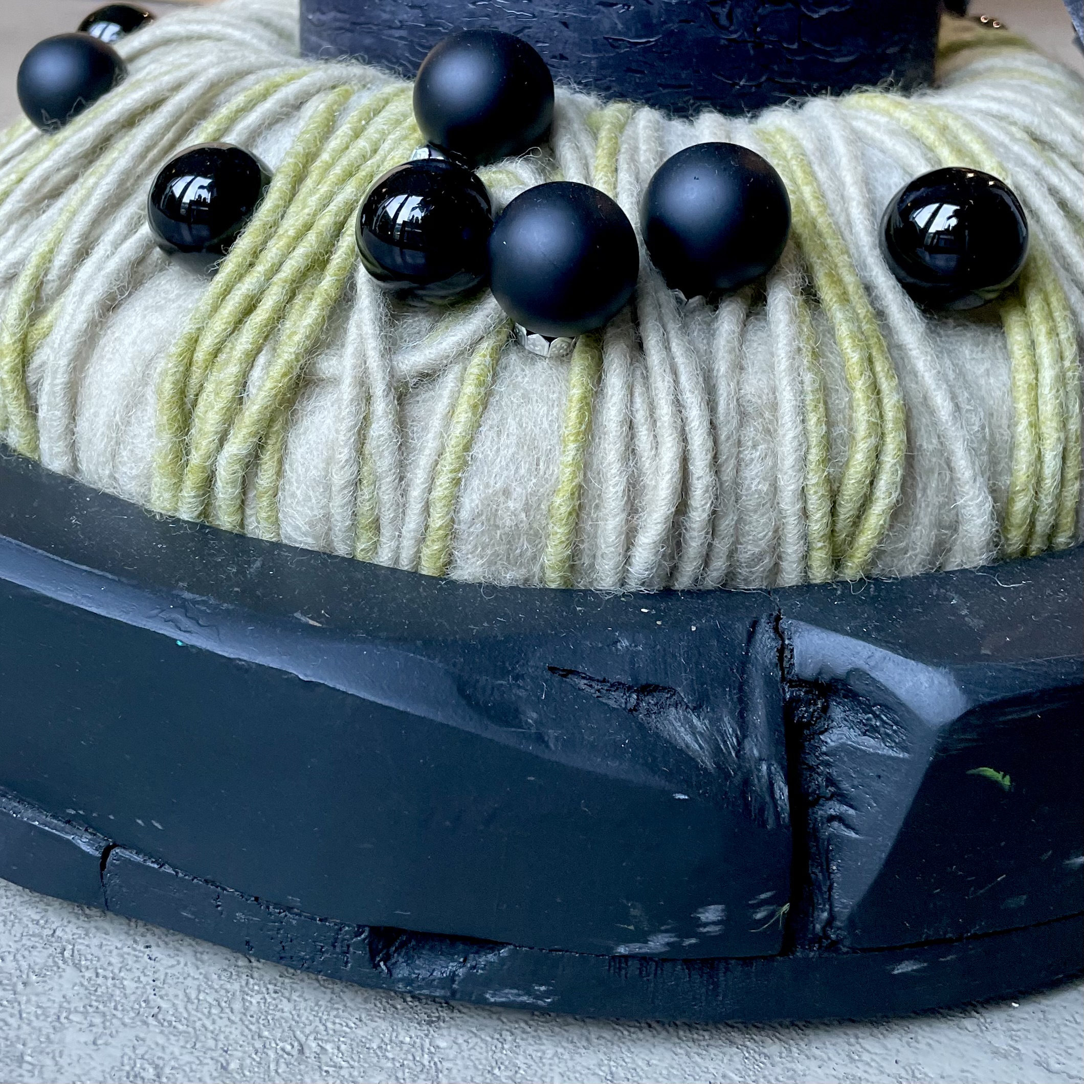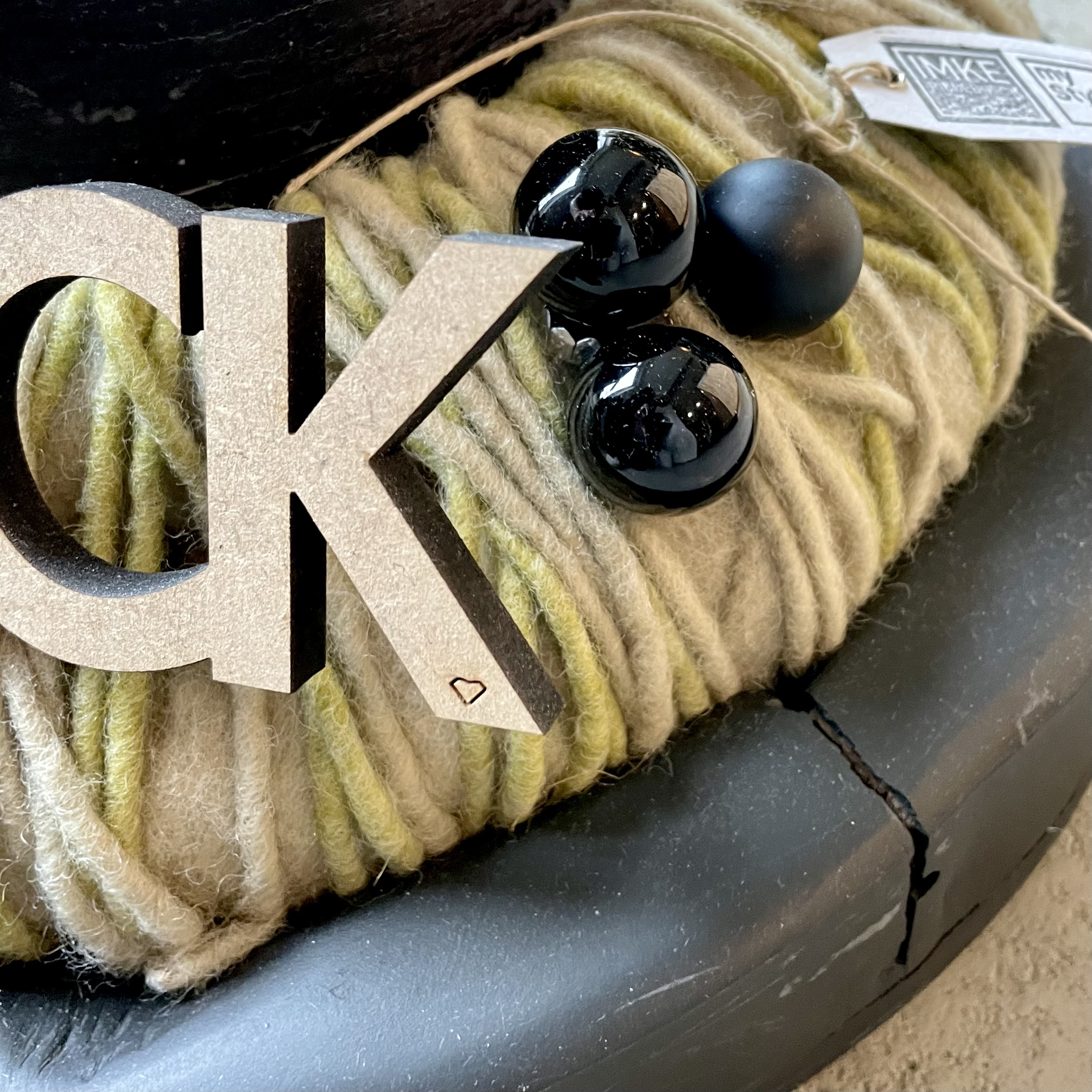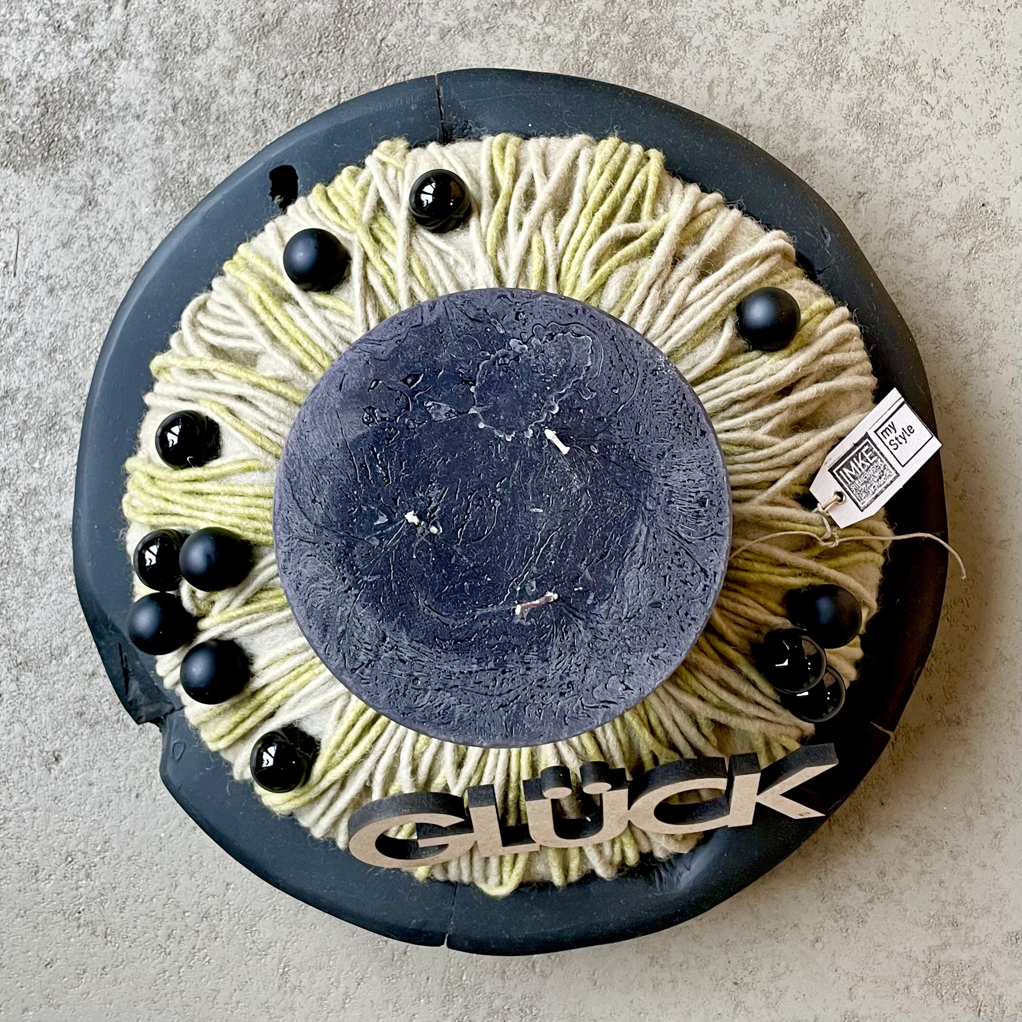 Ein gemütlicher Glückskranz! Rustikales Holztablett, Lehnerwollekranz umwickelt mit Wollbändern, Schriftzug Glück, kleine schwarze Kugeln und eine Dreidochtkerze gehören zu dieser Gestaltung.