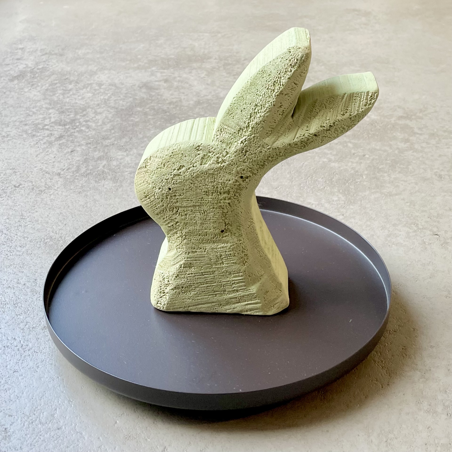 Dieses Tablett ist ein echter Blickfang zu Ostern. Ob Eier, Kuchen oder deftige Snacks, mit diesem Tablett auf dem Tisch wird alles zum Highlight. Metallteller auf drei Kugelfüßen mit Holzhasen sägerauh verschraubt.
