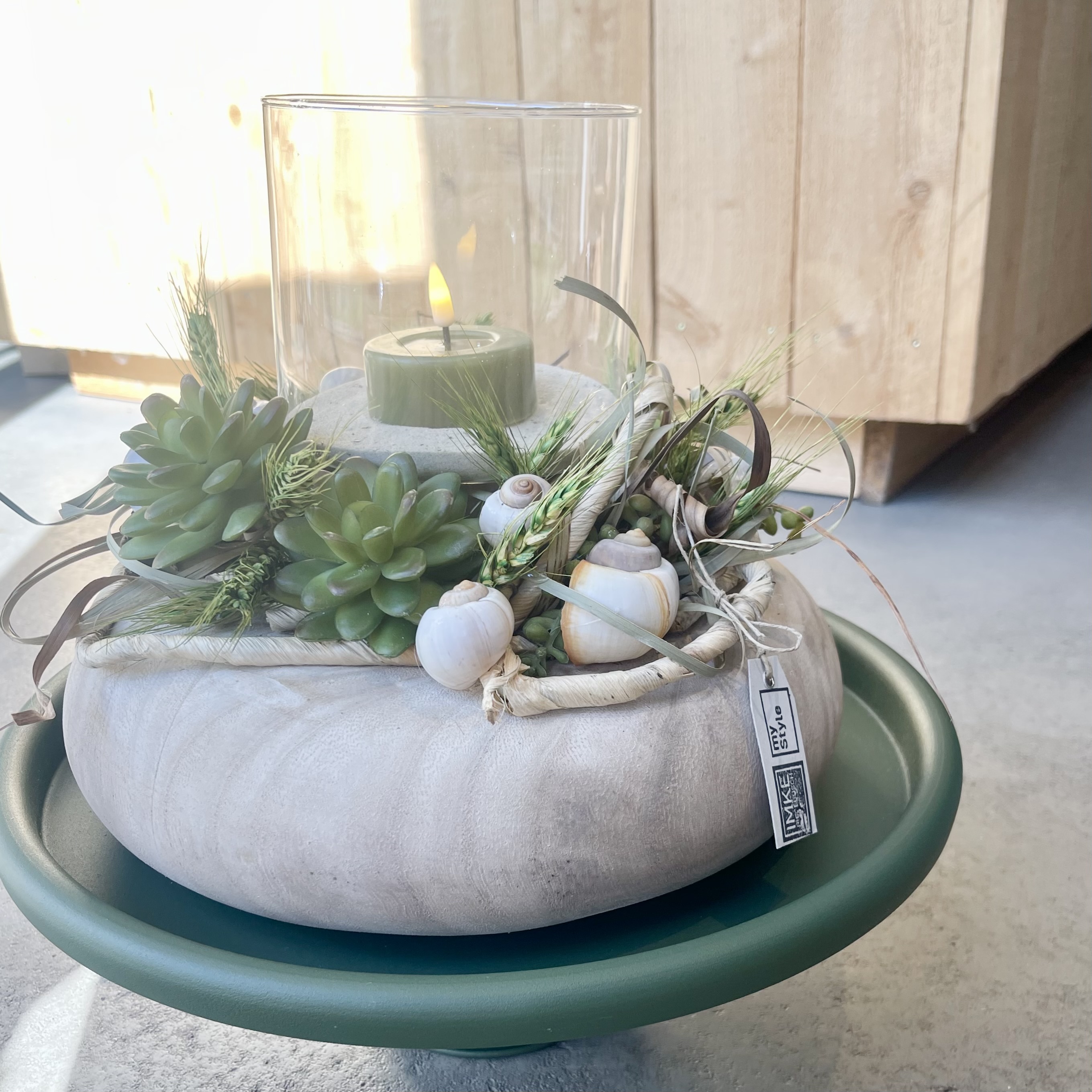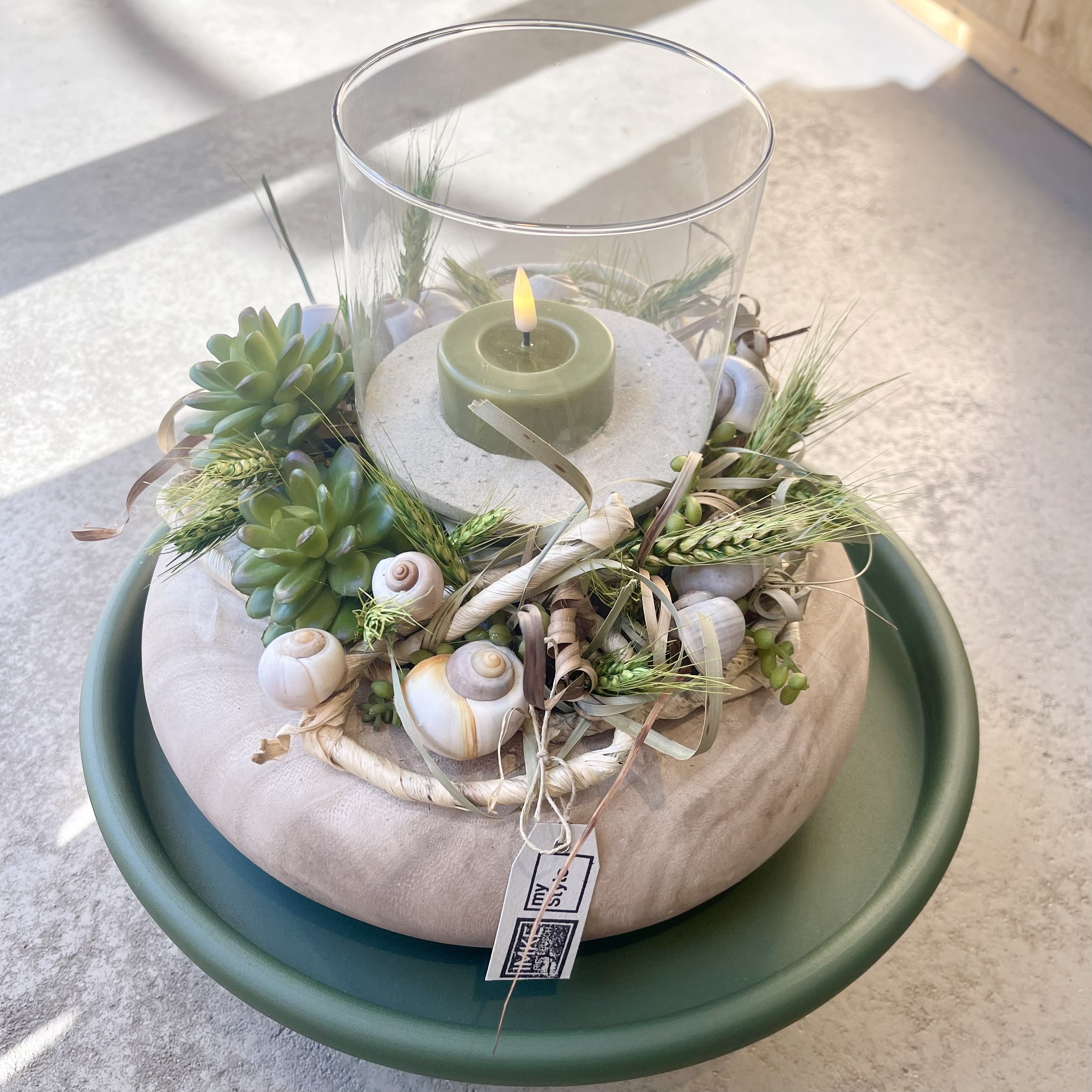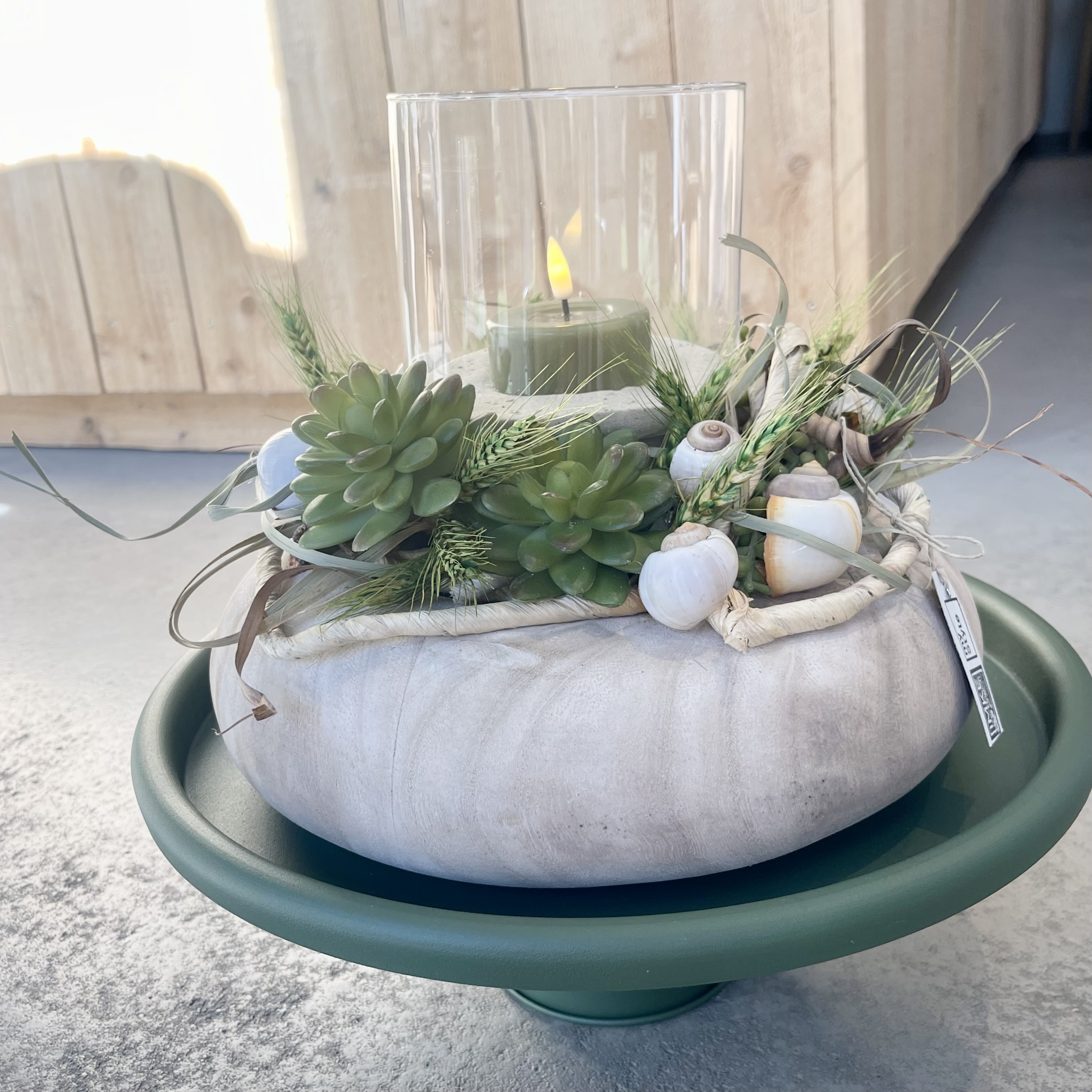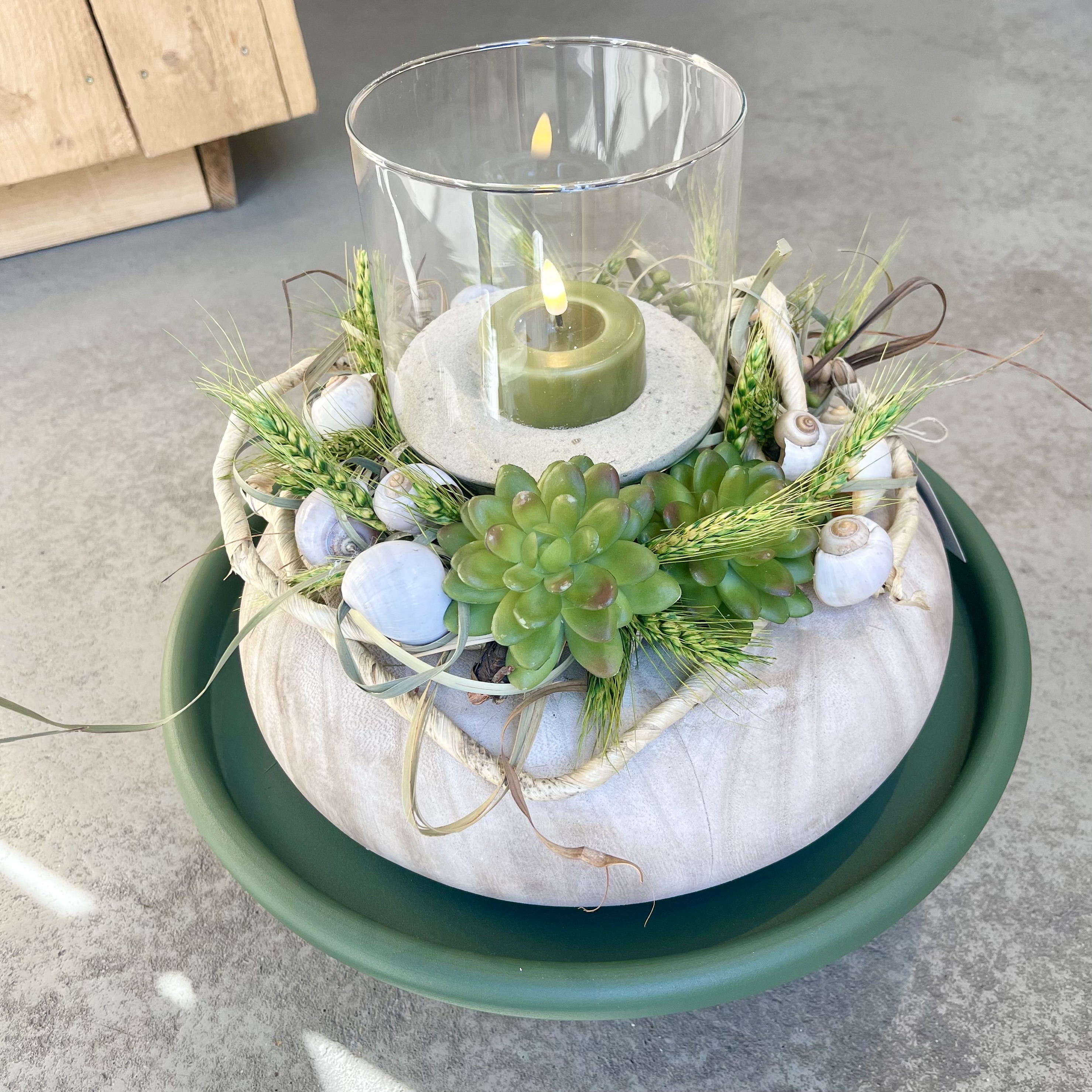 auf Tablett, Windlicht und LED-Wachs- Teelicht.