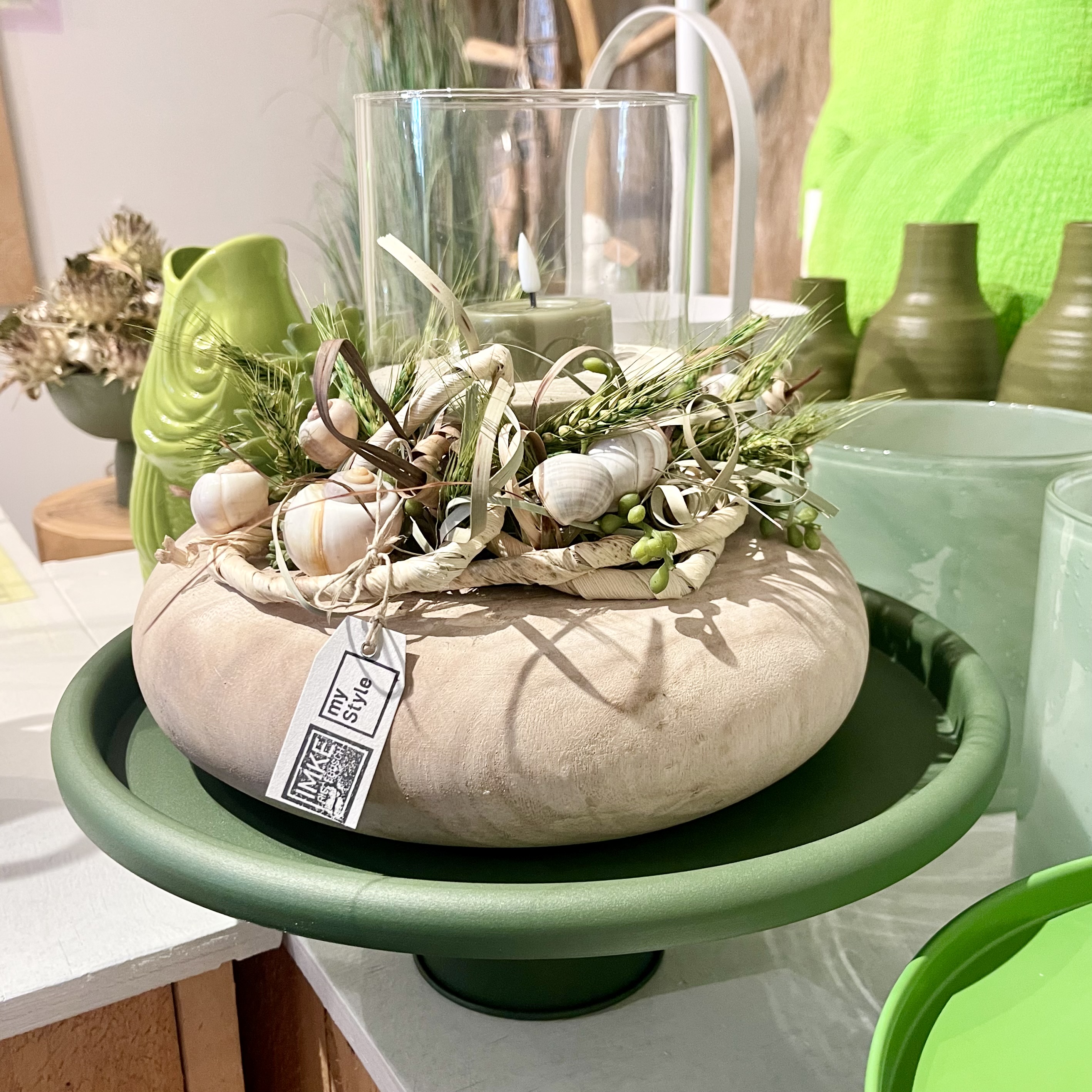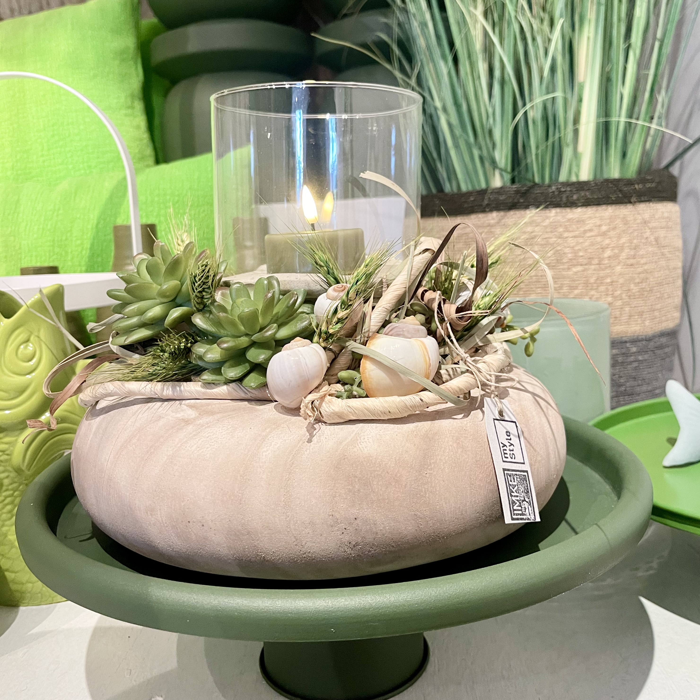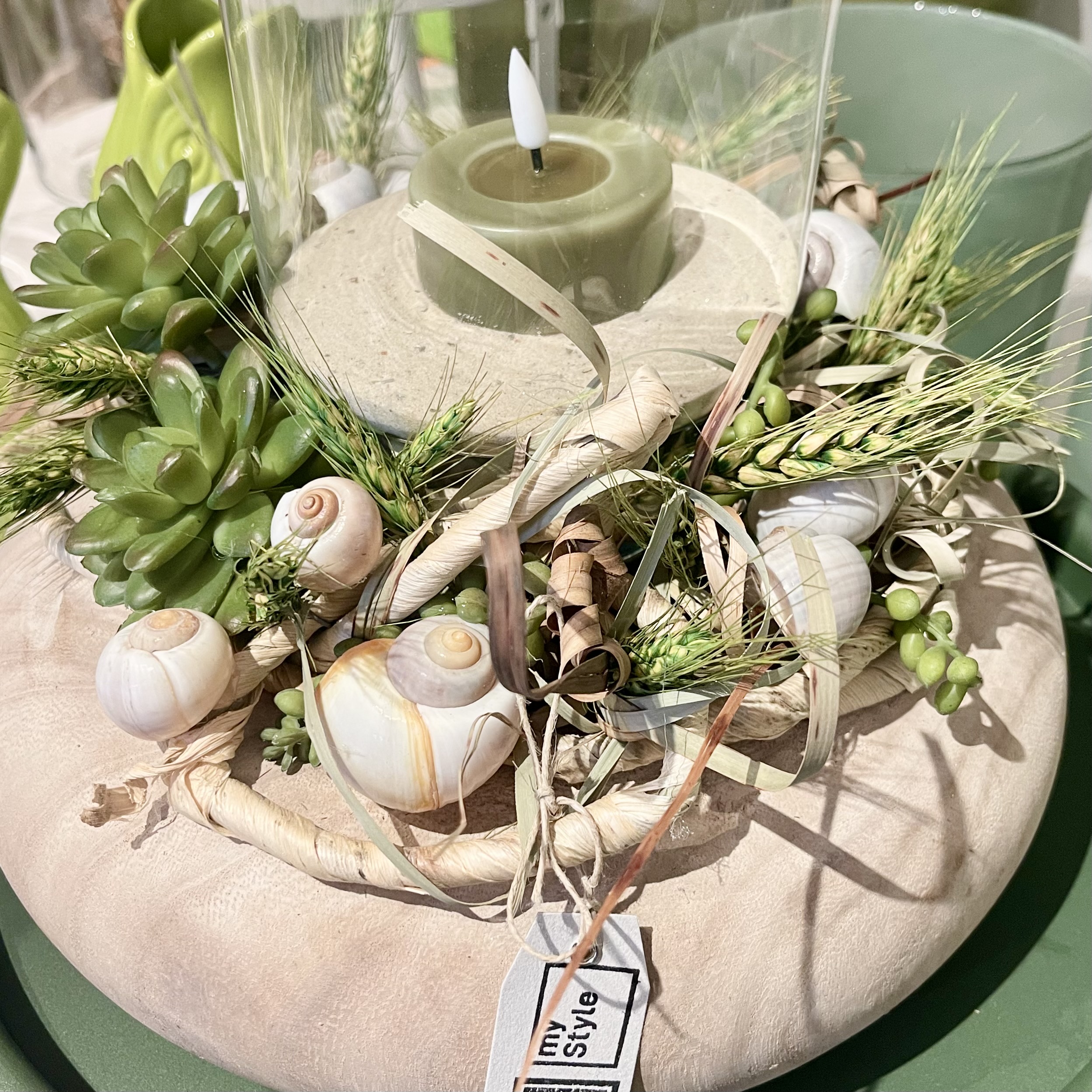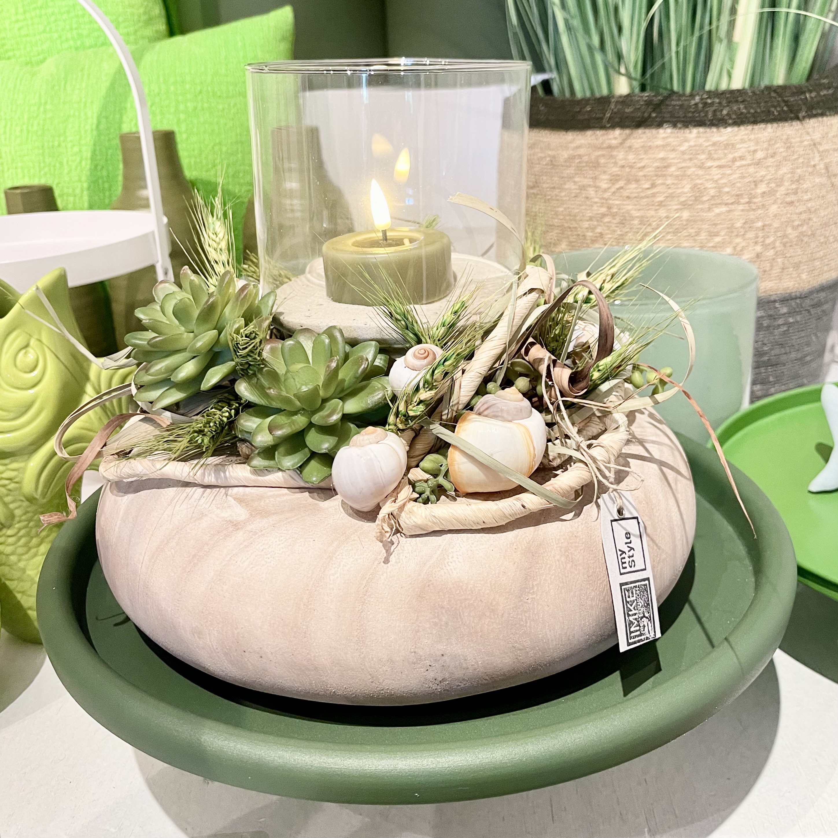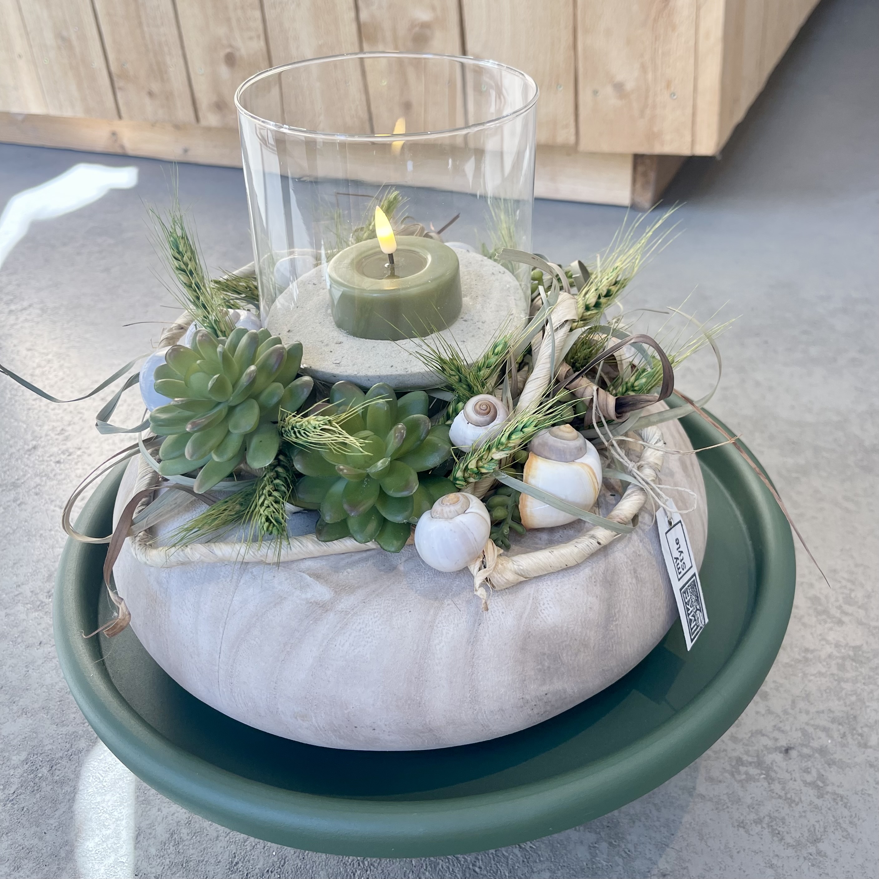 auf Tablett, Windlicht und LED-Wachs- Teelicht.