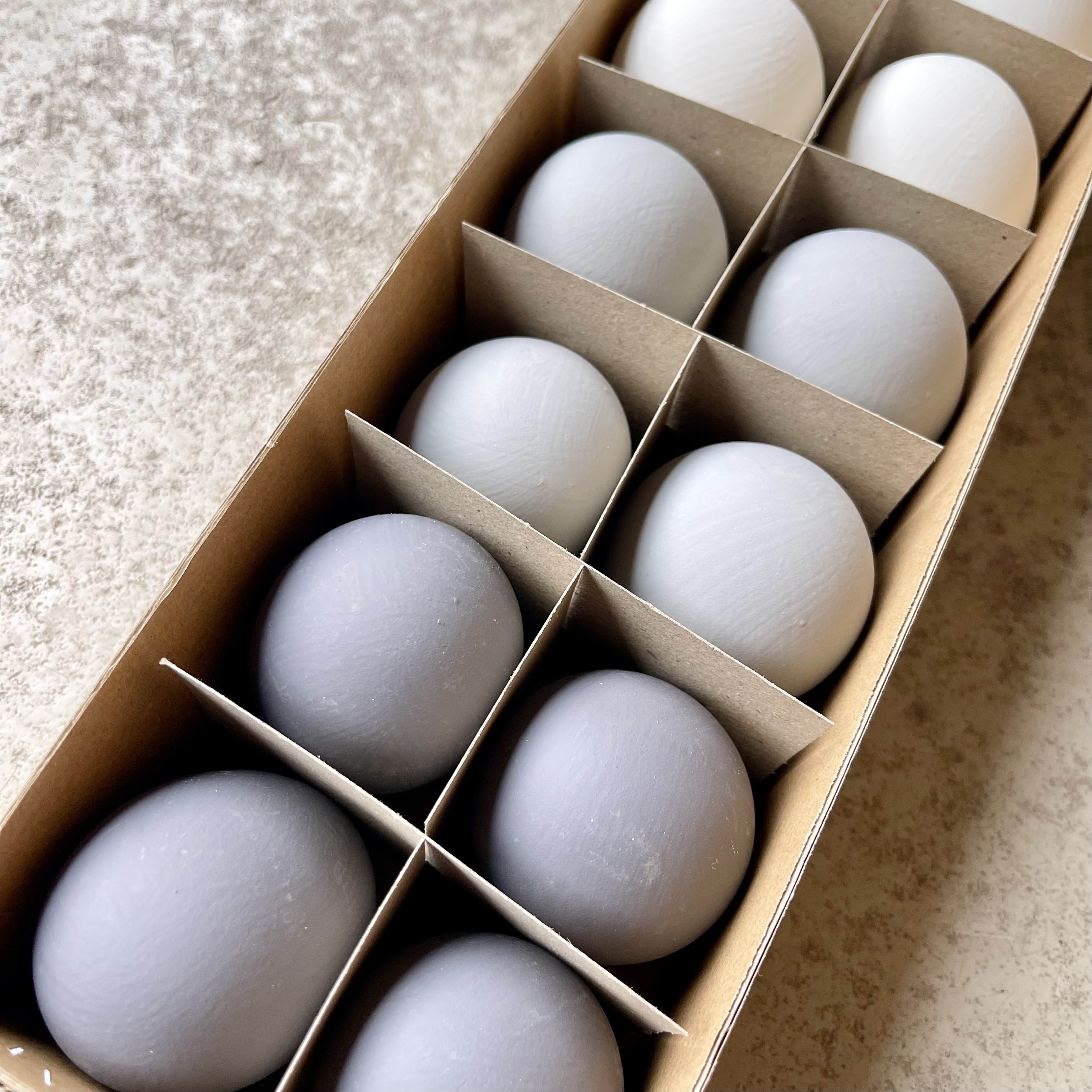 Typisch Nordstil, klarer Look in matt grau Nuancen, 12 Hühnereier zum Hängen,
