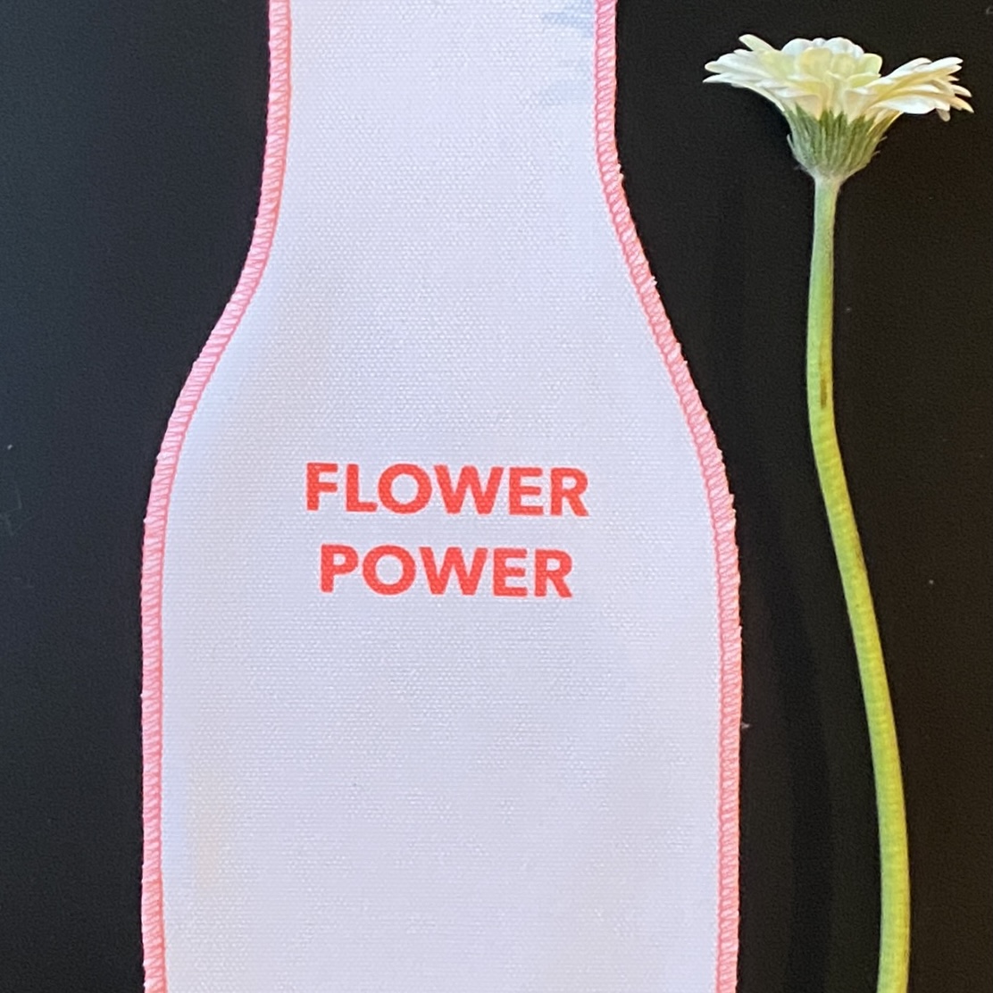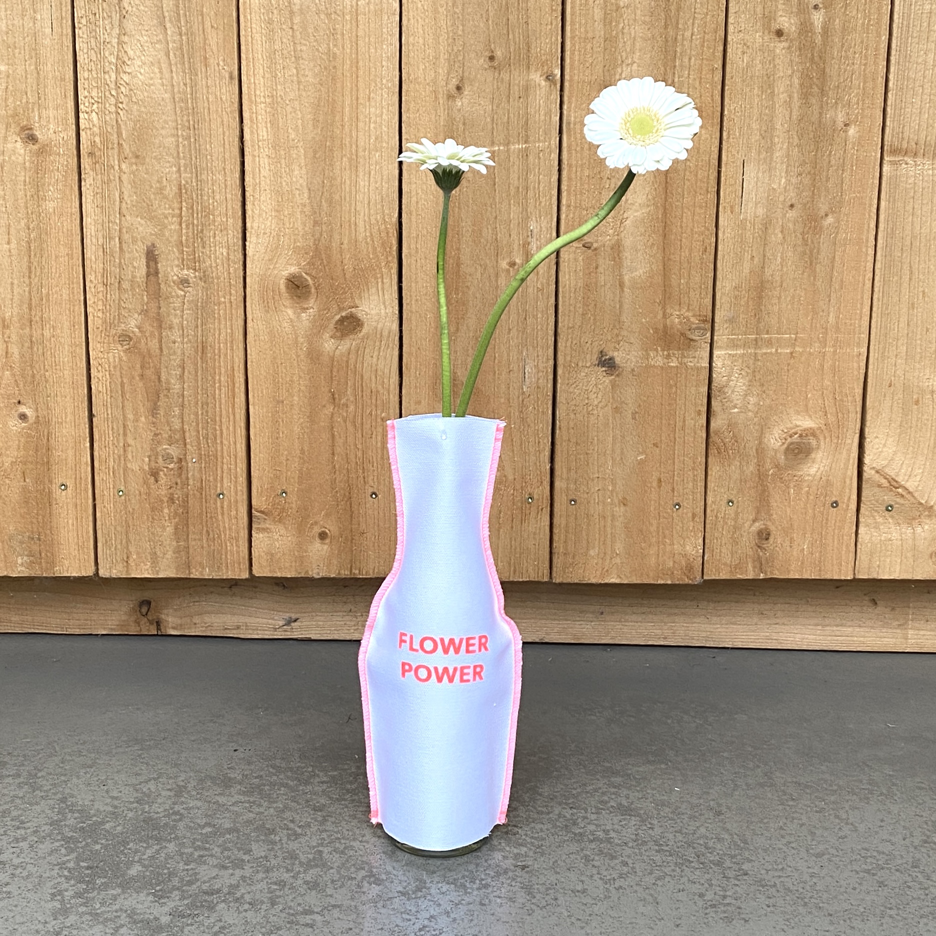 Flaschenhusse aus Canvas-Stoff in Weiß mit Nähten und Druck in NeonRot, offenkantig verarbeitet. Das rustikale Kleid macht aus einer vollen Flasche eine Geschenkverpackung und aus einer leeren Flasche eine schöne Dekoration. Höhe 30cm.