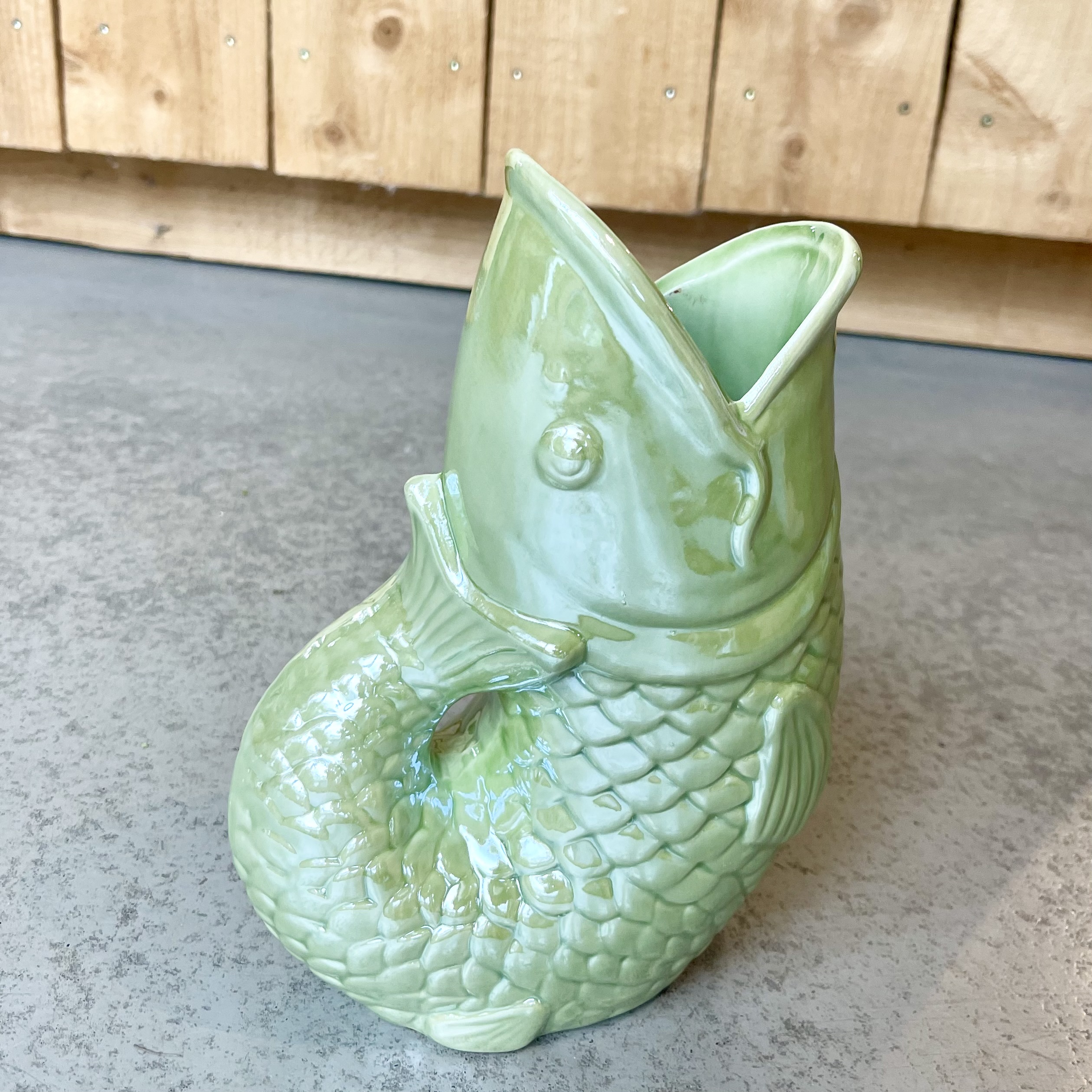 Neue Fischvase in Keramik, softgrün schimmernd, leicht irisierend, wunderschön.