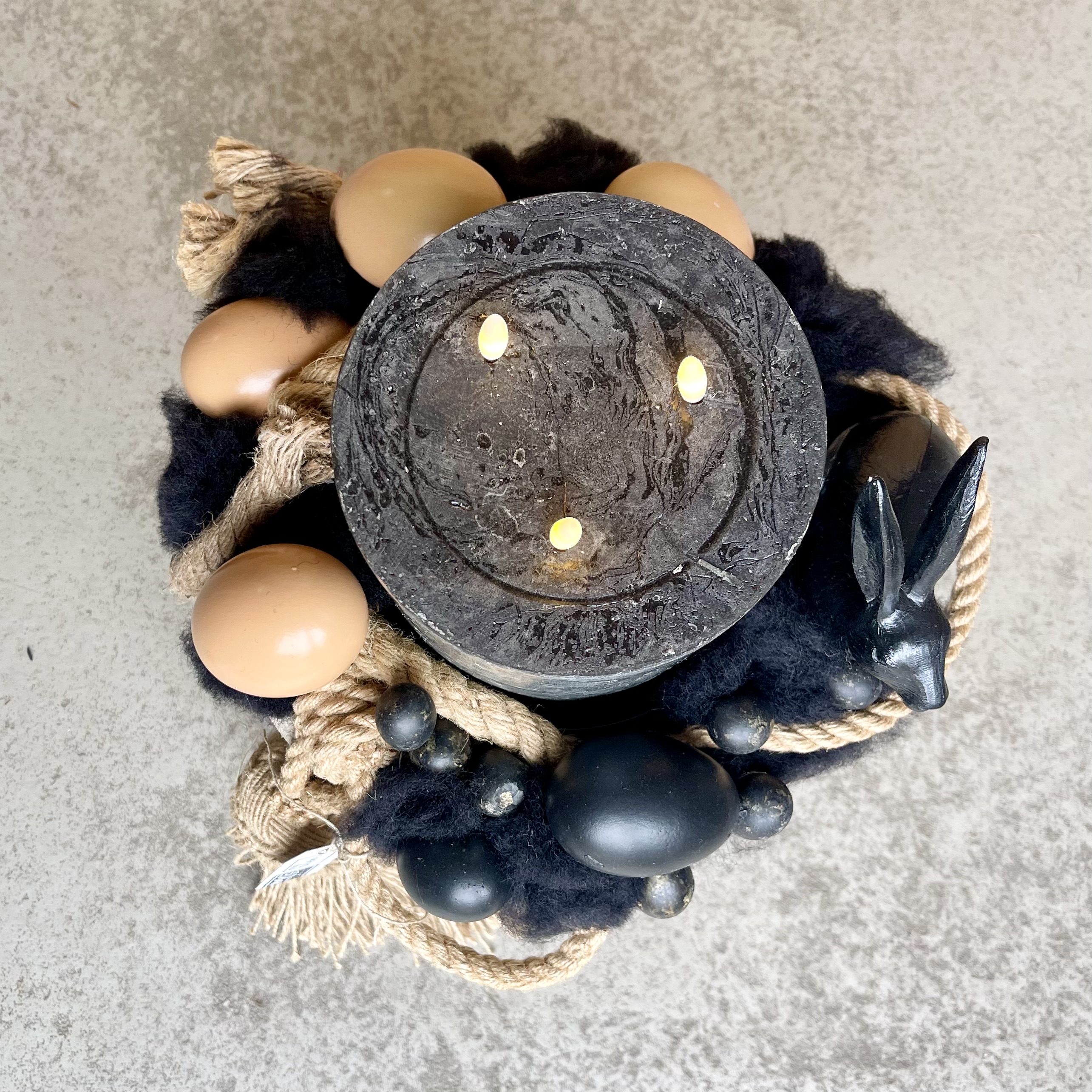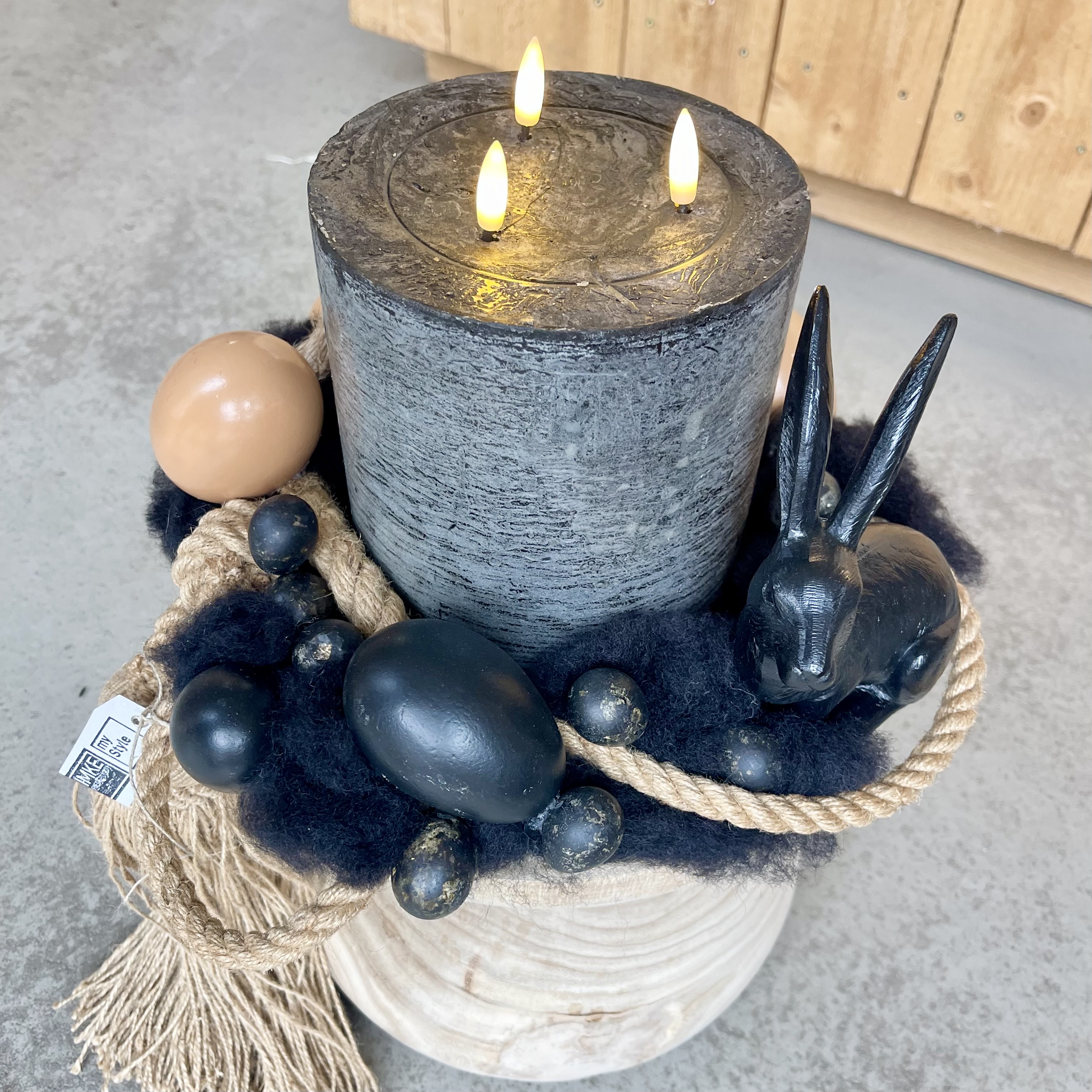 Individueller Kerzenblock aus hellem Holz, mit schwarzer Dreidocht-Kerze, Eiern und schwarzem Hasen rechts sitzend im Osterarrangement, die dicke Quaste links arrangiert ist der Eycatcher.