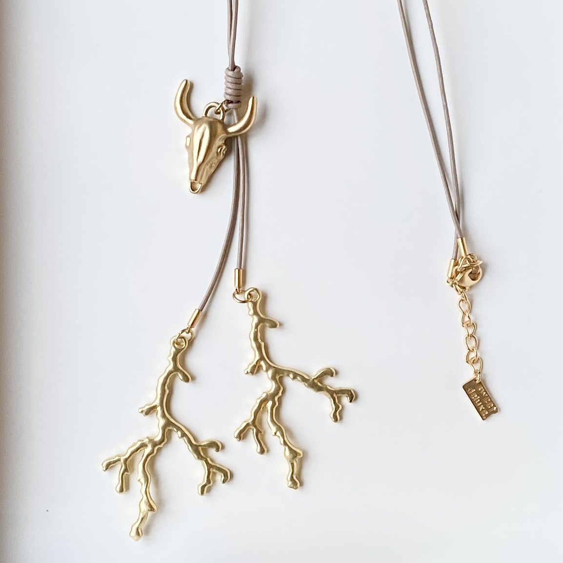 Kette mit angenehmen Lederhalsband, goldener Bullen- und Korallenanhänger.