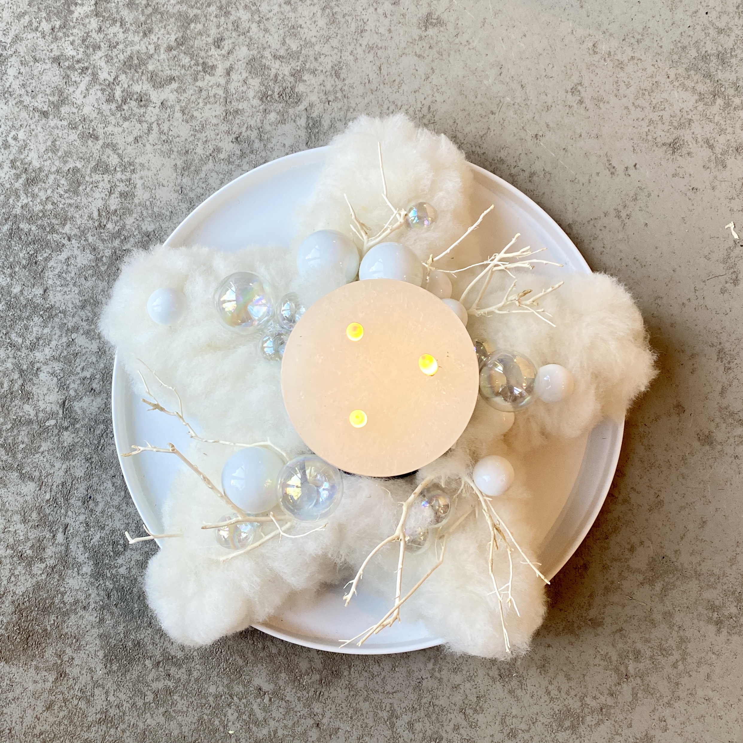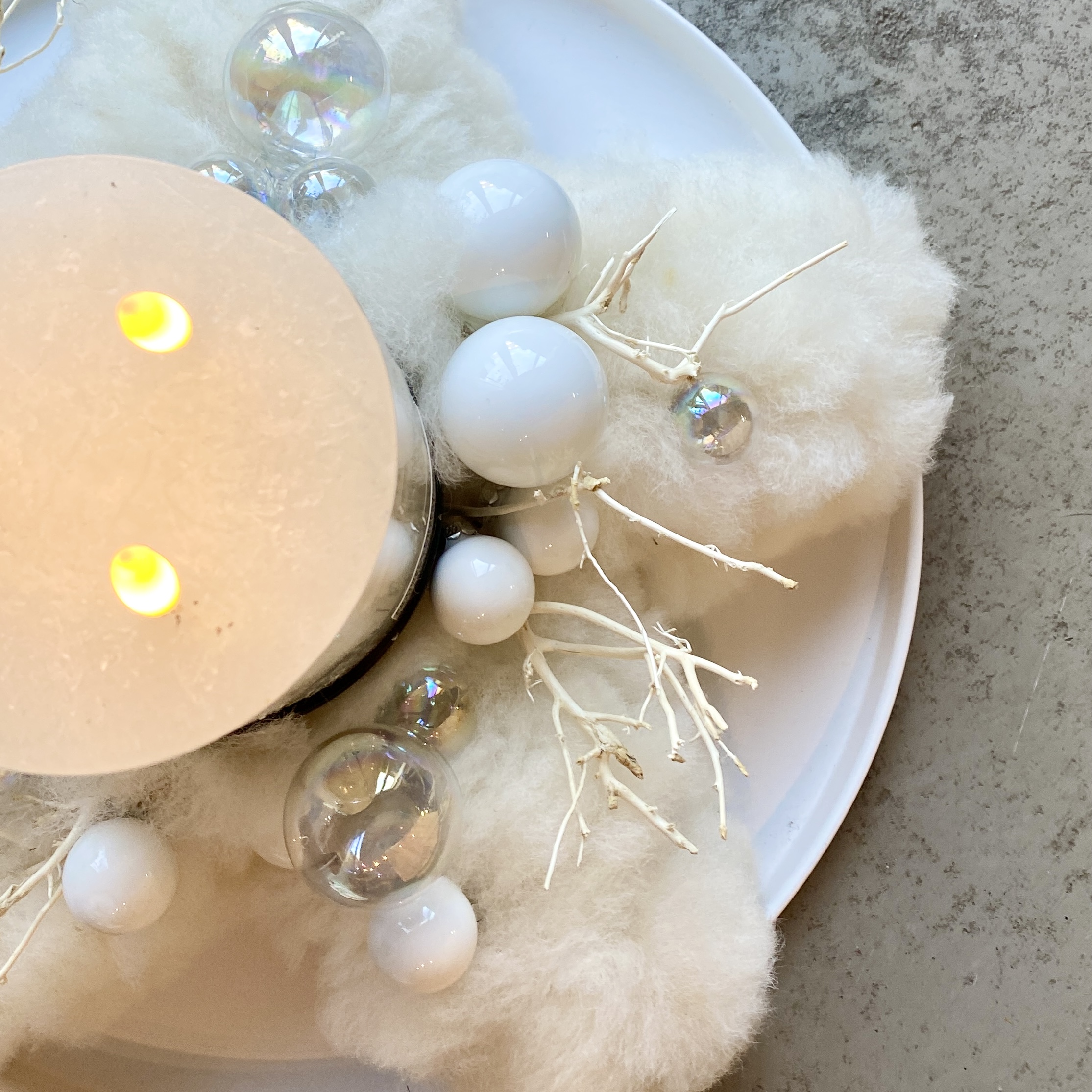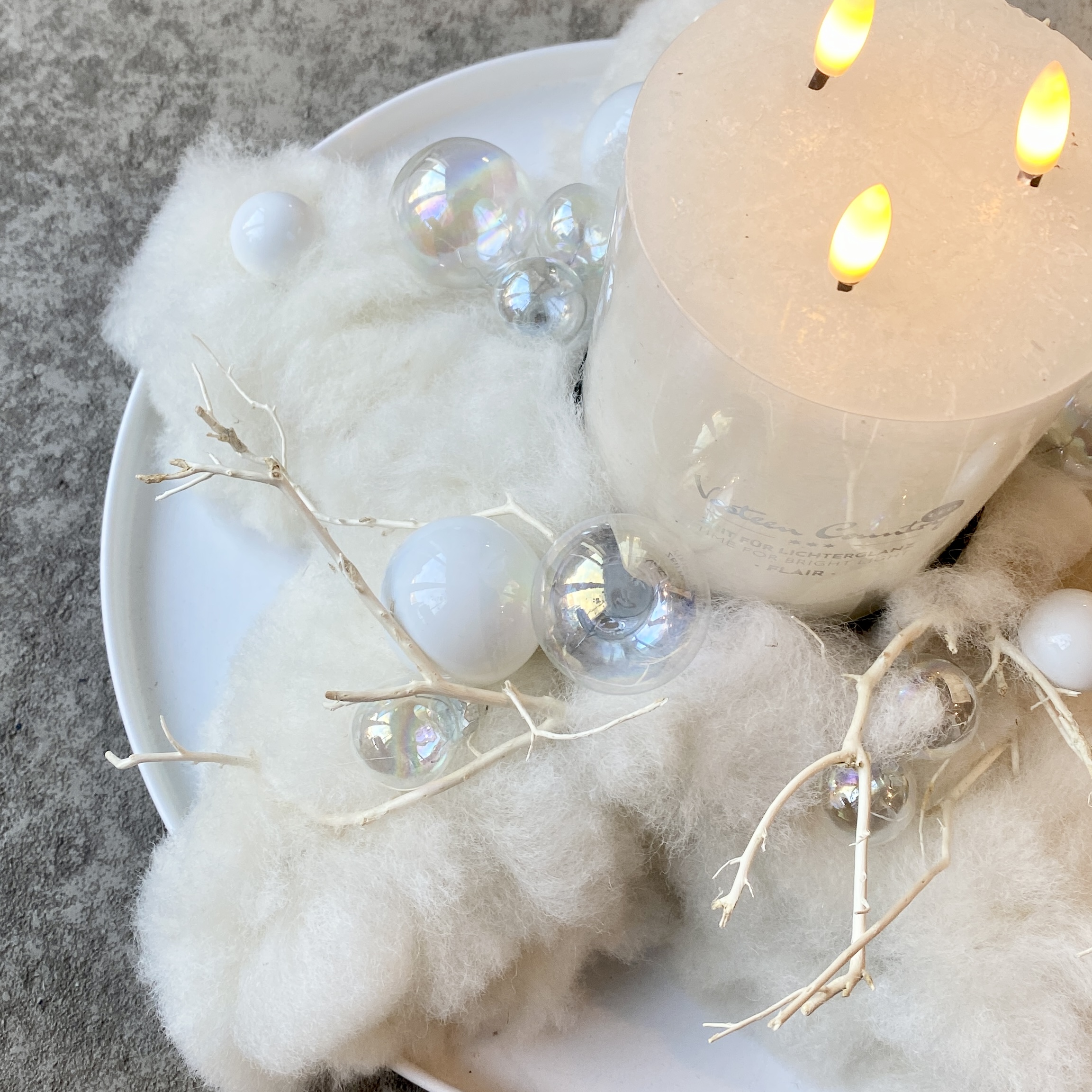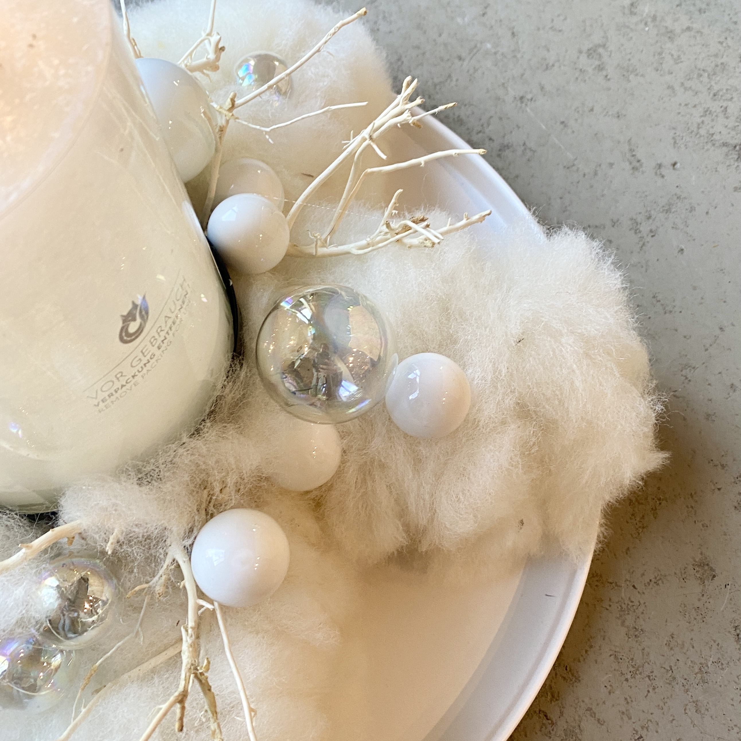 Stern aus Steckmasse mit Lunte-Wolle in Weiß, Glaskugeln in verschiedenen Größen in Weiß und irisierend, gebleichtem Geäst, 3 Docht LED-Kerze mit Timerfunktion auf Metalltablett D35cm in Weiß.
