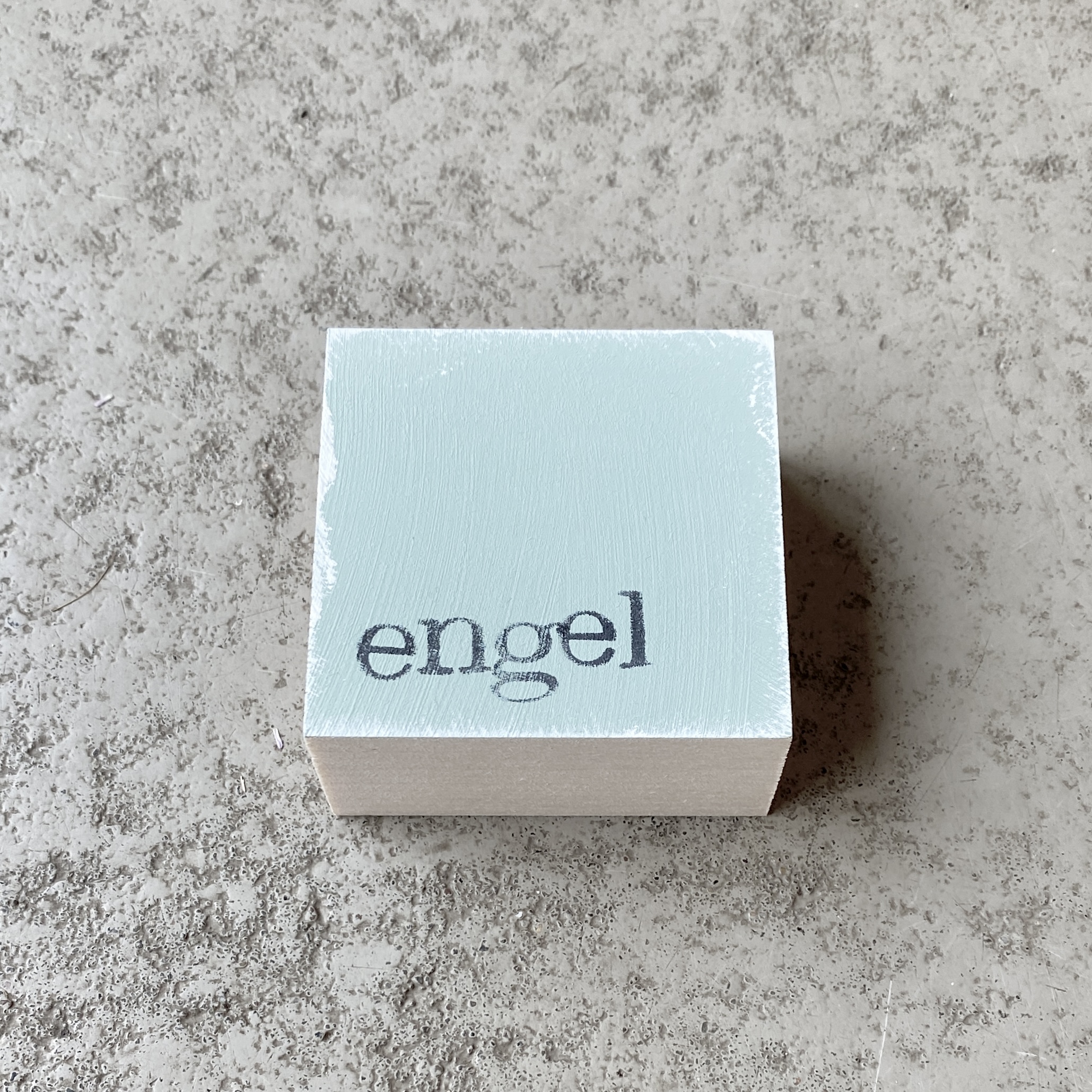 Kleine Textplatte "engel" 6x6cm aus regionalem Lindenholz gesägt und handbestempelt.