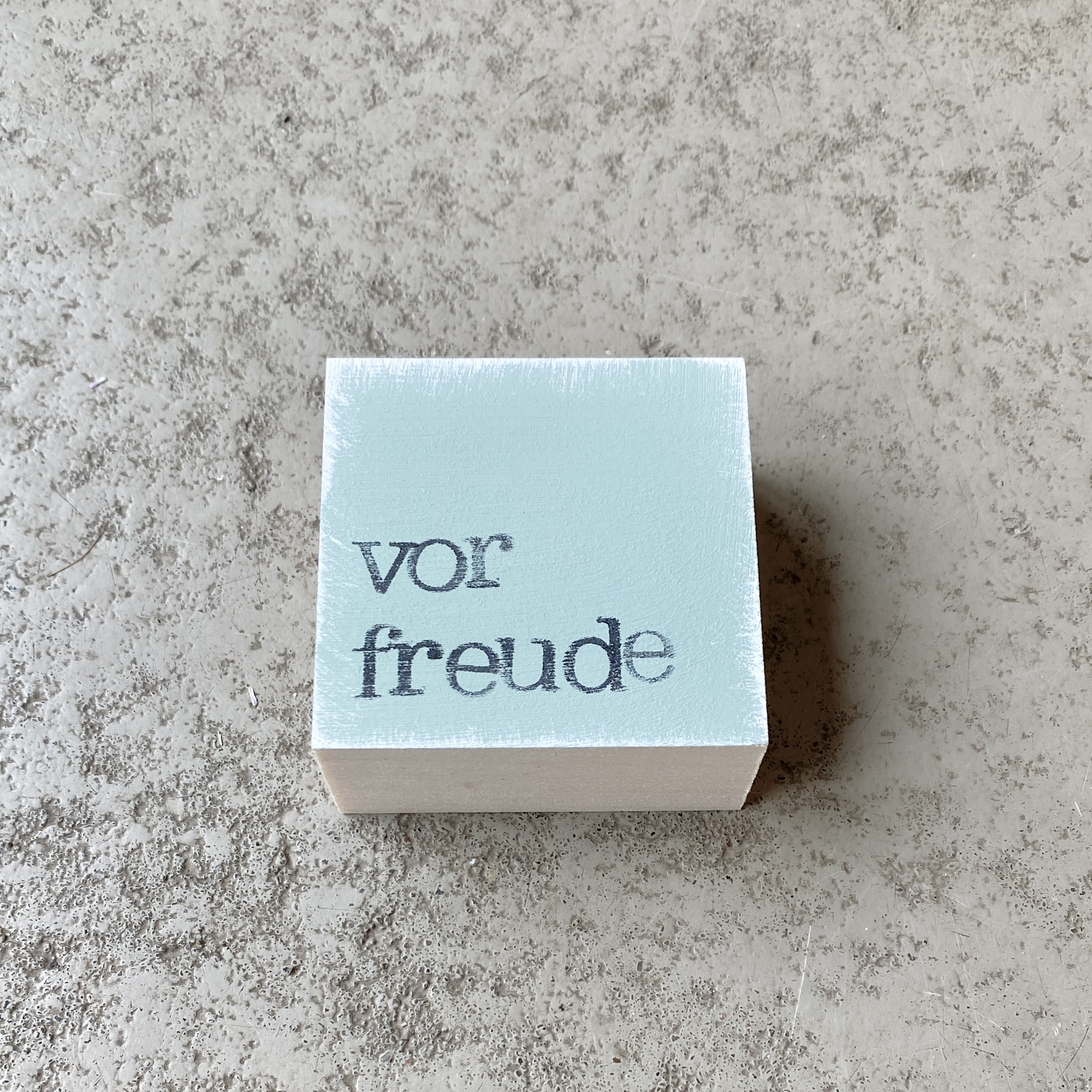 Kleine Textplatte "vorfreude" 6x6cm aus regionalem Lindenholz gesägt und handbestempelt.