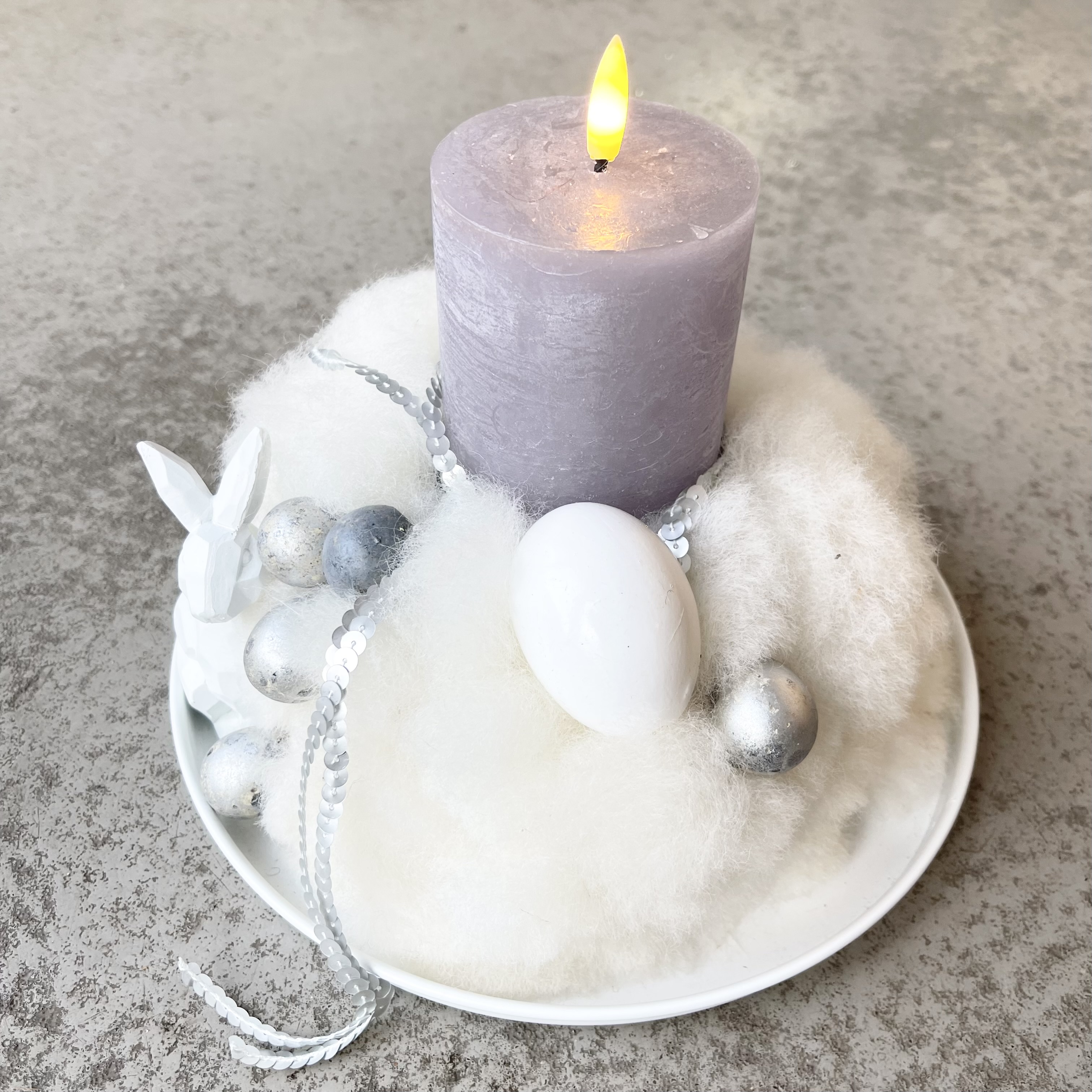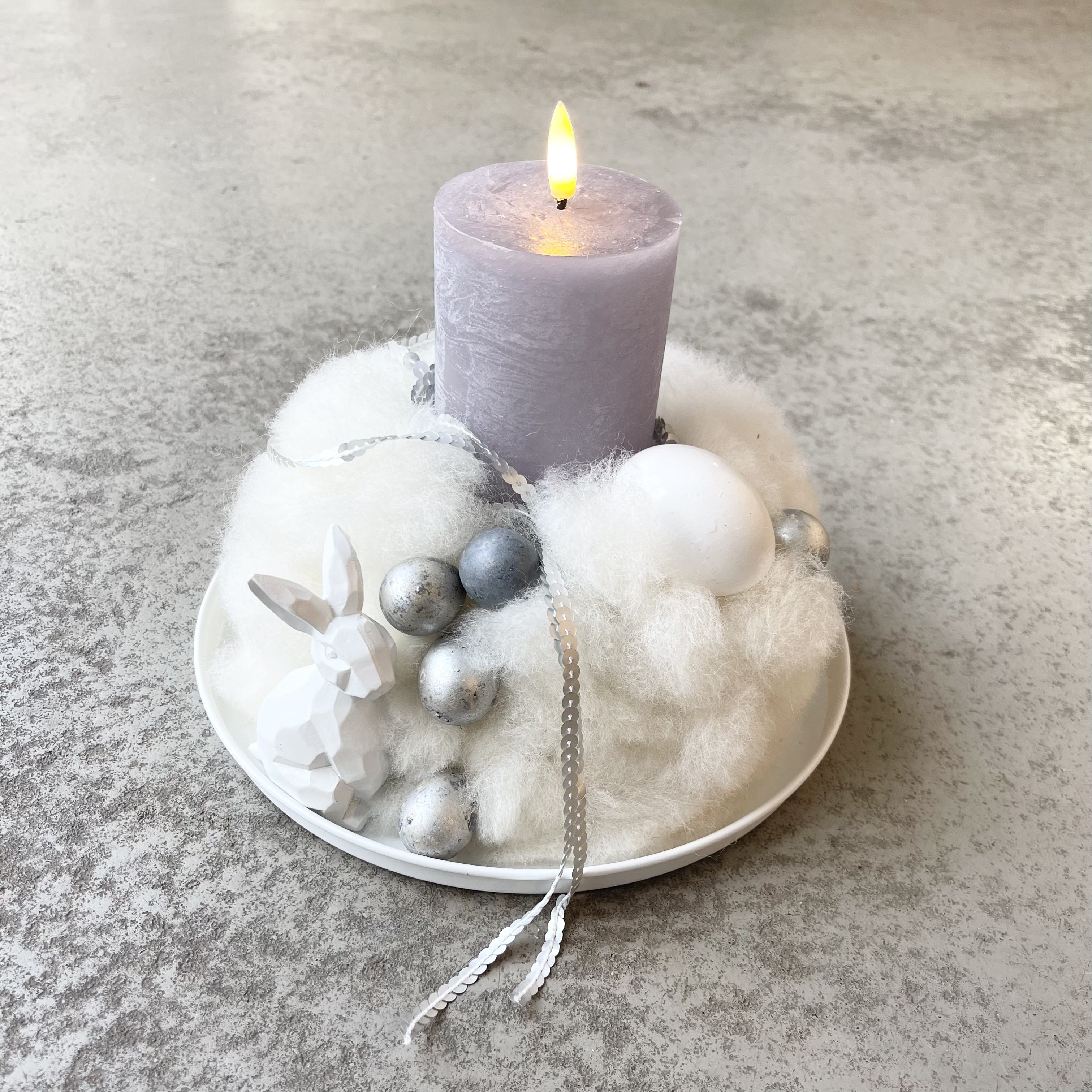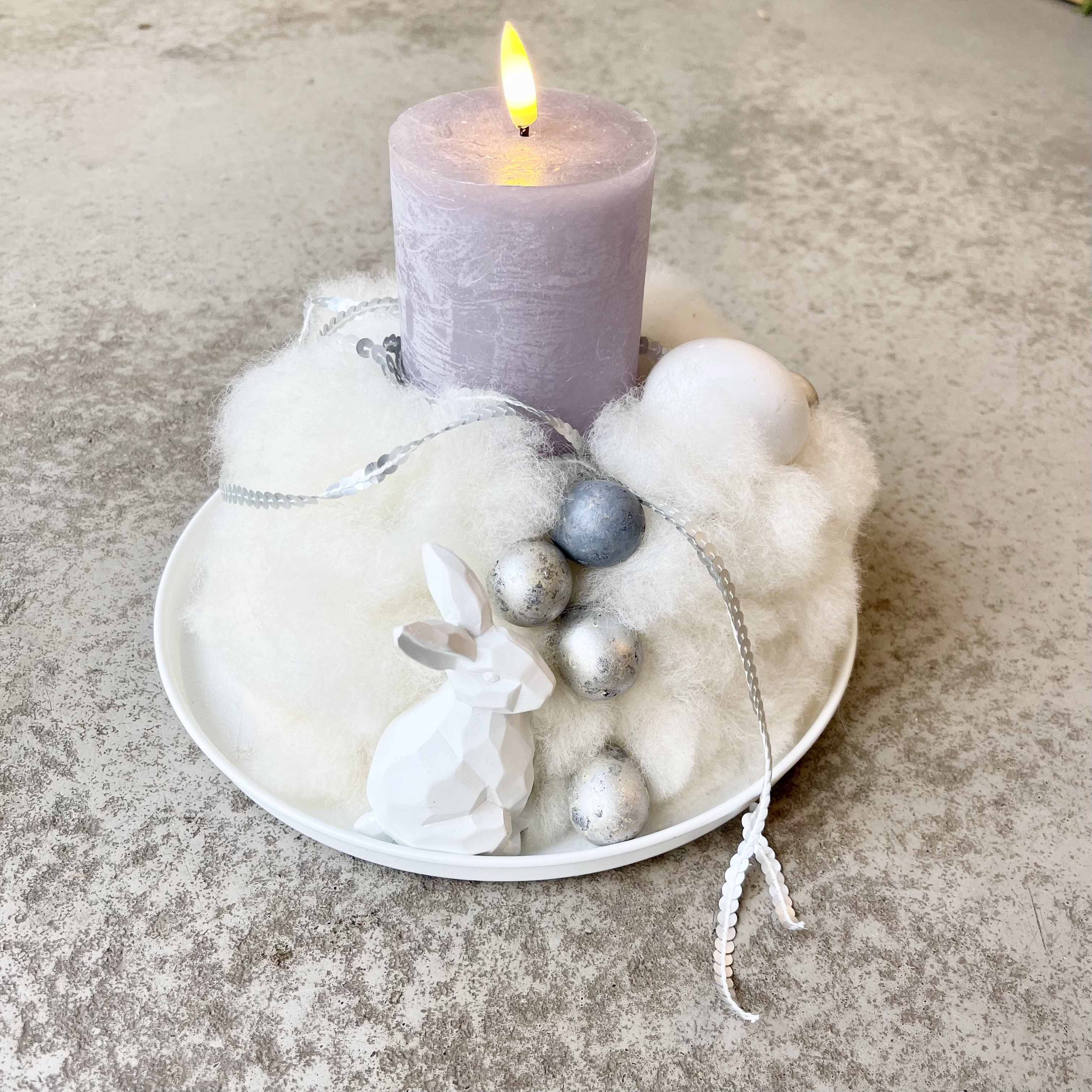 LED-Kerze in Grau mit Timerfunktion, Zierband in Silber auf Metalltablett 25cm in Weiß.