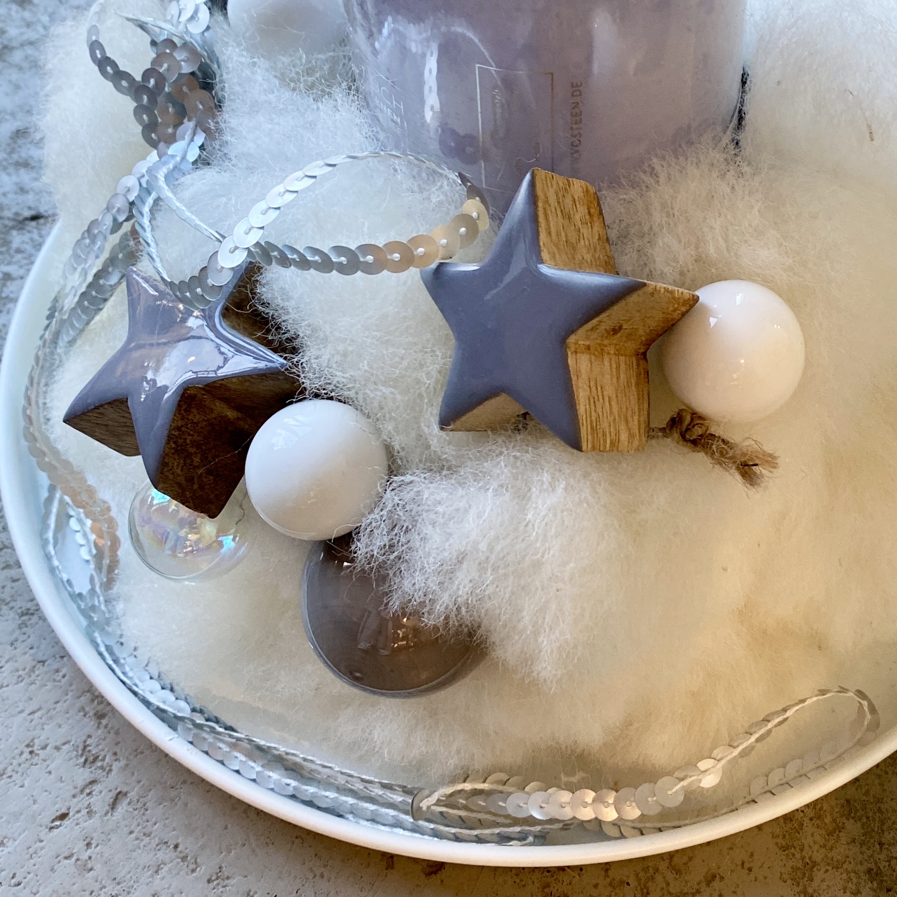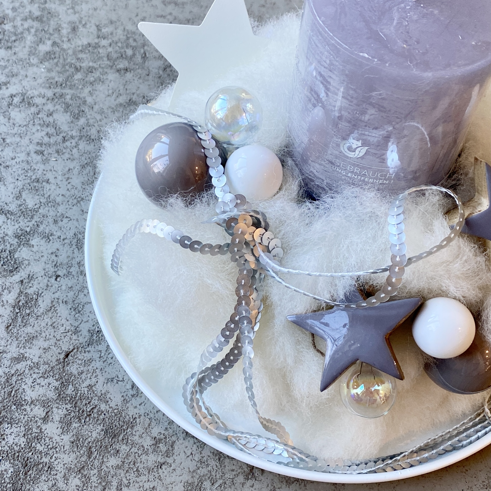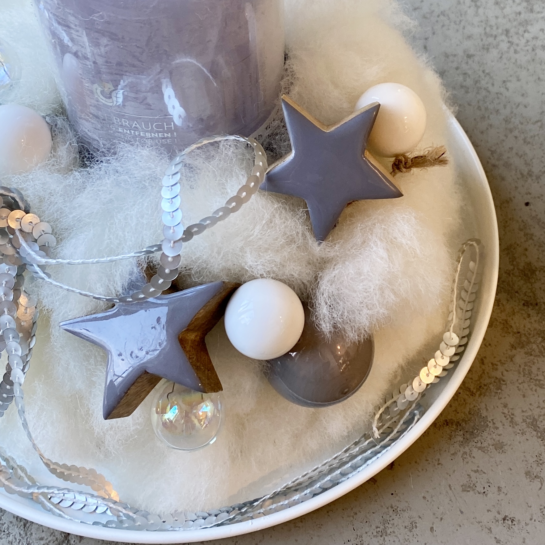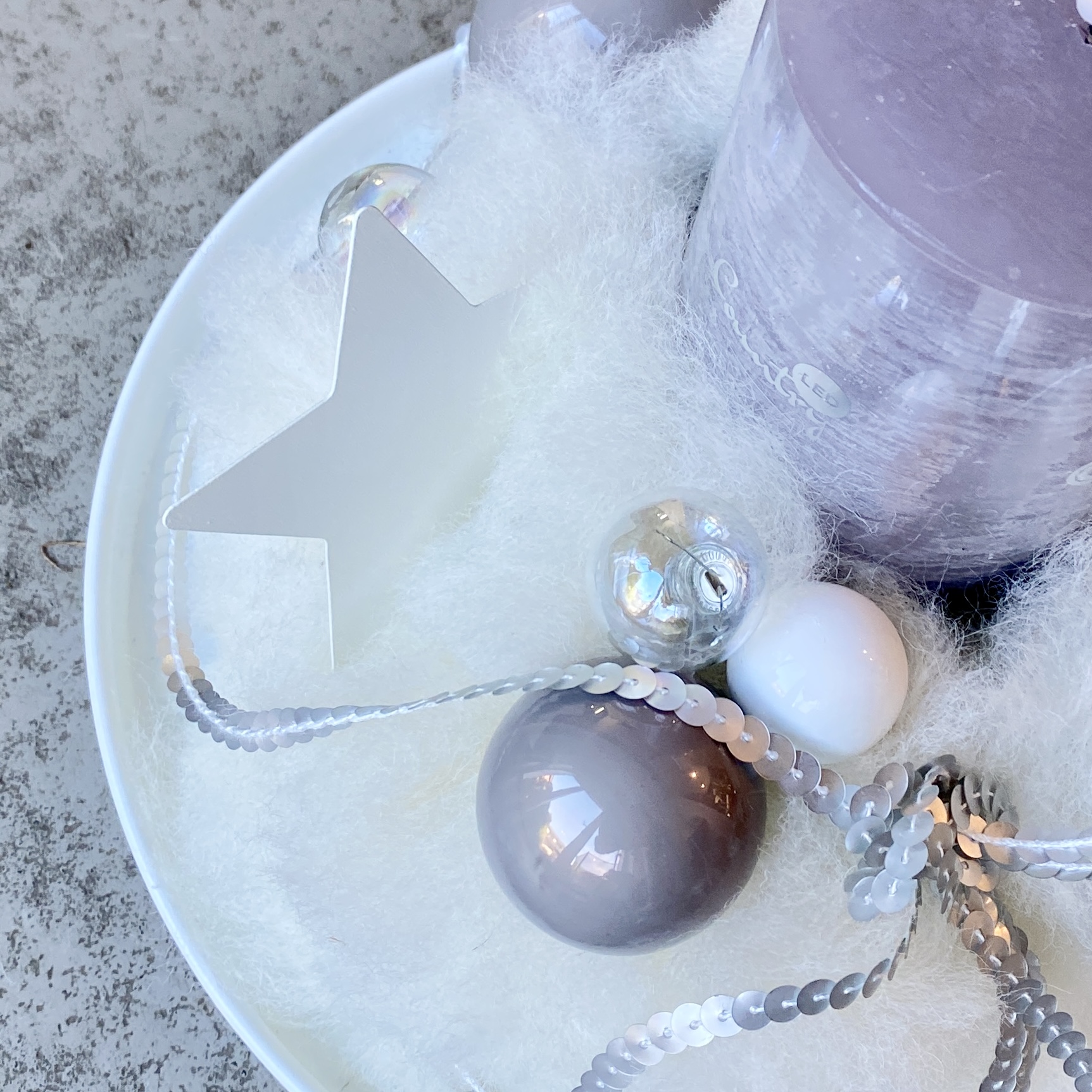 Gesteck aus gezupfter Lunte in Offwhite, verziert mit Glaskugeln in verschiedenen Größen in Weiß und Grau, Stern aus Acryl (oder Metall) und Sterne aus Holz in Taupe, LED-Kerze in Grau mit Timerfunktion, Zierband in Silber auf Metalltablett 25cm in Weiß.