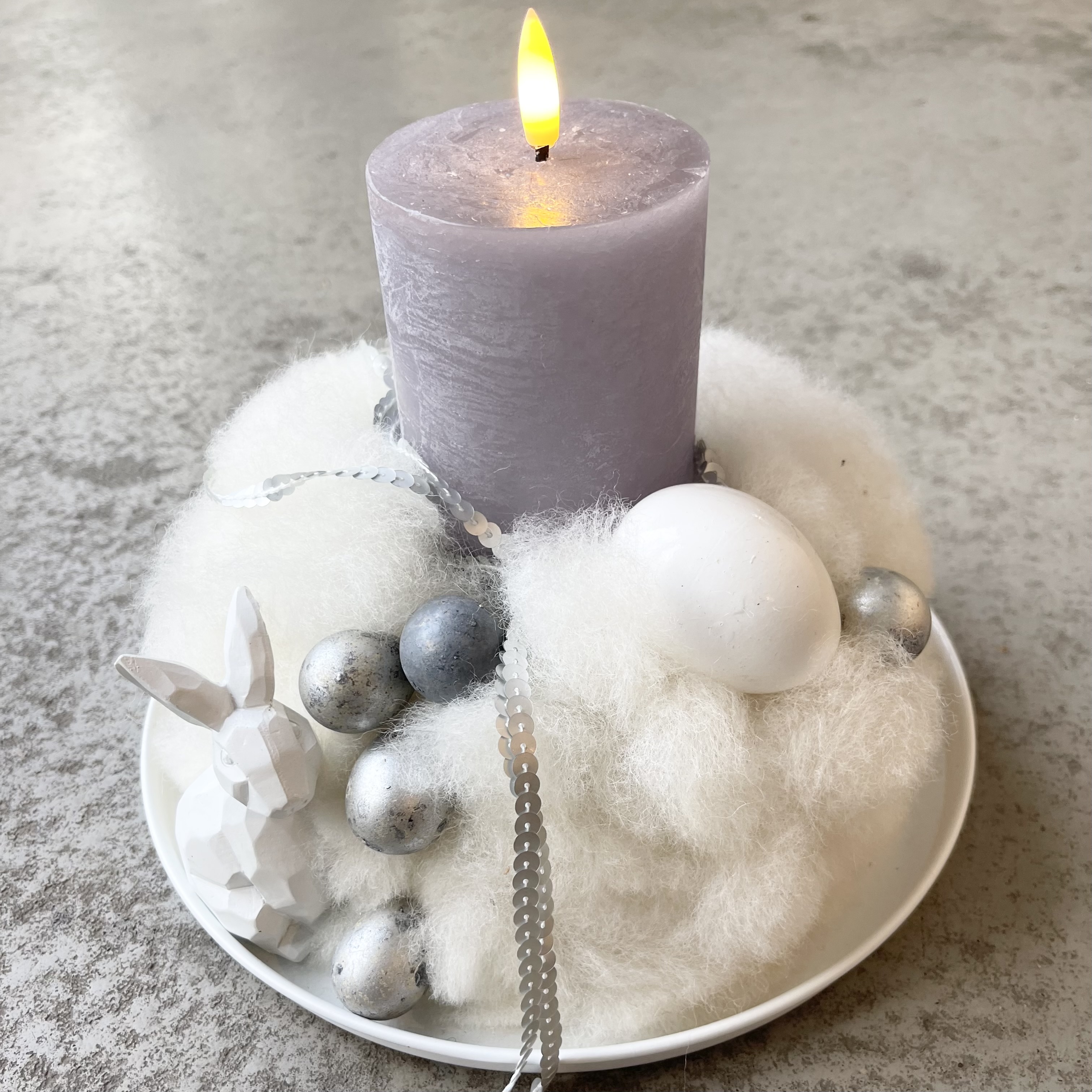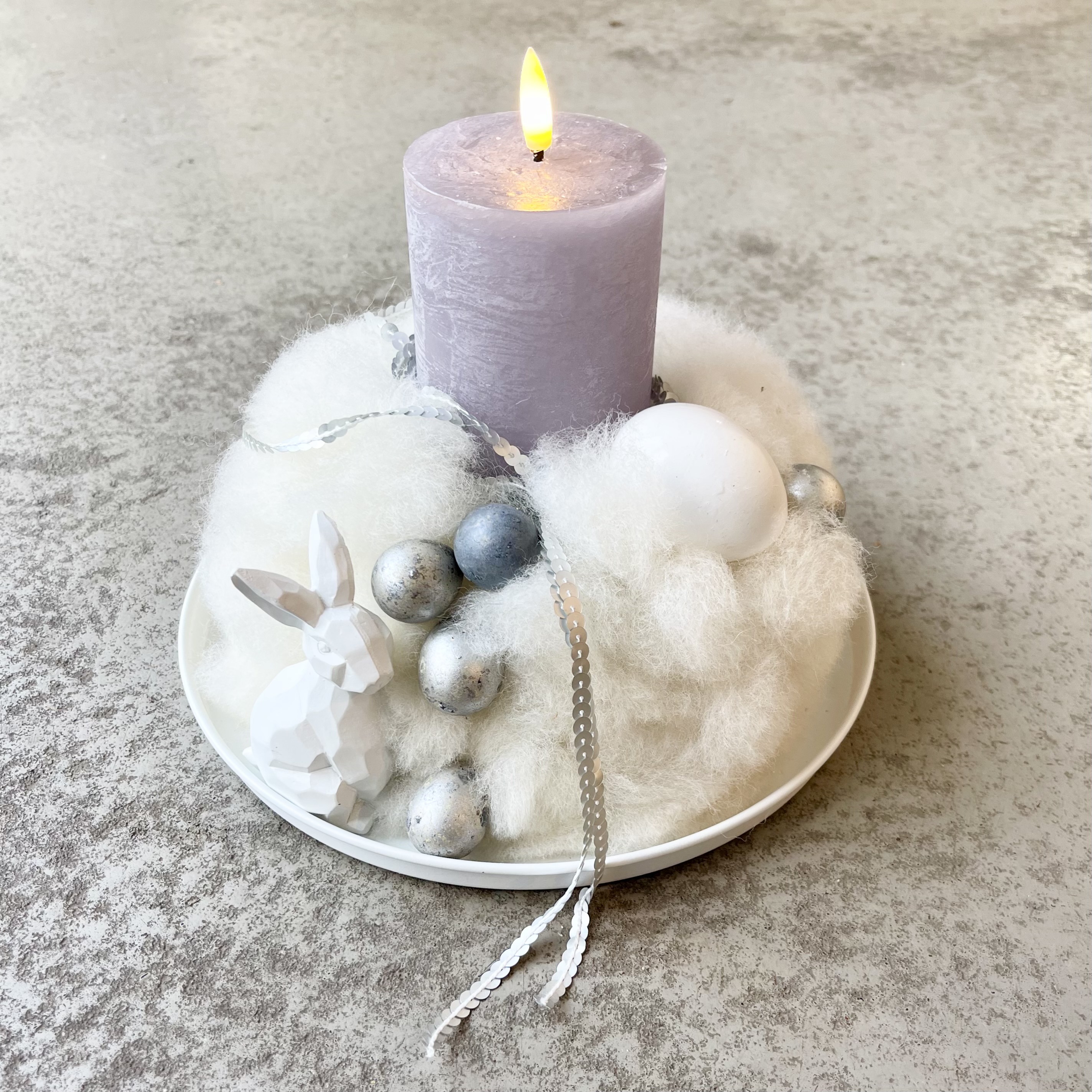 Gesteck aus gezupfter Lunte in Offwhite, verziert mit Eiern in verschiedenen Größen in Weiß und Grau,
