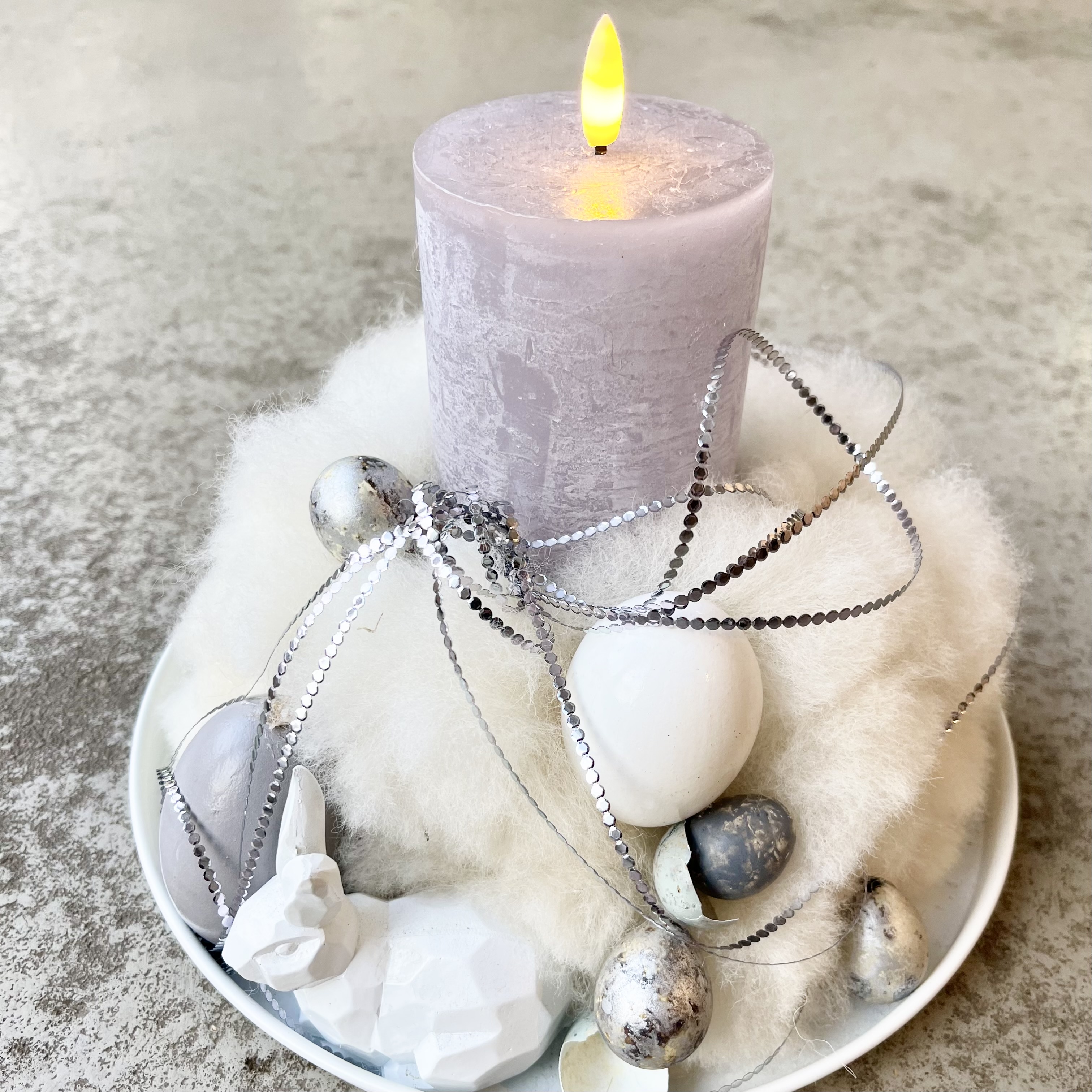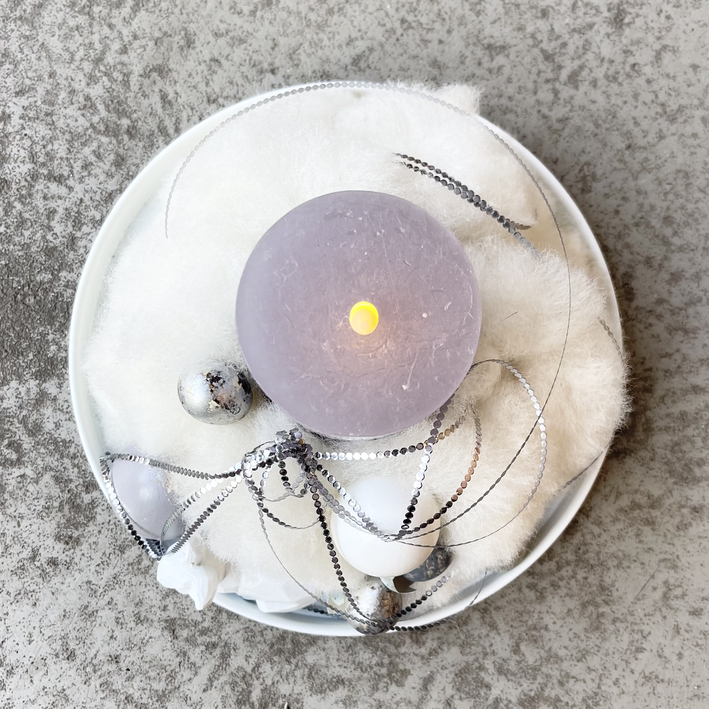 LED-Kerze in Grau mit Timerfunktion, Zierband in Silber auf Metalltablett 25cm in Weiß.