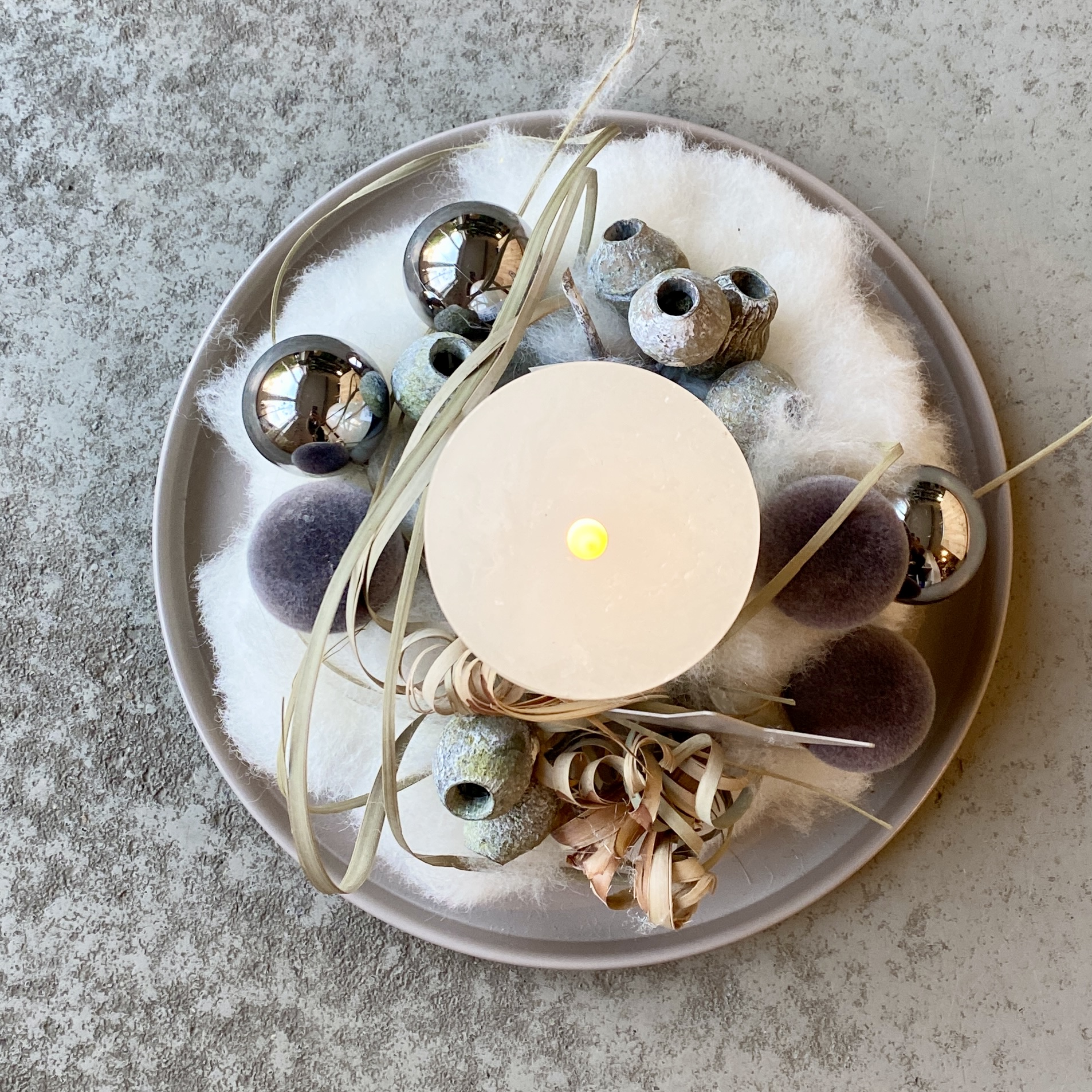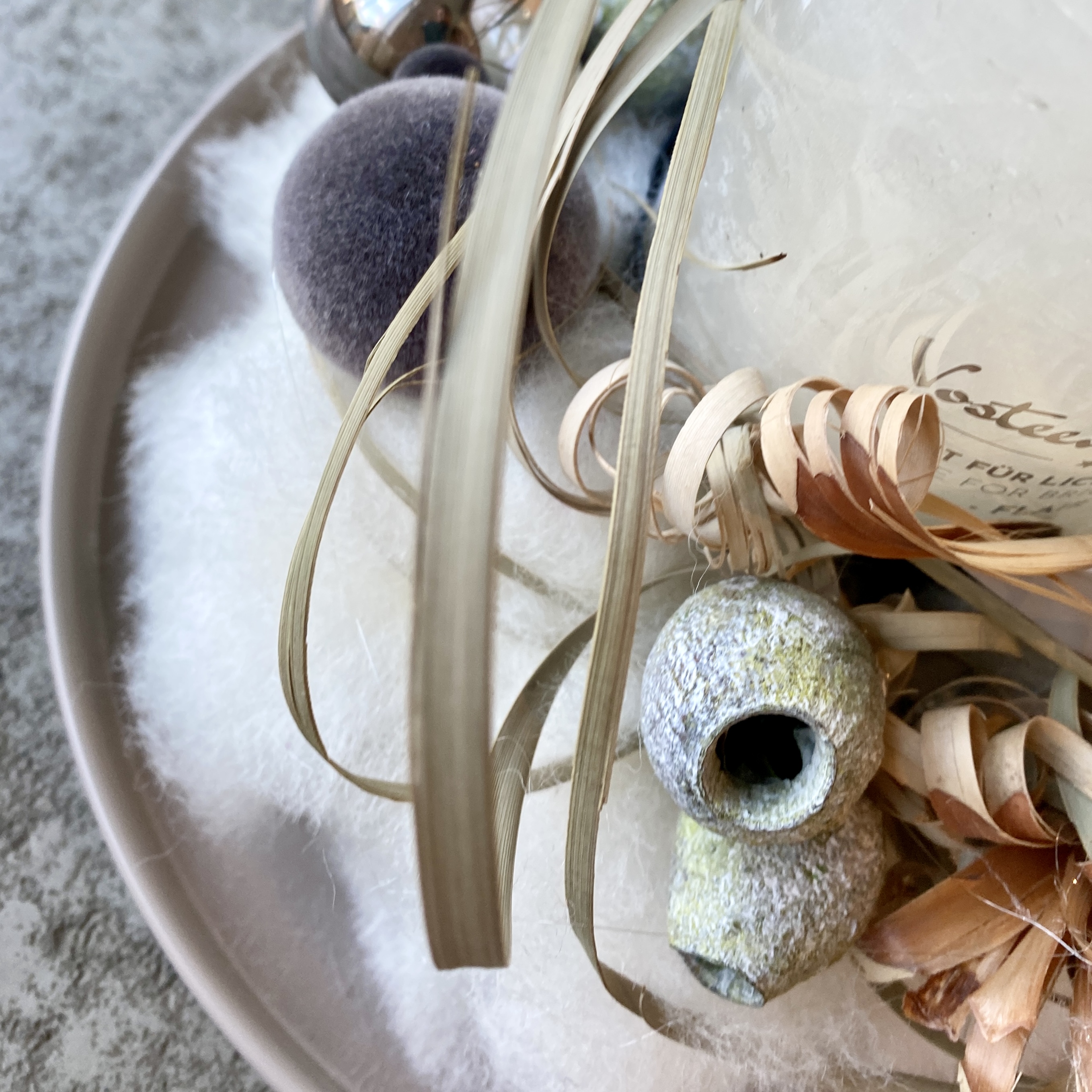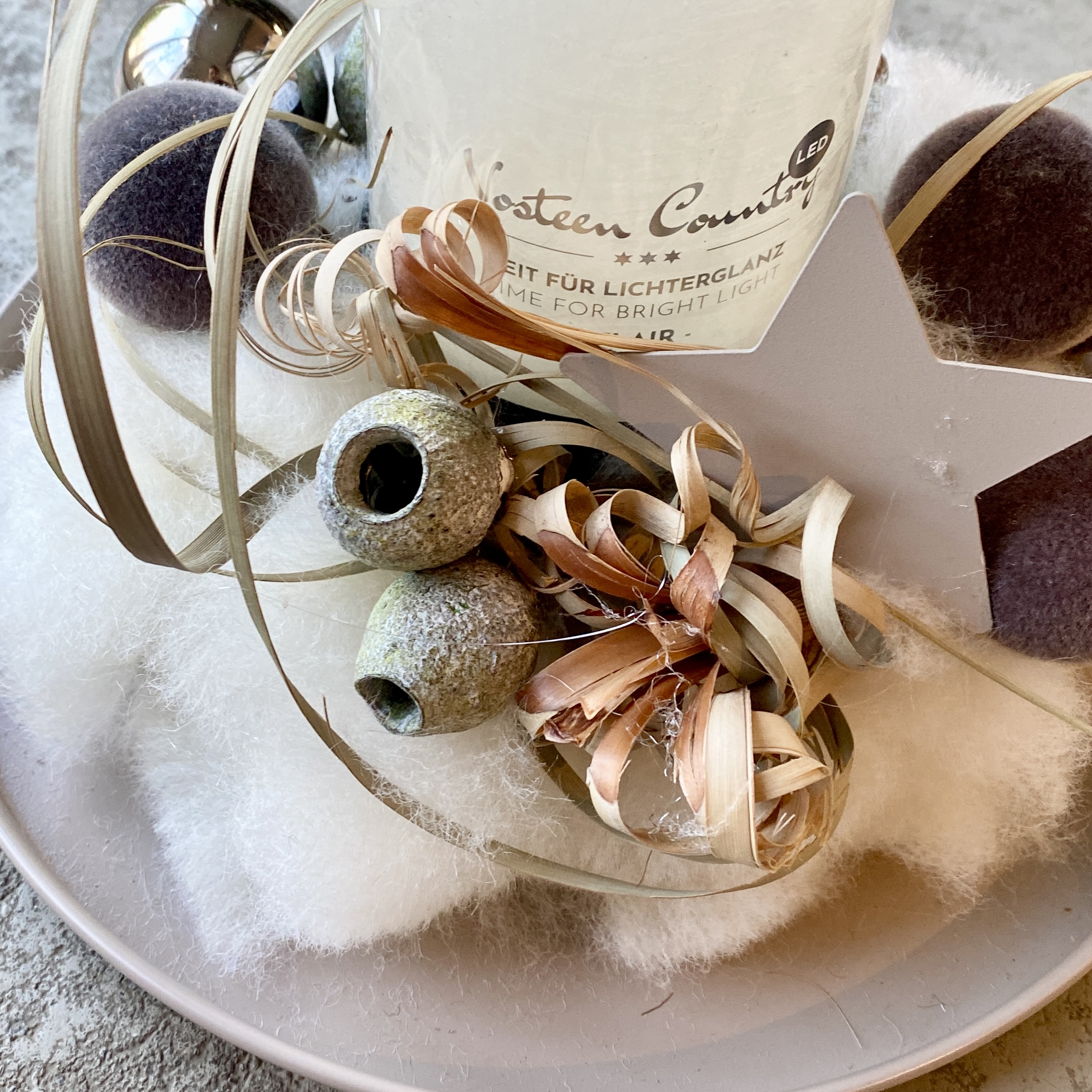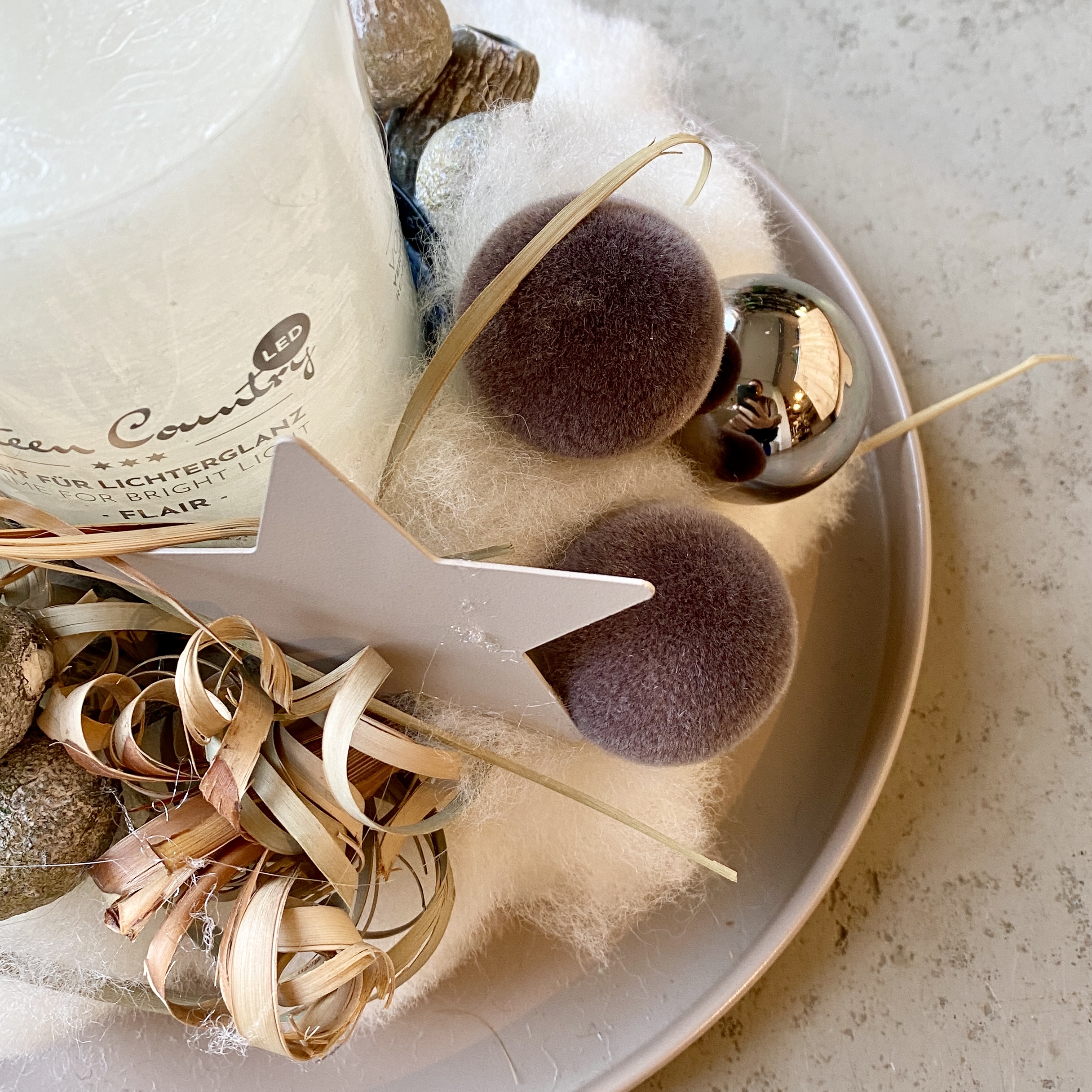 Gesteck aus gezupfter Lunte in Offwhite, verziert mit Glaskugeln in Gau und Tasko-Kugeln in Taupe, Gräsern, Kapseln und einem Metallstern in Grau, LED-Kerze in Weiß mit Timerfunktion, auf Metalltablett 26cm in Taupe.