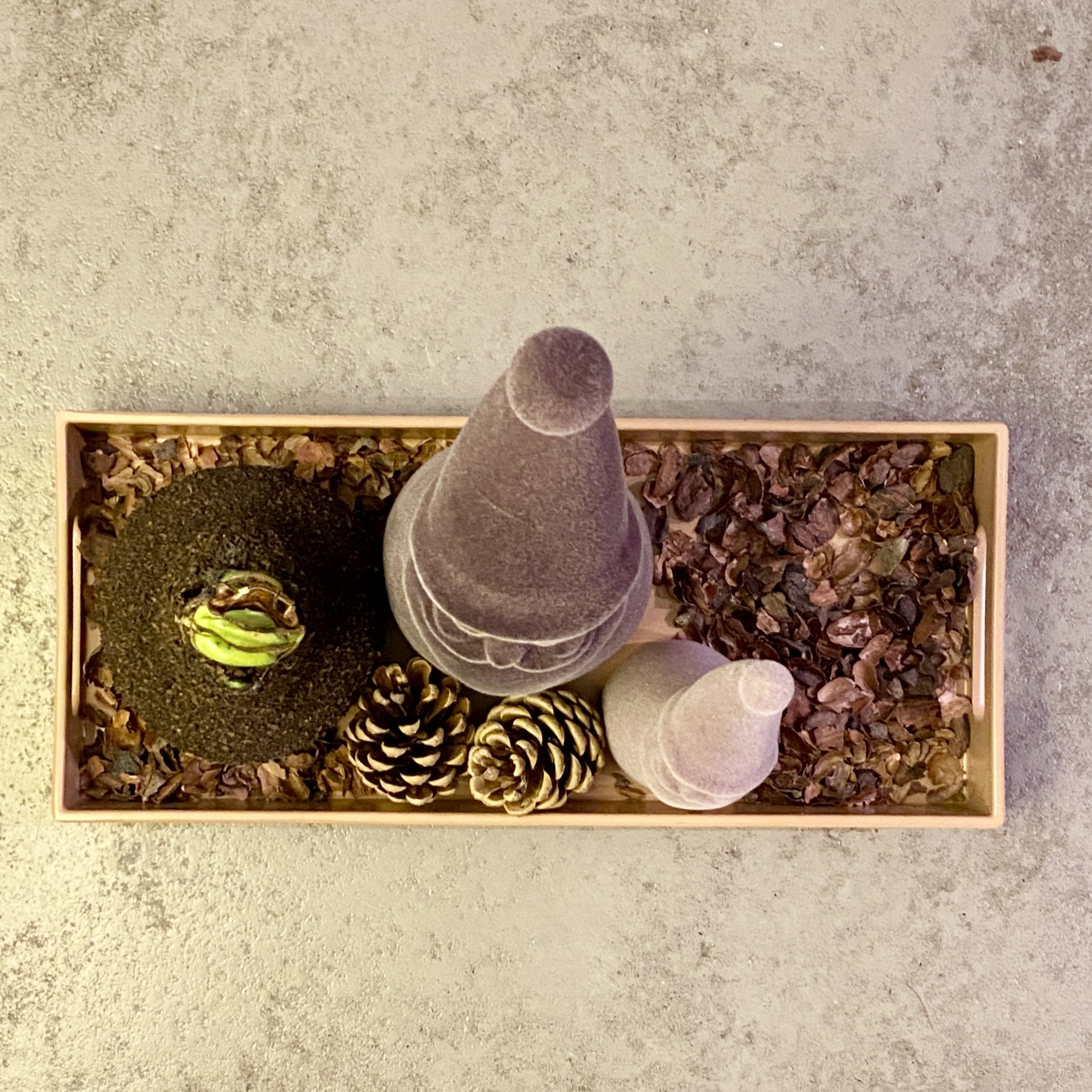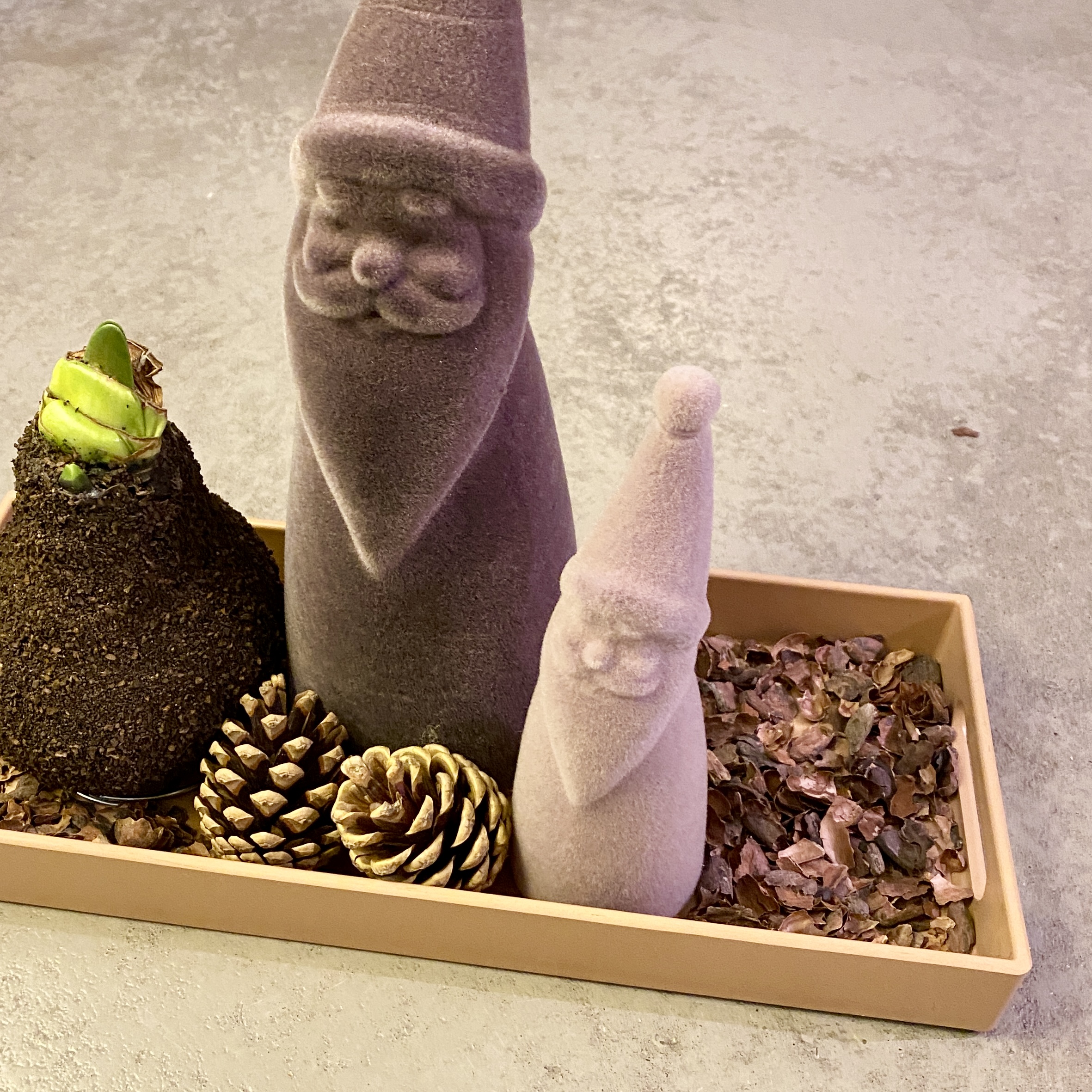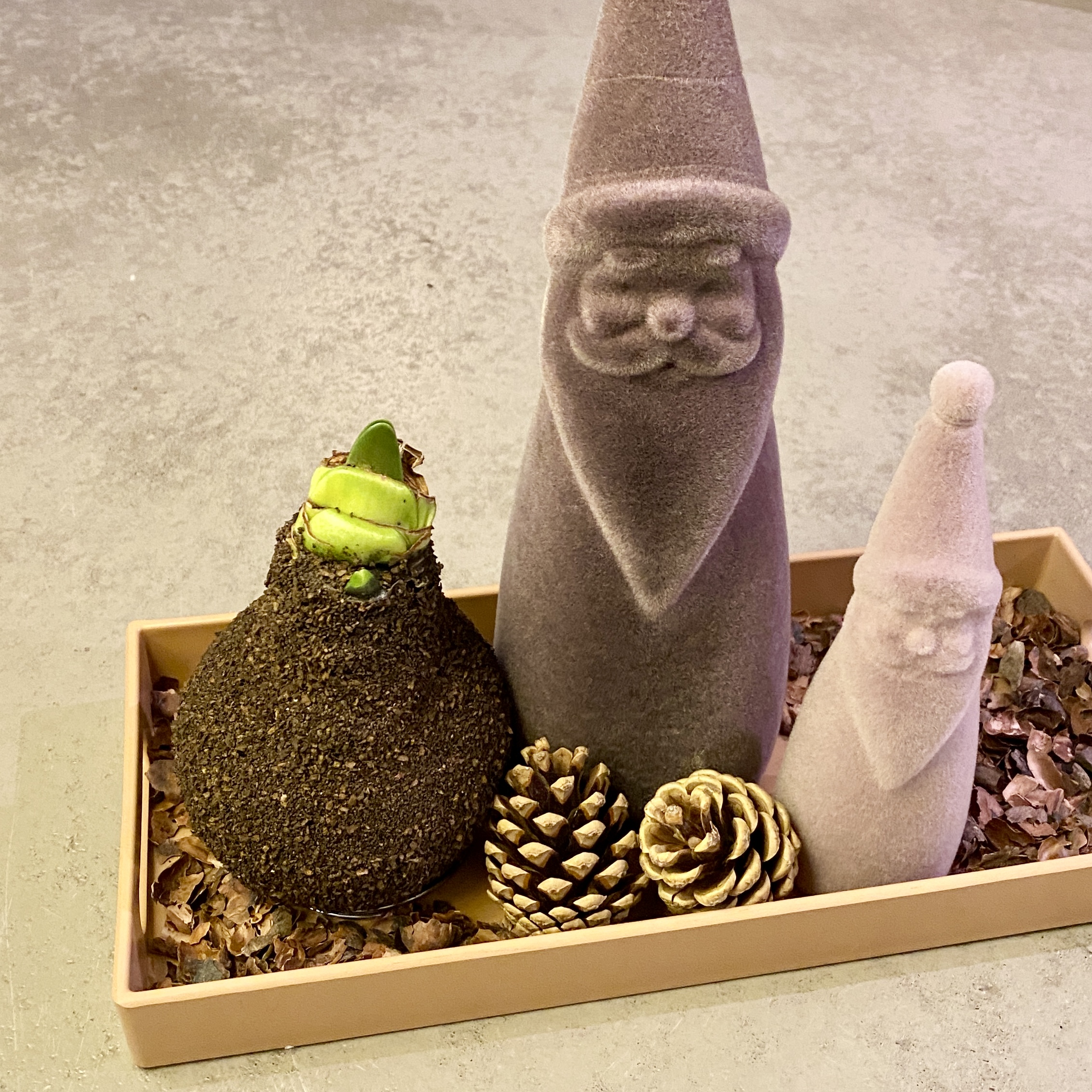 Kleiner Wintergruß aus einer echten Amaryllis (rot), einem großen Weihnachtsmann 30cm, einem kleinen Weihnachtsmann 18cm und verschiedenen Zapfen auf einem Tablett in Camel. Dieses Arrangement eignet sich hervorragend als Tisch Dekoration und als Geschenkidee.