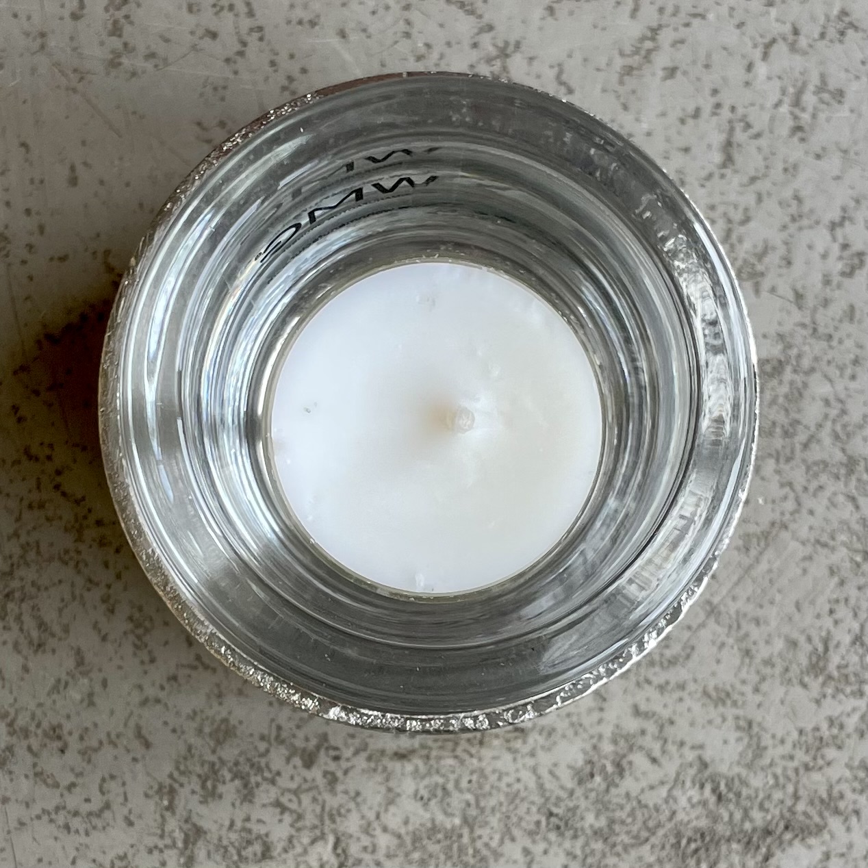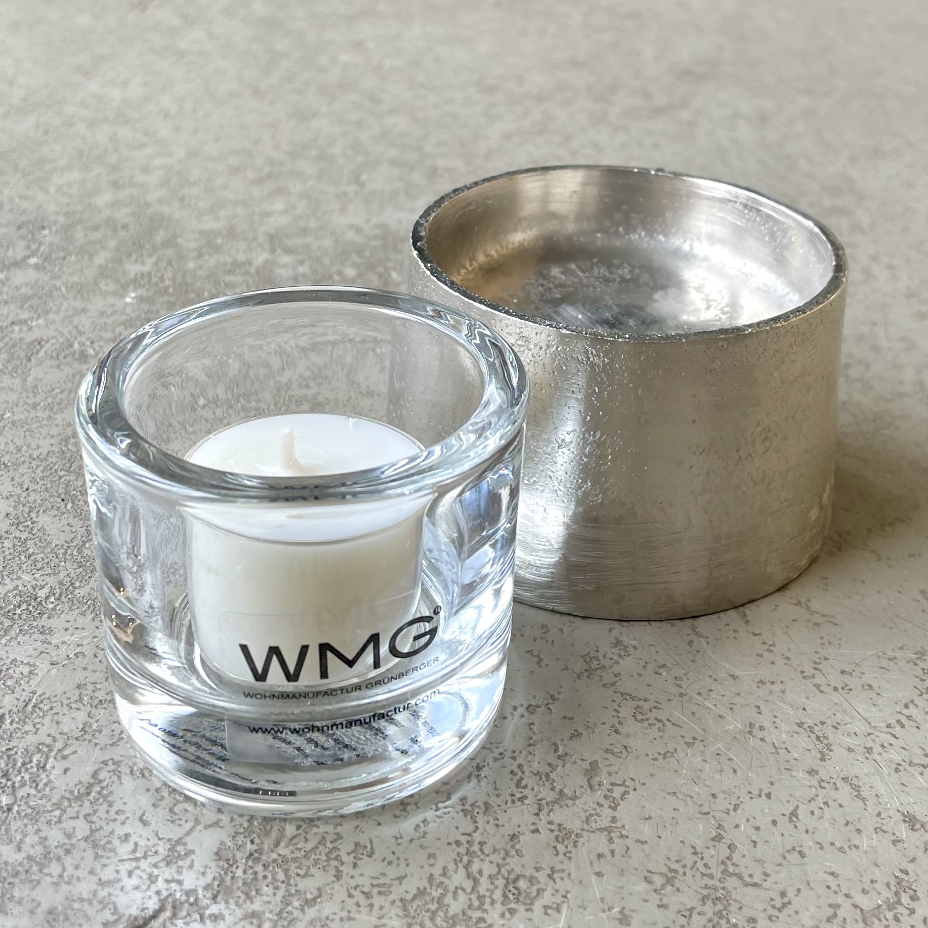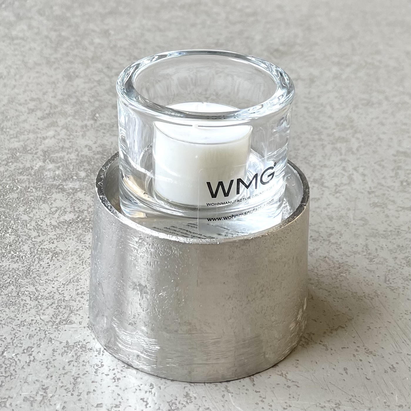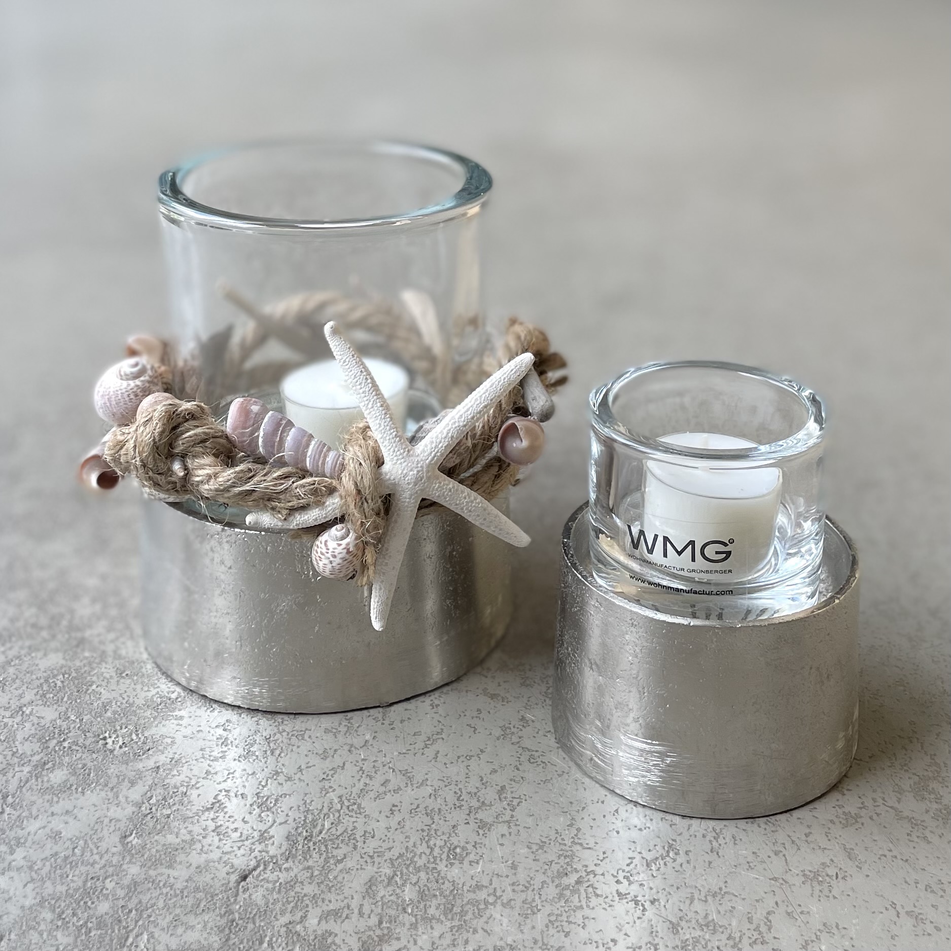 Kleines Windlicht auf Alucast-Kerzenhalter D8cm