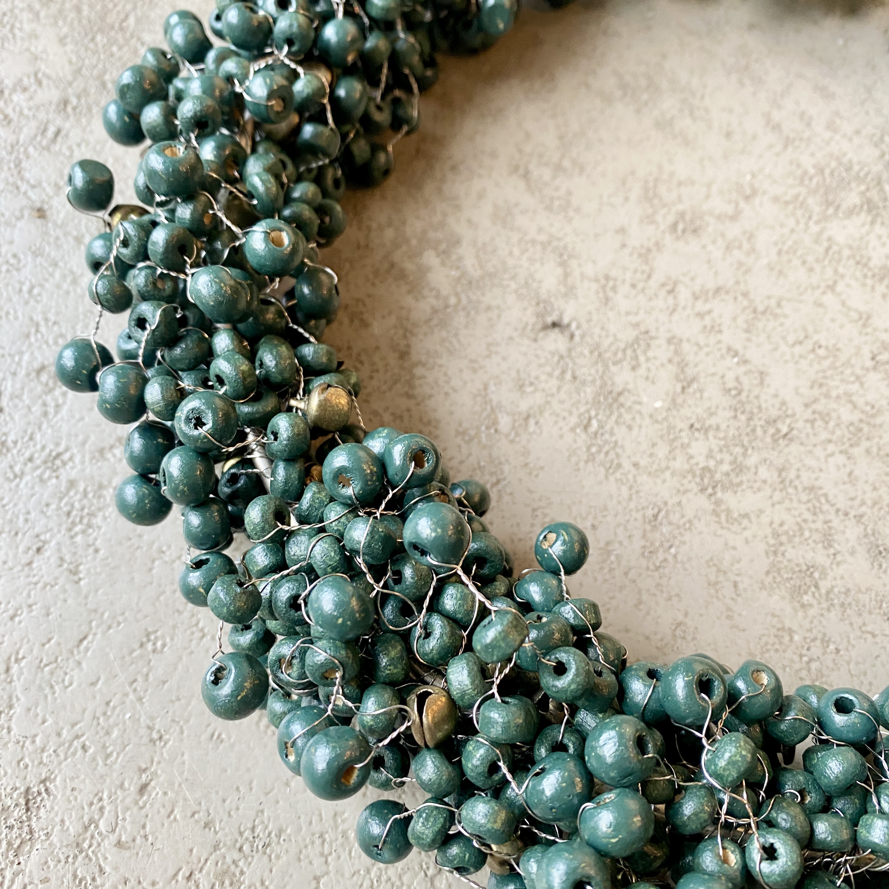 Kranz aus Holzperlen in Grün und kleinen messingfarbenen Glöckchen auf Drahtgeflecht mit Aufhängeschnur in Gold. Ein wunderschöner Kranz der ganzjährig zum Einsatz kommen kann.