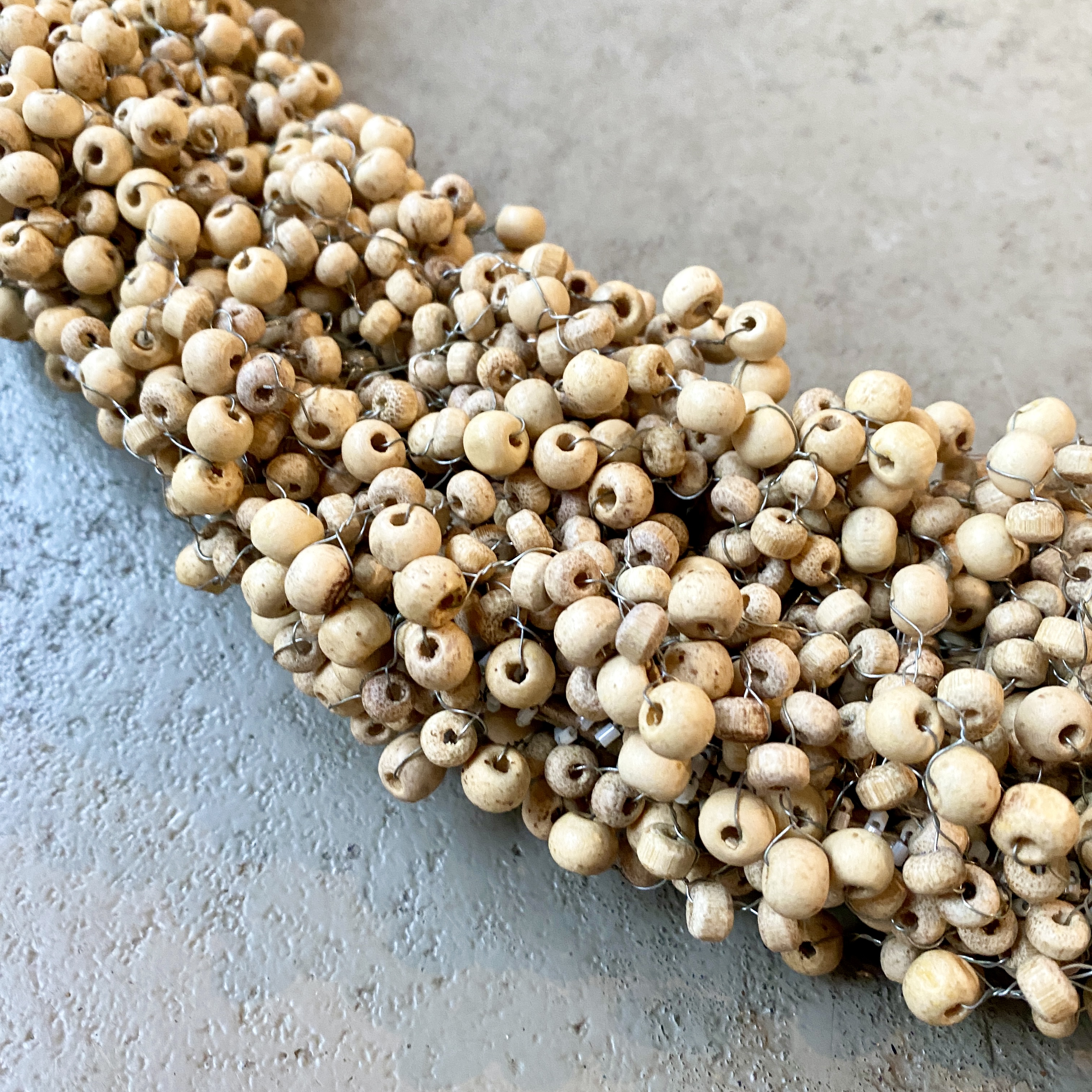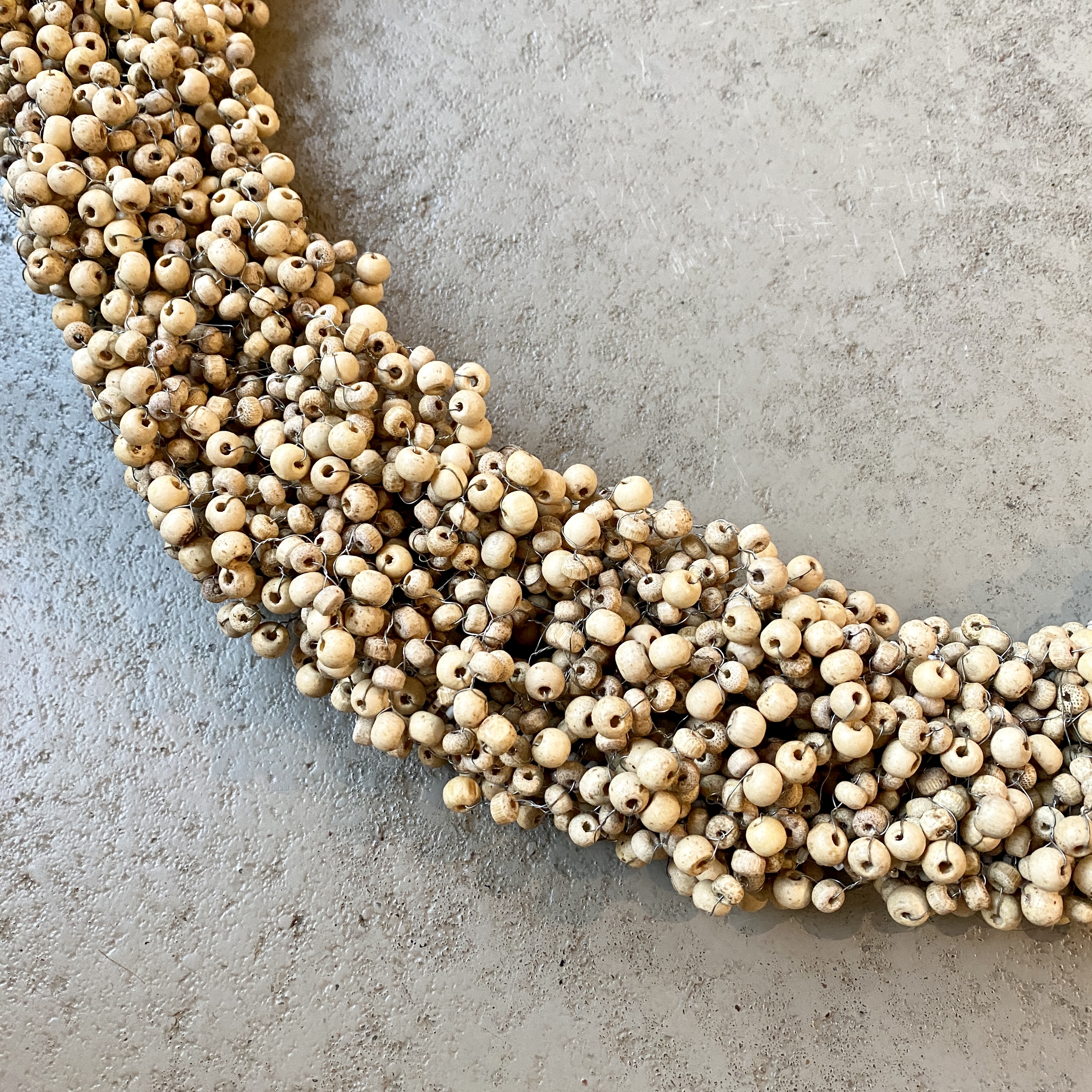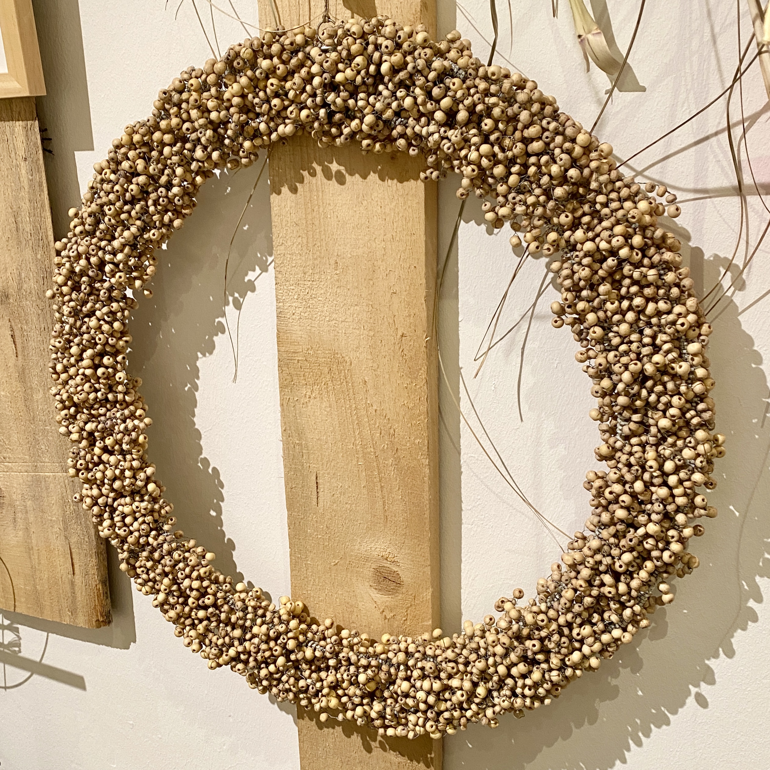 Großer Kranz aus Holzperlen in Beige auf Drahtgeflecht mit Aufhängeschnur. Ein wunderschöner Kranz der ganzjährig zum Einsatz kommen kann.