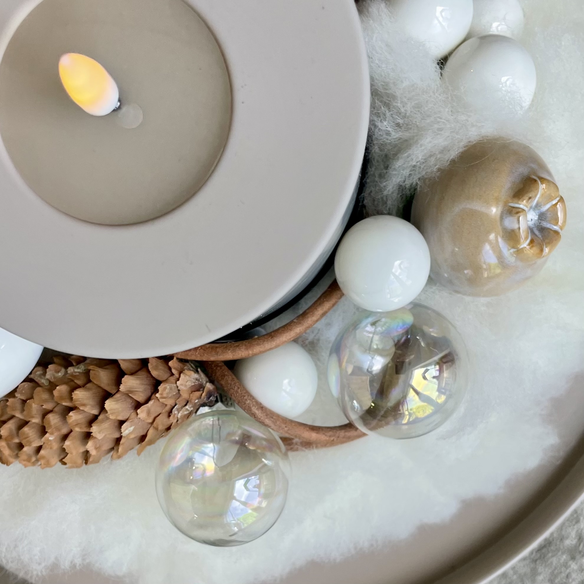 Natürliche und friedvolle Stimmung! Metalltablett, Woll-Kranz, drei Mohnkapseln aus Keramik, diverse Kugeln,