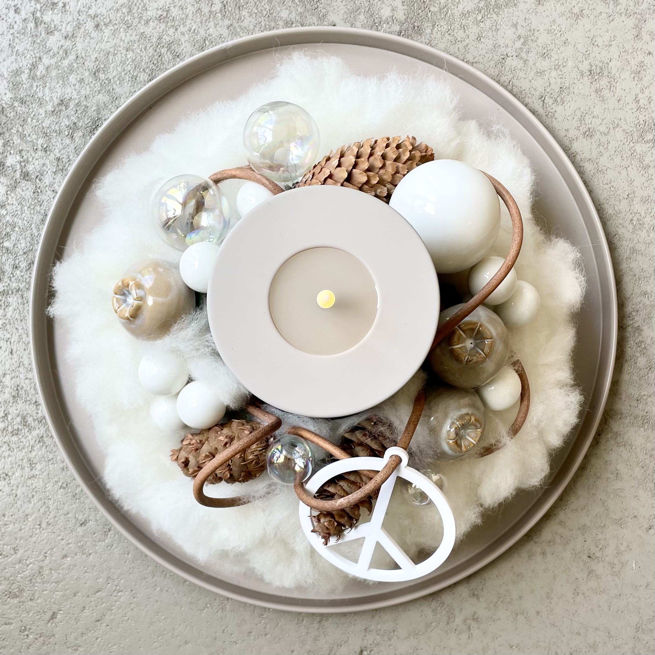 Kranz "PEACE-Zeichen" auf Metalltablett mit LED-Kerze, taupe/weiß/natur