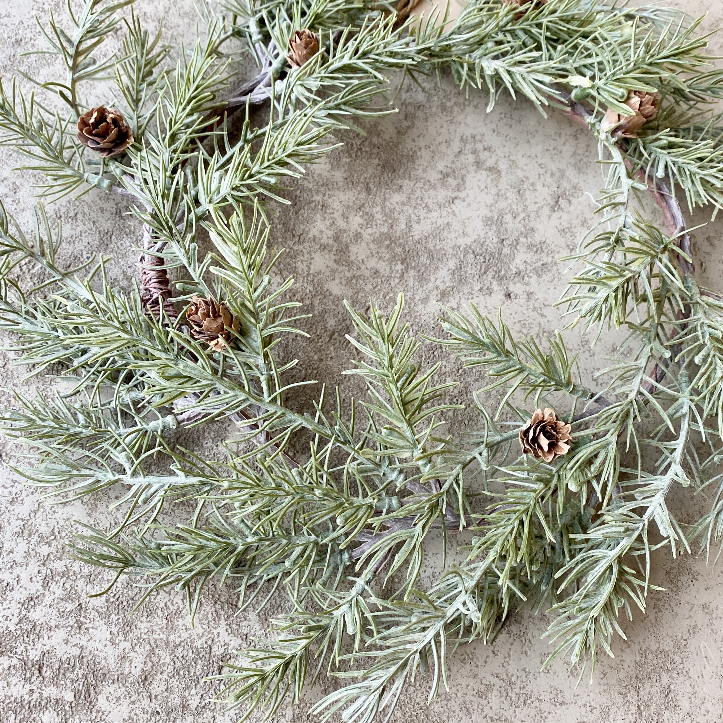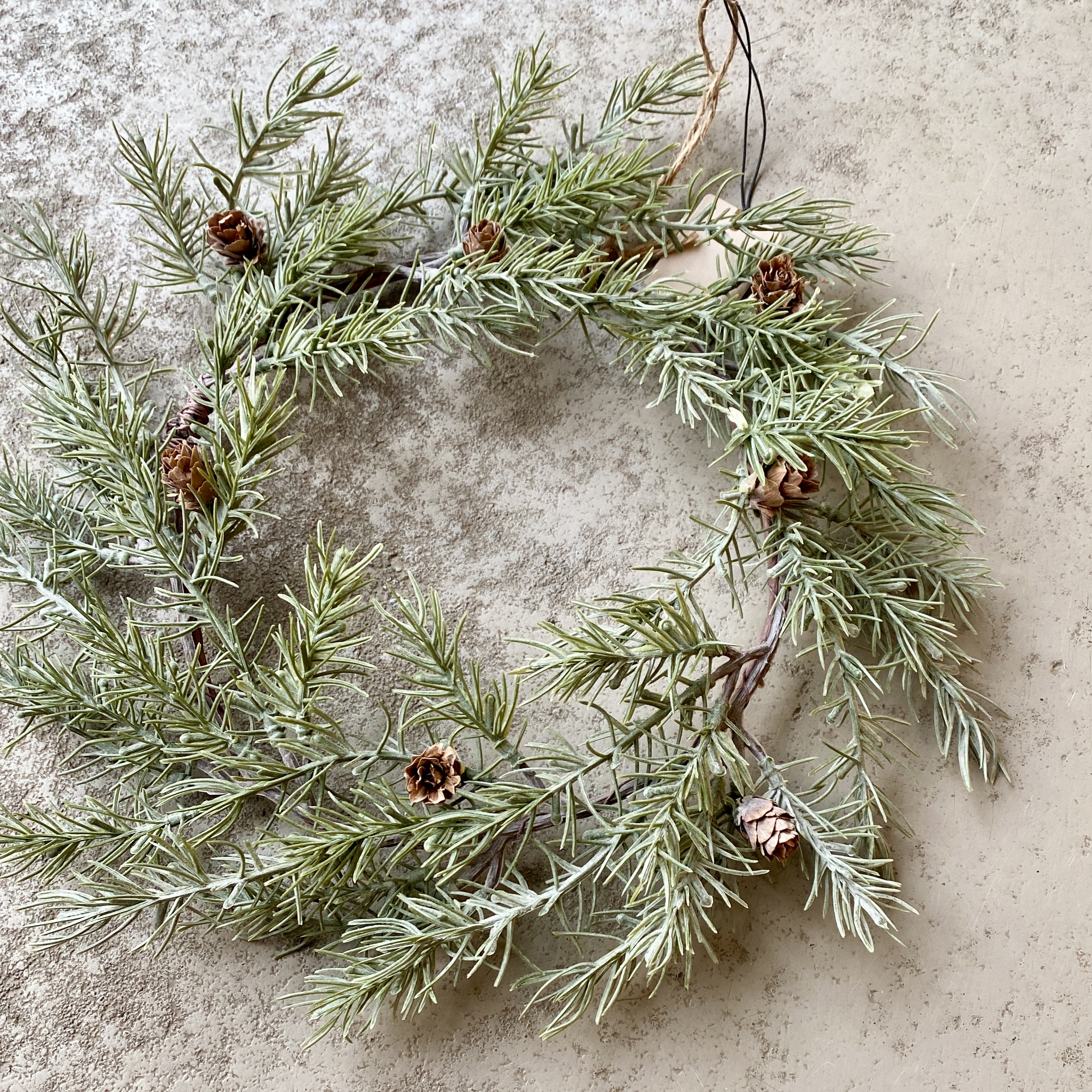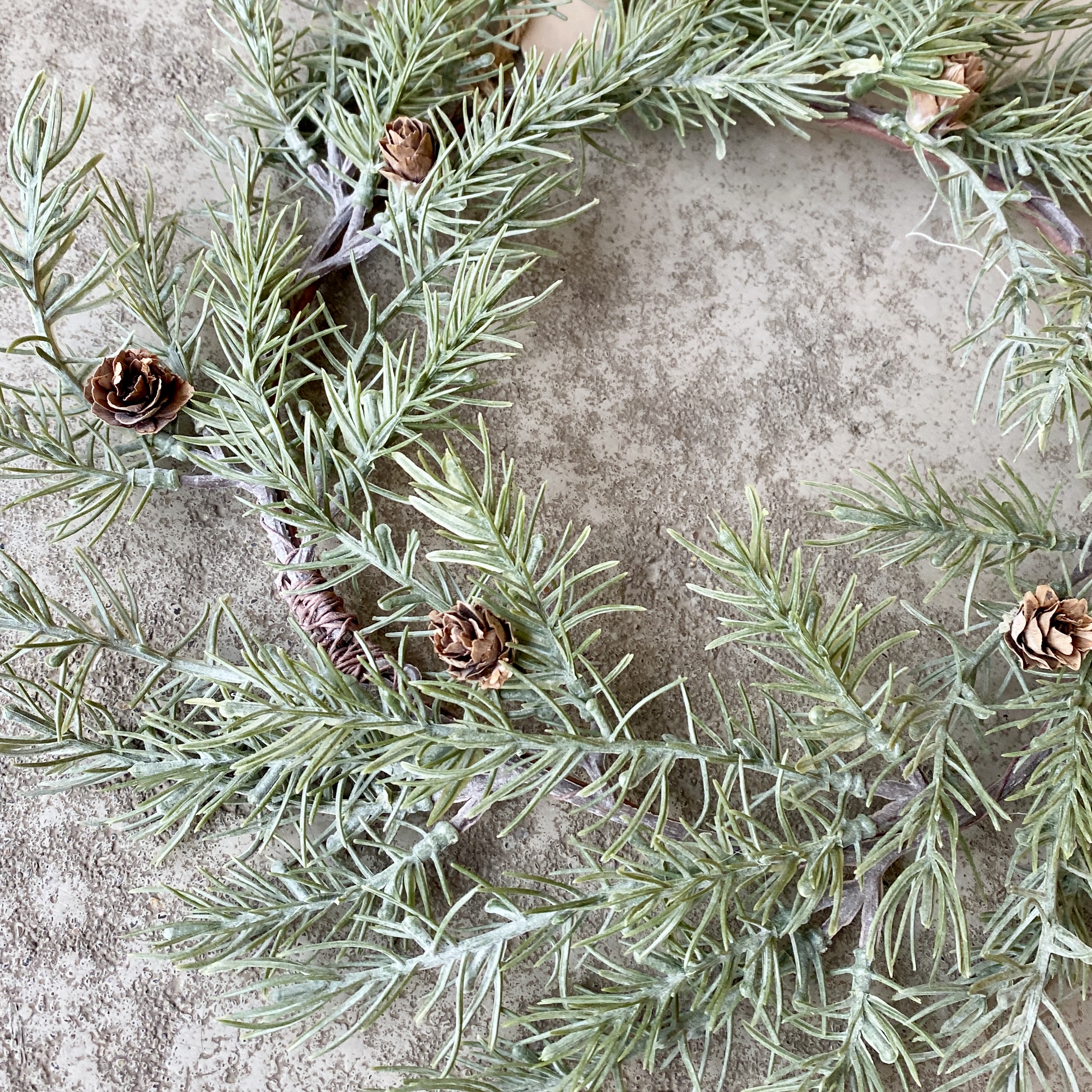 Künstlicher Zypressenkranz mit kleinen Zapfen. Der Kranz kann liegen, aber auch hängend verwendet werden. Da der Kranz aus Kunststoff besteht, ist er langlebig und nachhaltig.