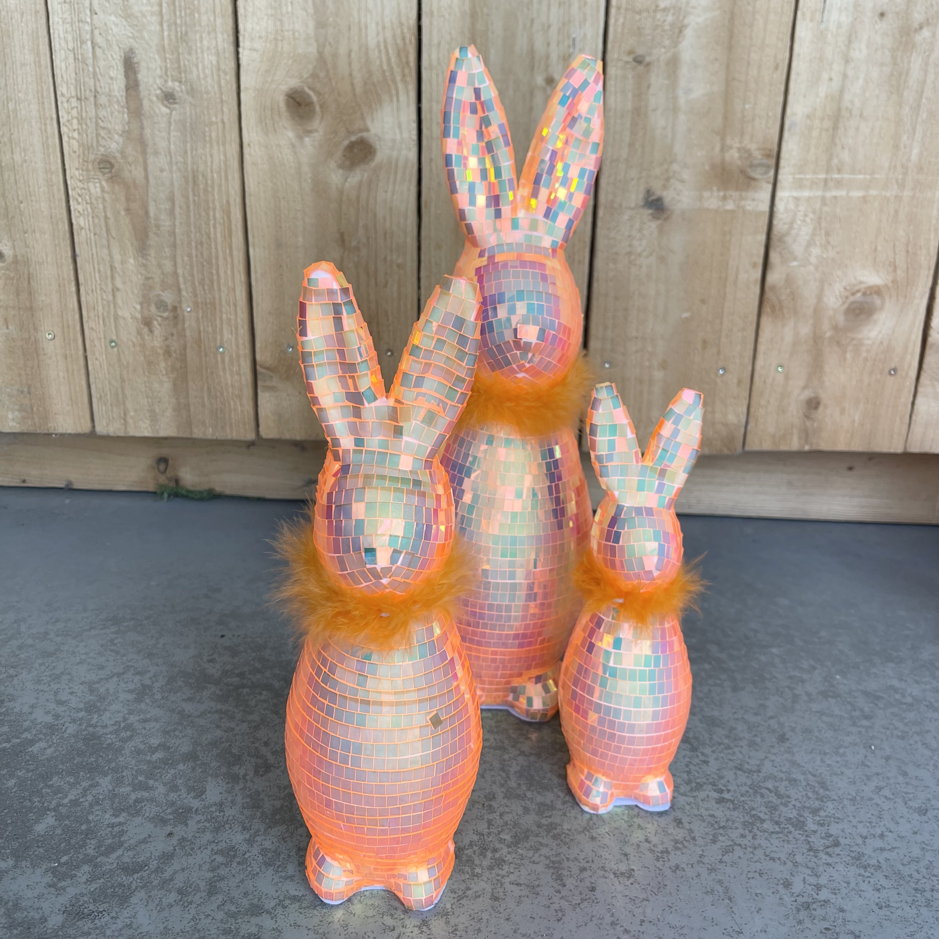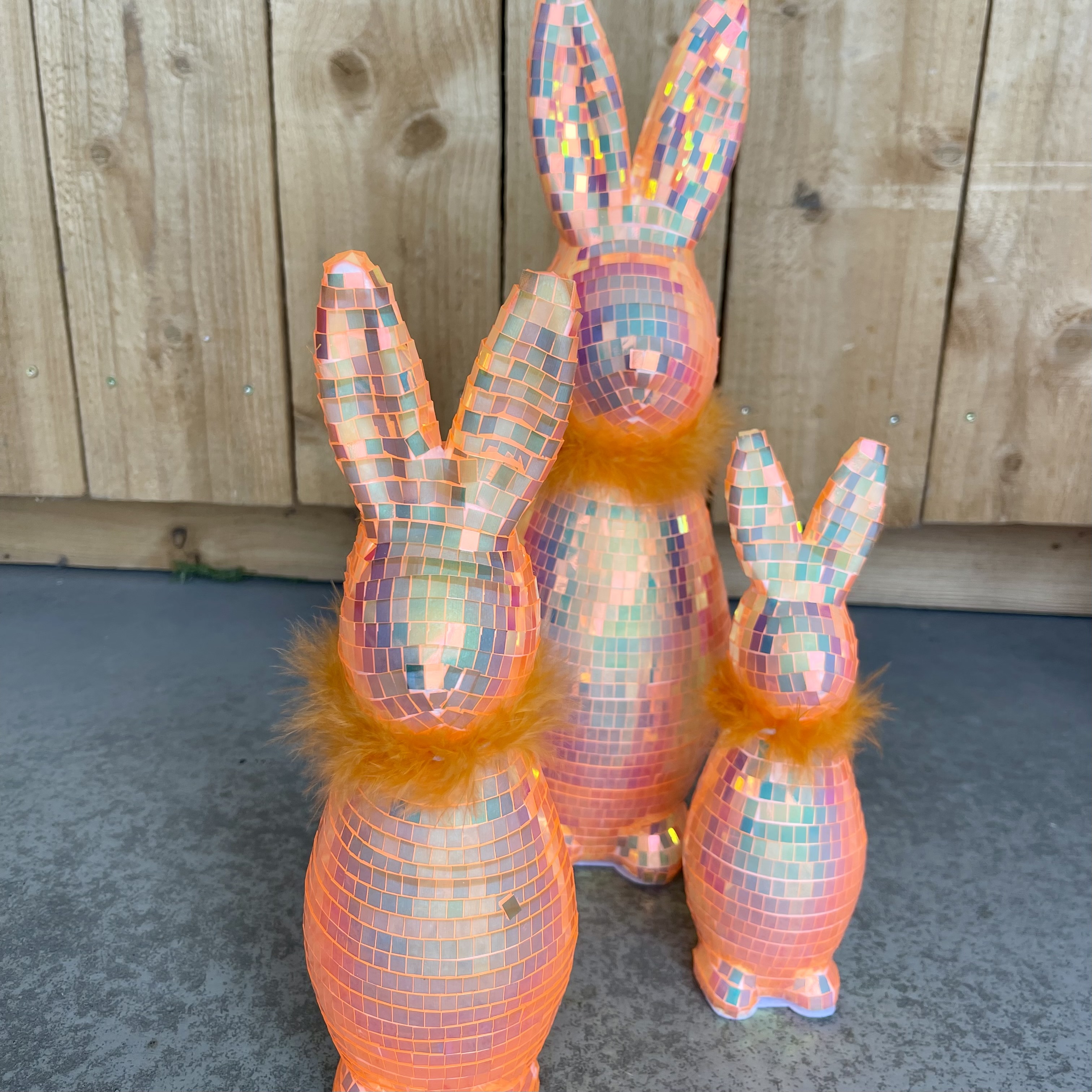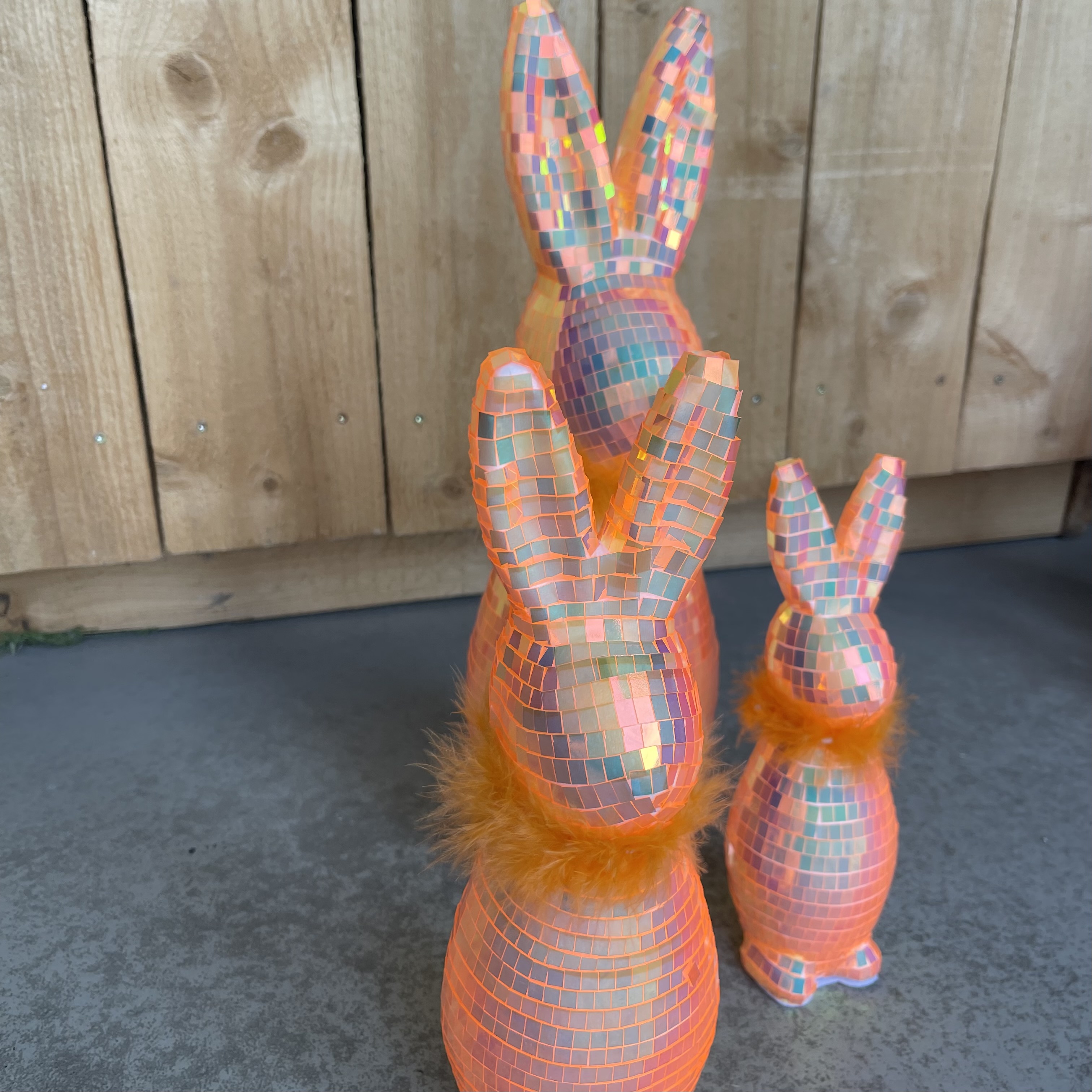 Mega cooler neuer Hase im Dubai Disco Feeling. Kleine irisierende, viereckige Klebepartikel überziehen den Styropor Körper, er ist leicht und am Hals fedrig mit Schal. Ersatz-Klebestücke als Streifen liegen der Verpackung bei. Für mich ein absolutes must have und Highlight, damit glänzt du, nicht nur der Hase (-,